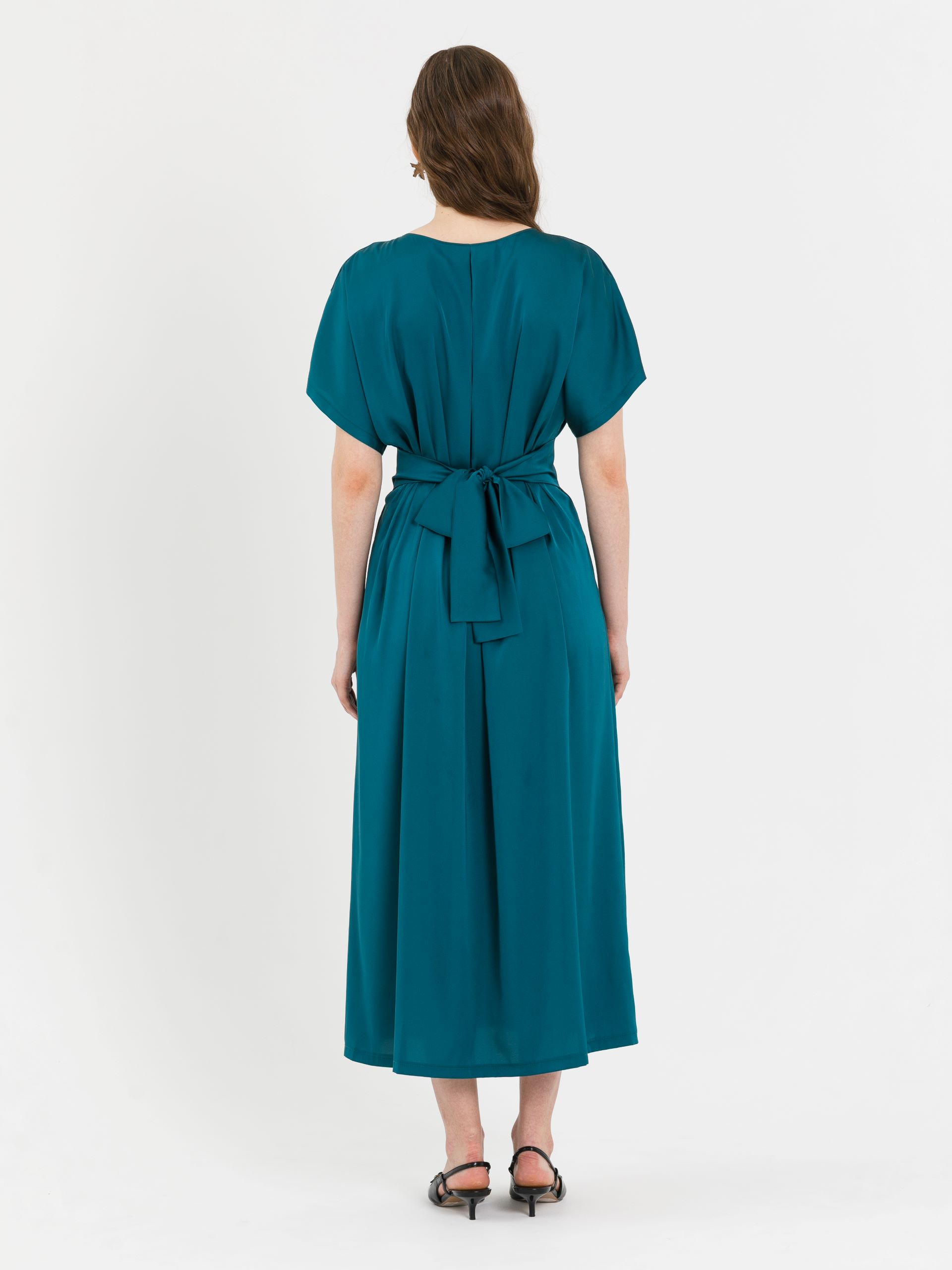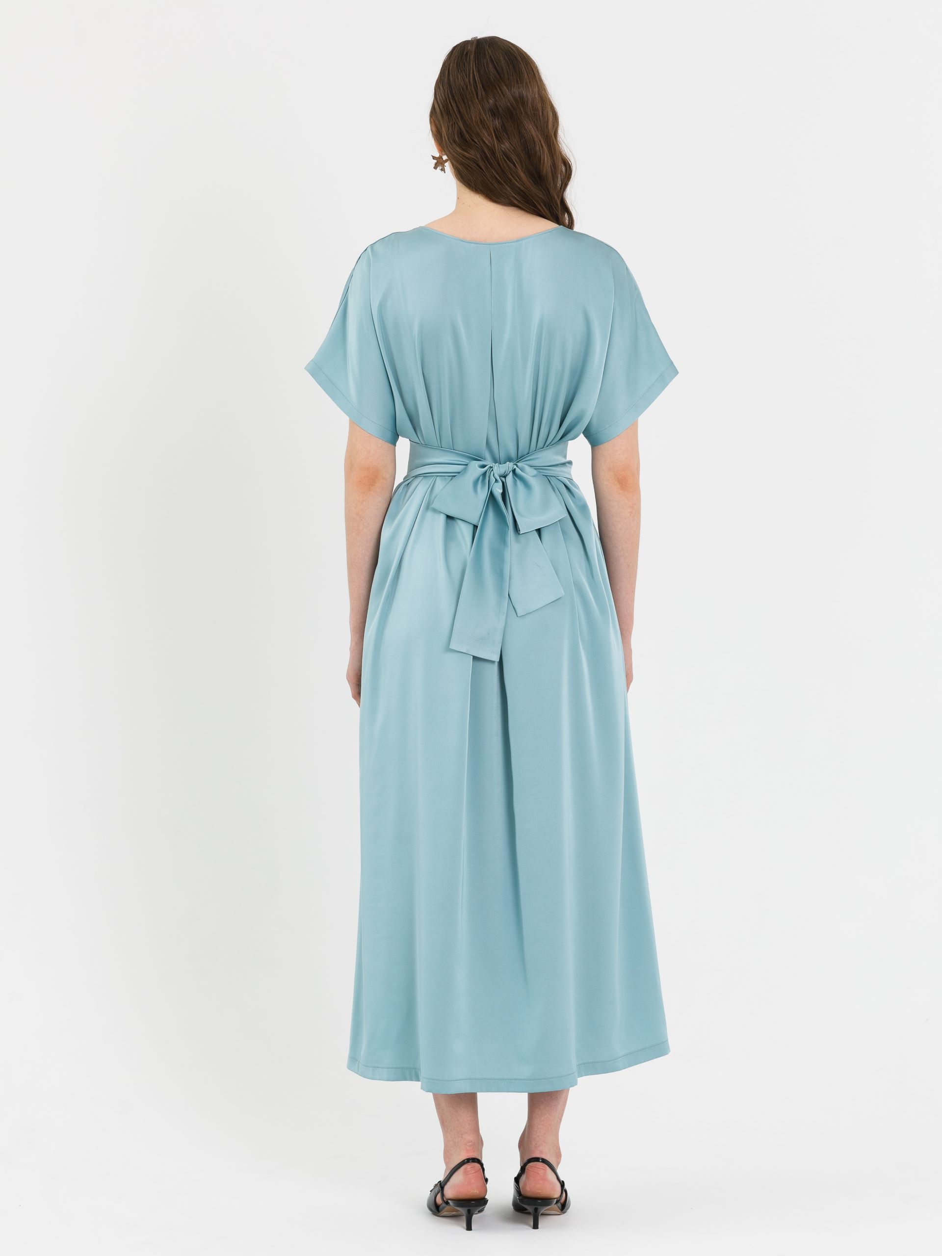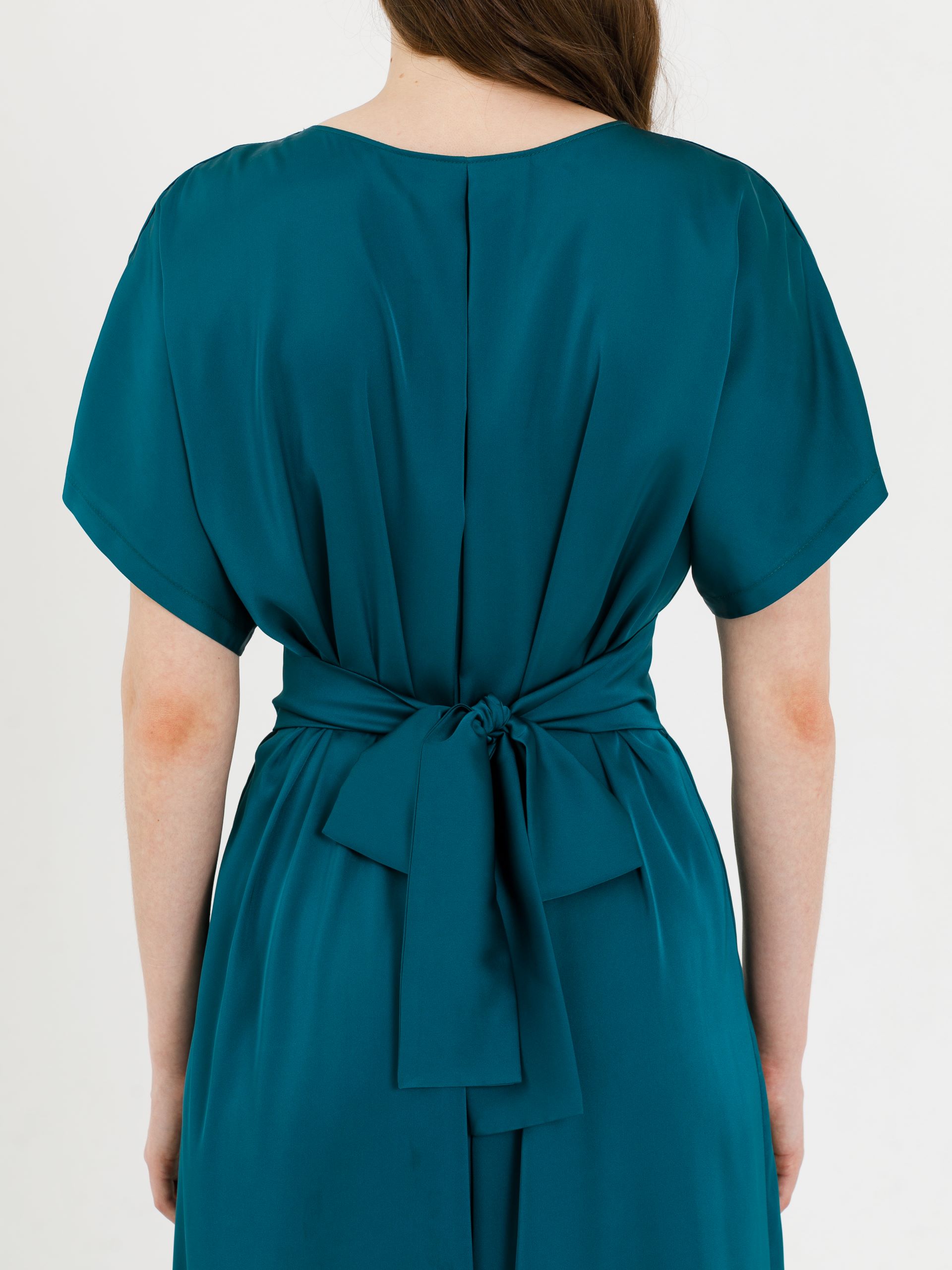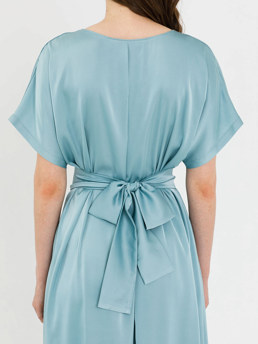 Перед с отрезной линией талии, со сборкой и втачным поясом, который сзади завязывается на бант. Рукав цельнокроеный. Горловина окантована. Сзади по горловине заложена складка.
