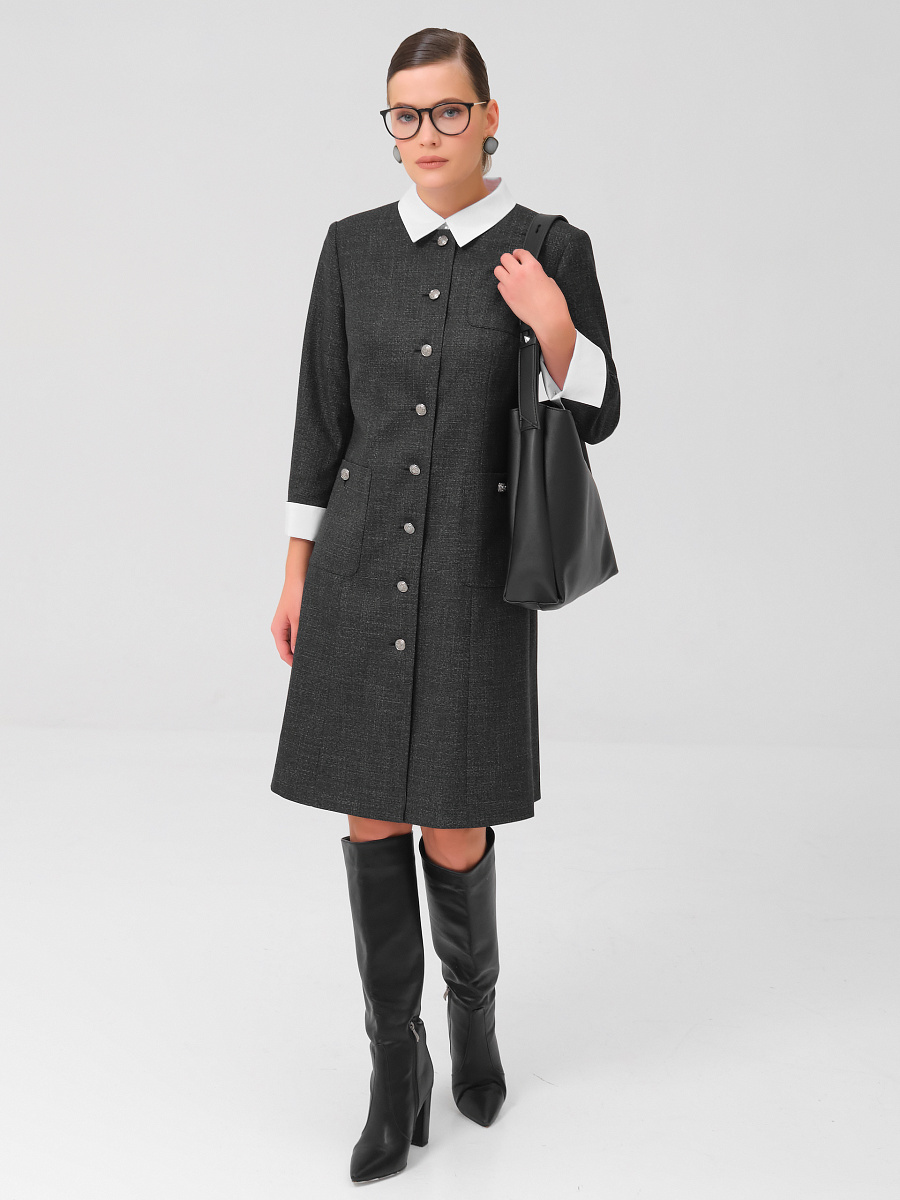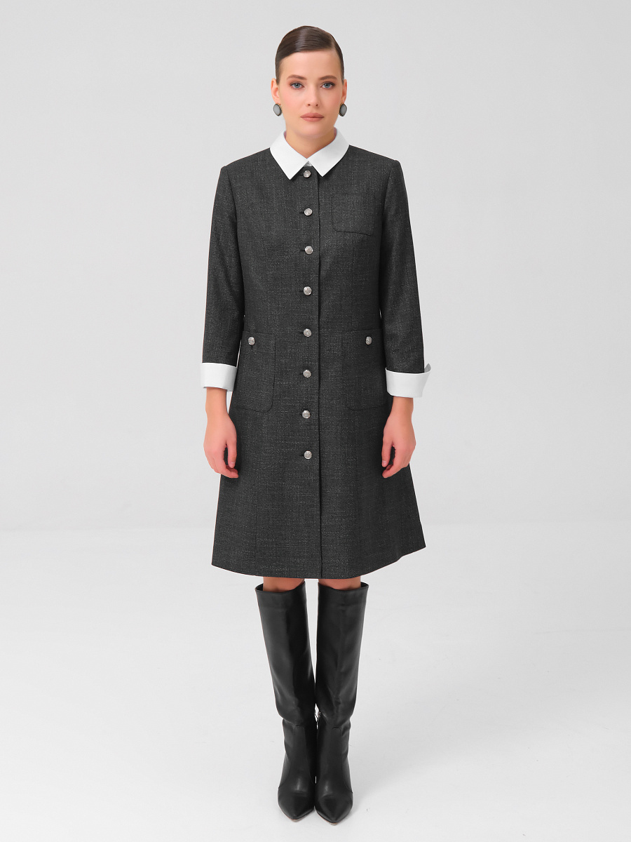 Модель полуприлегающего силуэта, на подкладе, с центральной застёжкой на петли и пуговицы. Воротник и манжеты выполнены из отделочной ткани. Перед с рельефами. В нижних частях переда и в верхней левой части расположены накладные карманы закругленной формы. Нижние карманы застегиваются на петлю и пуговицу. Спинка со средним швом и рельефами. Горловина округлой формы. Рукава длиной 3/4. Платье с плечевыми накладками.