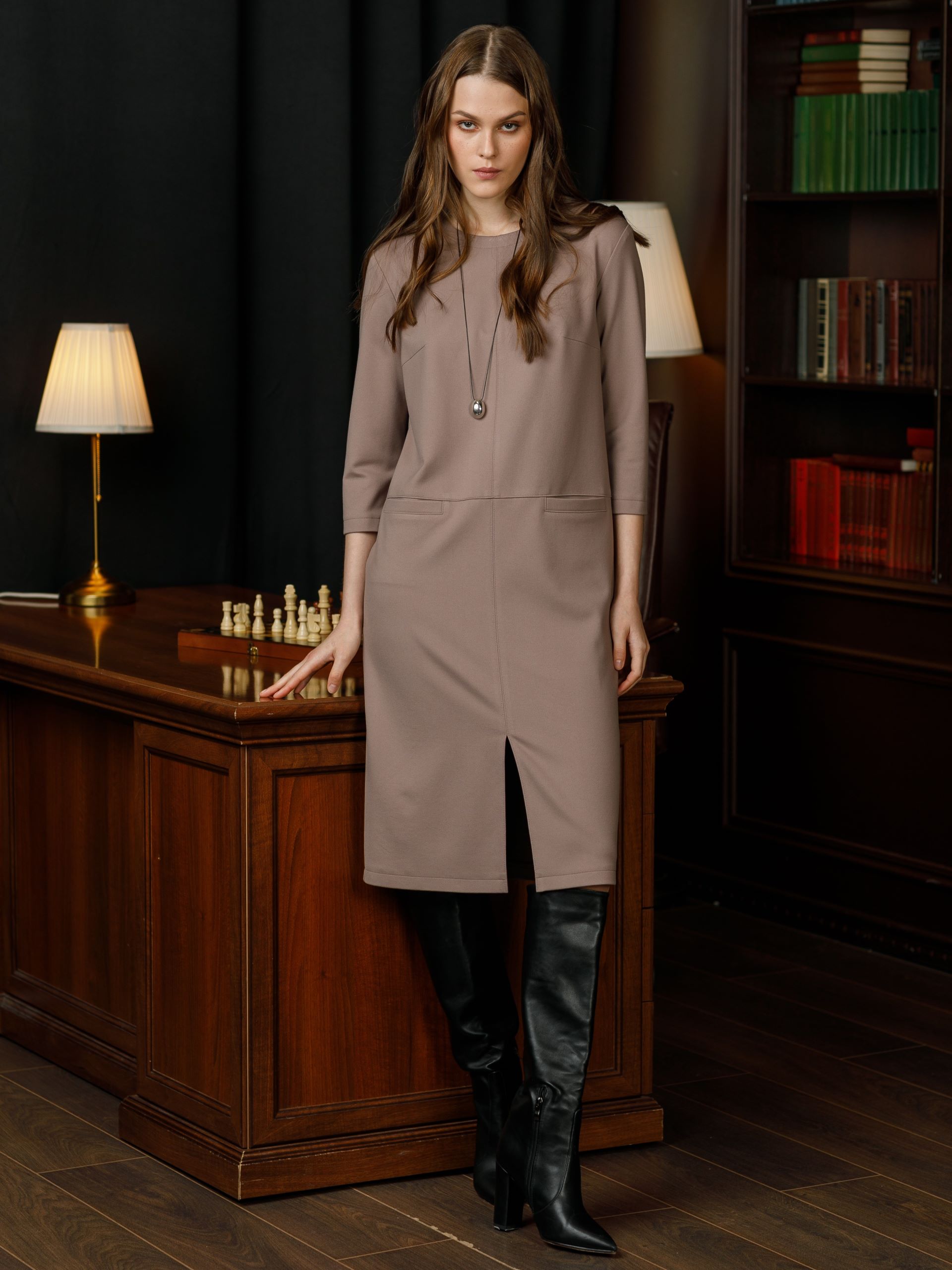 Модель прямого силуэта, со спущенным плечом. Перед с горизонтальным подрезом ниже линии талии. под подрезом прорезные карманы с листочкой. Средний шов переда снизу заканчивается разрезом. В среднем шве спинки обработаны потайная застёжка молния и разрез.