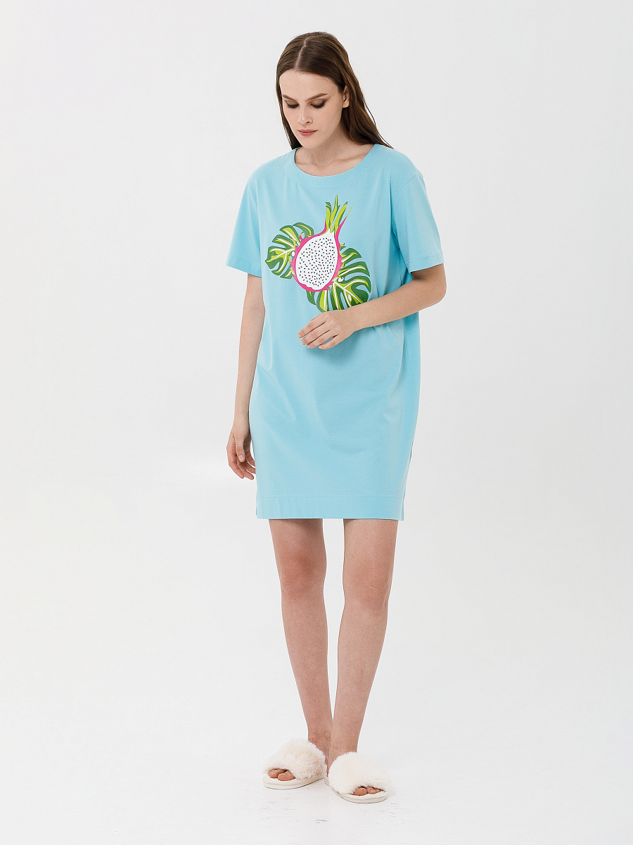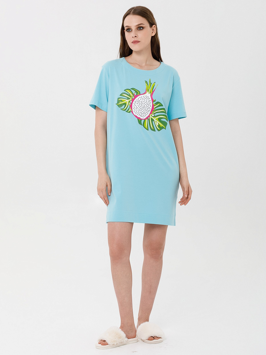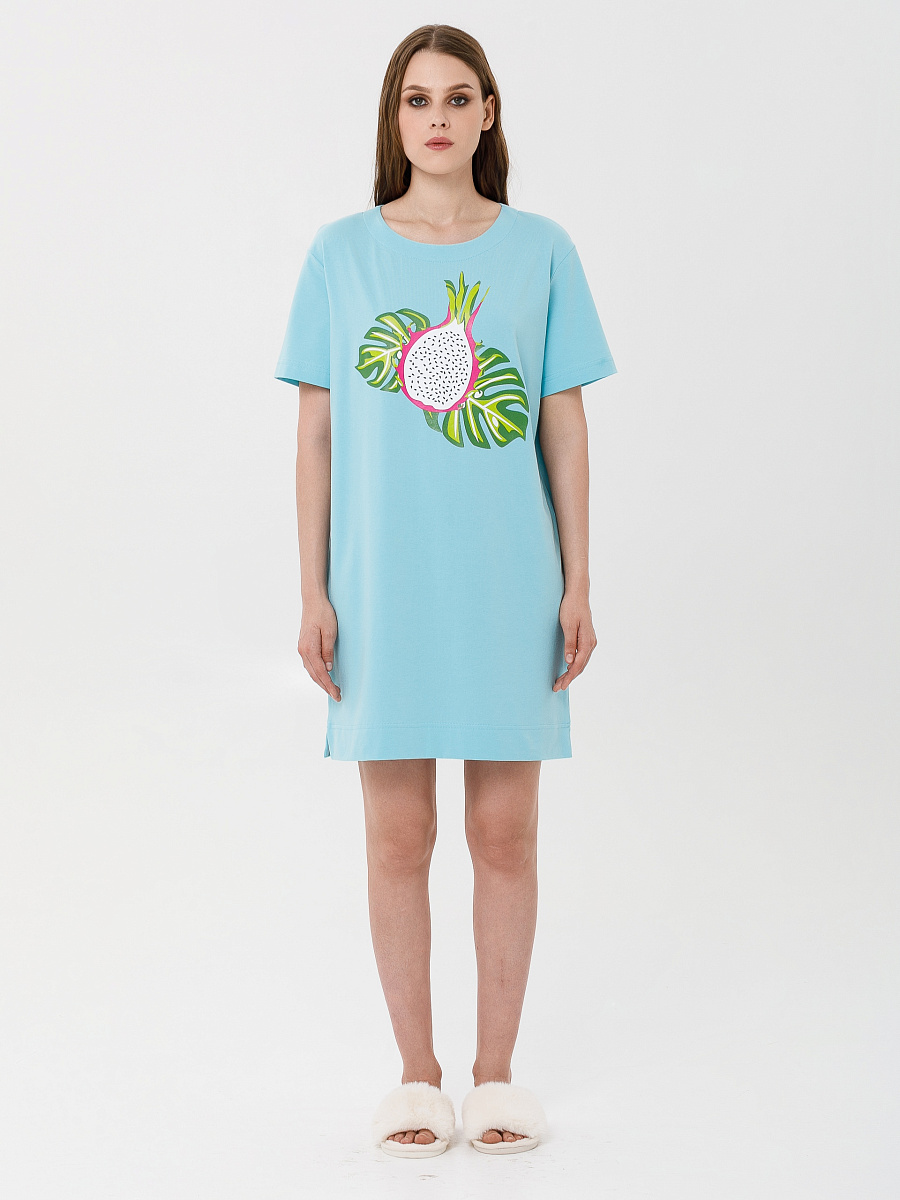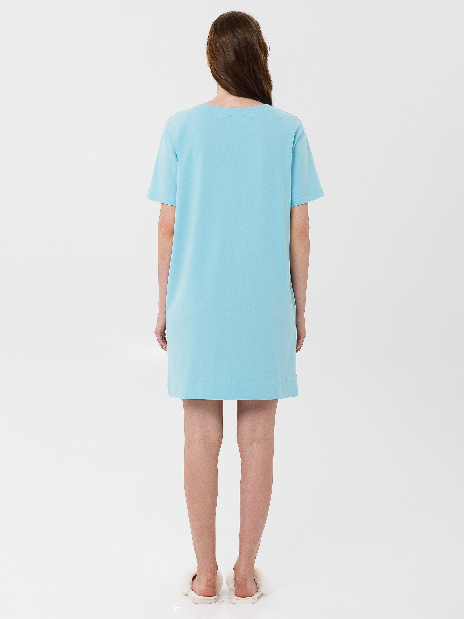 Модель прямого силуэта, со спущенным плечом и коротким рукавом. В боковых швах небольшие разрезы.