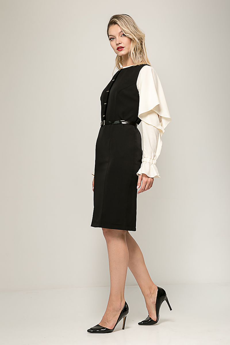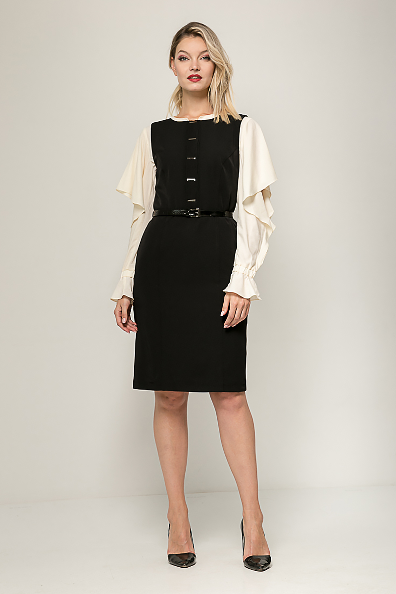 Платье полуприлегающего силуэта, без рукавов.. Лиф модели декорирован по центру настроченной группой отделочных полос с необработанными краями и закрепленными металлическим декором. Горловина округлой формы, слегка углубленная. Сзади для удобства ходьбы выполнена шлица. Застежка на потайную молнию в среднем шве спинки. Модель комплектуется ремнем.