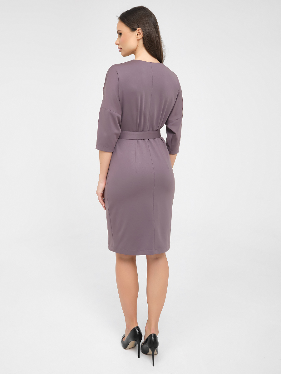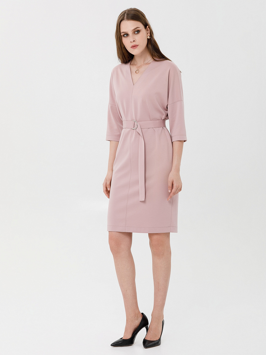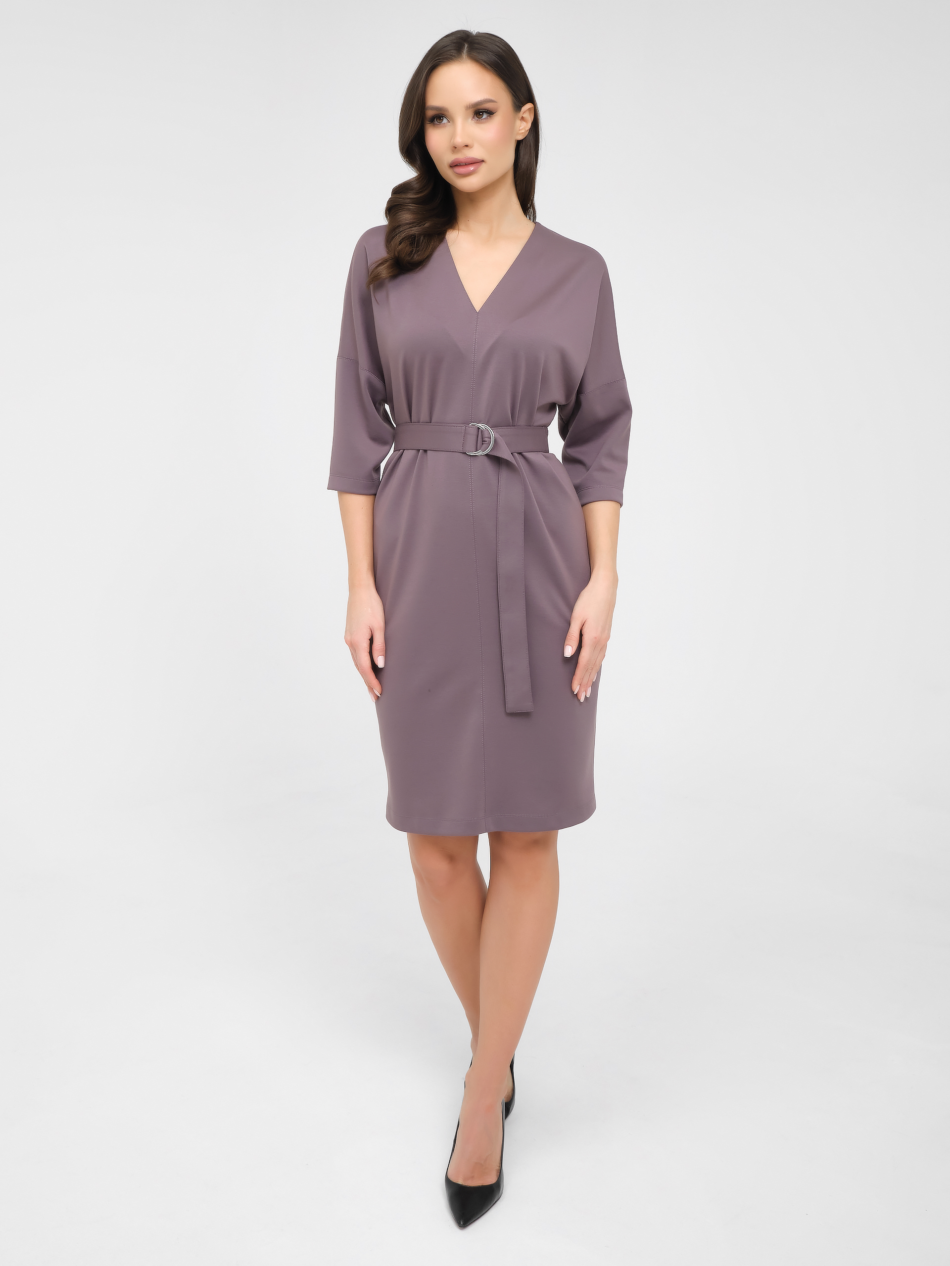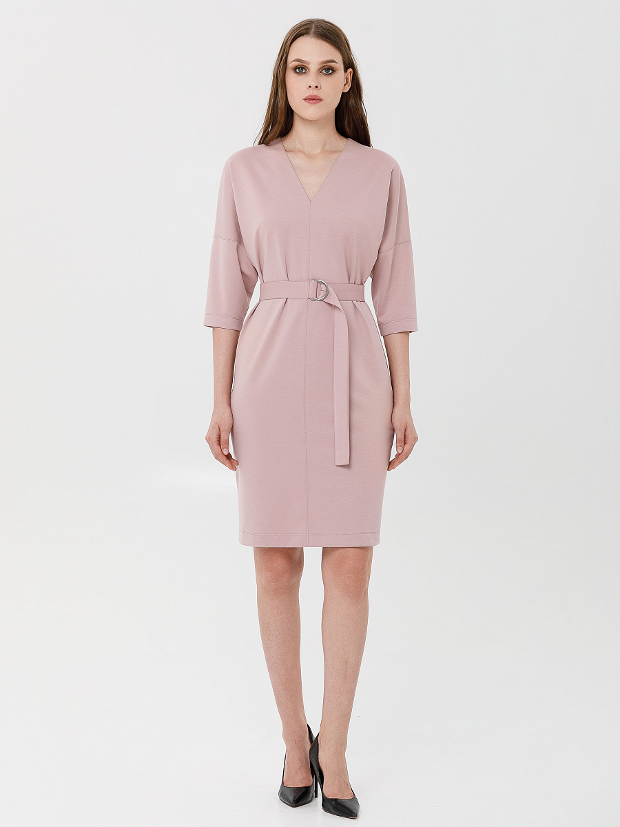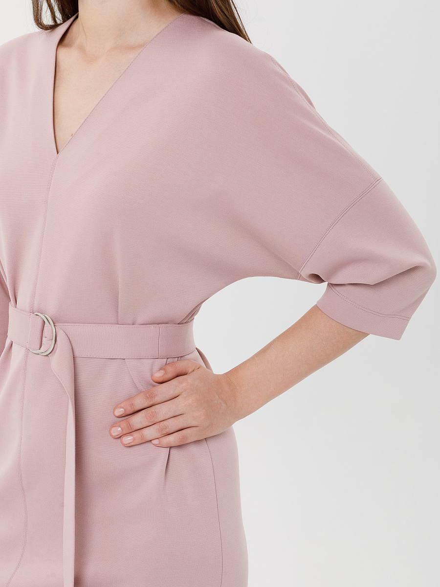 Перед и спинка со средним швом. Талия подчеркнута съемным поясом с полукольцами. Платье декорировано отделочными строчками.
