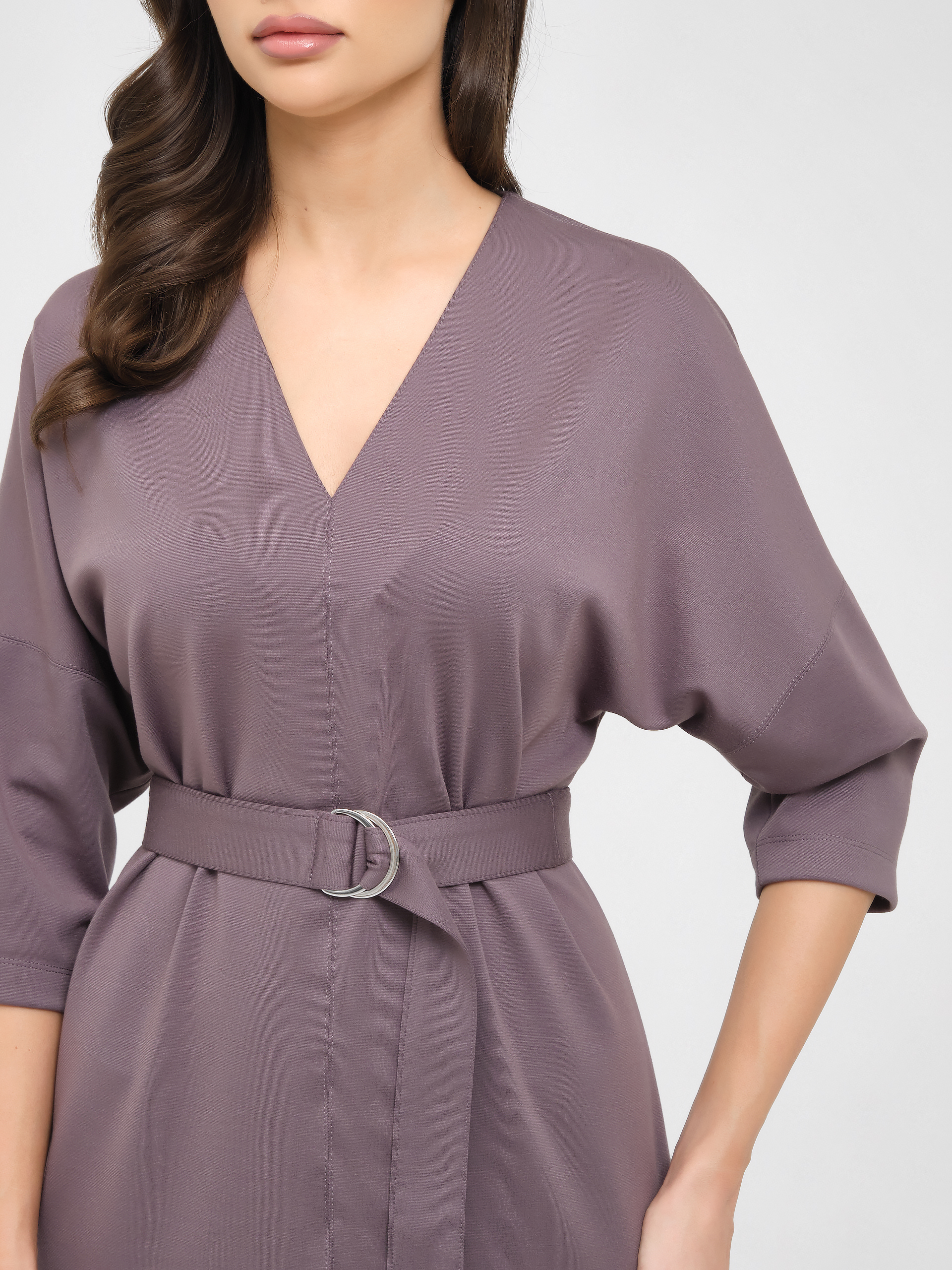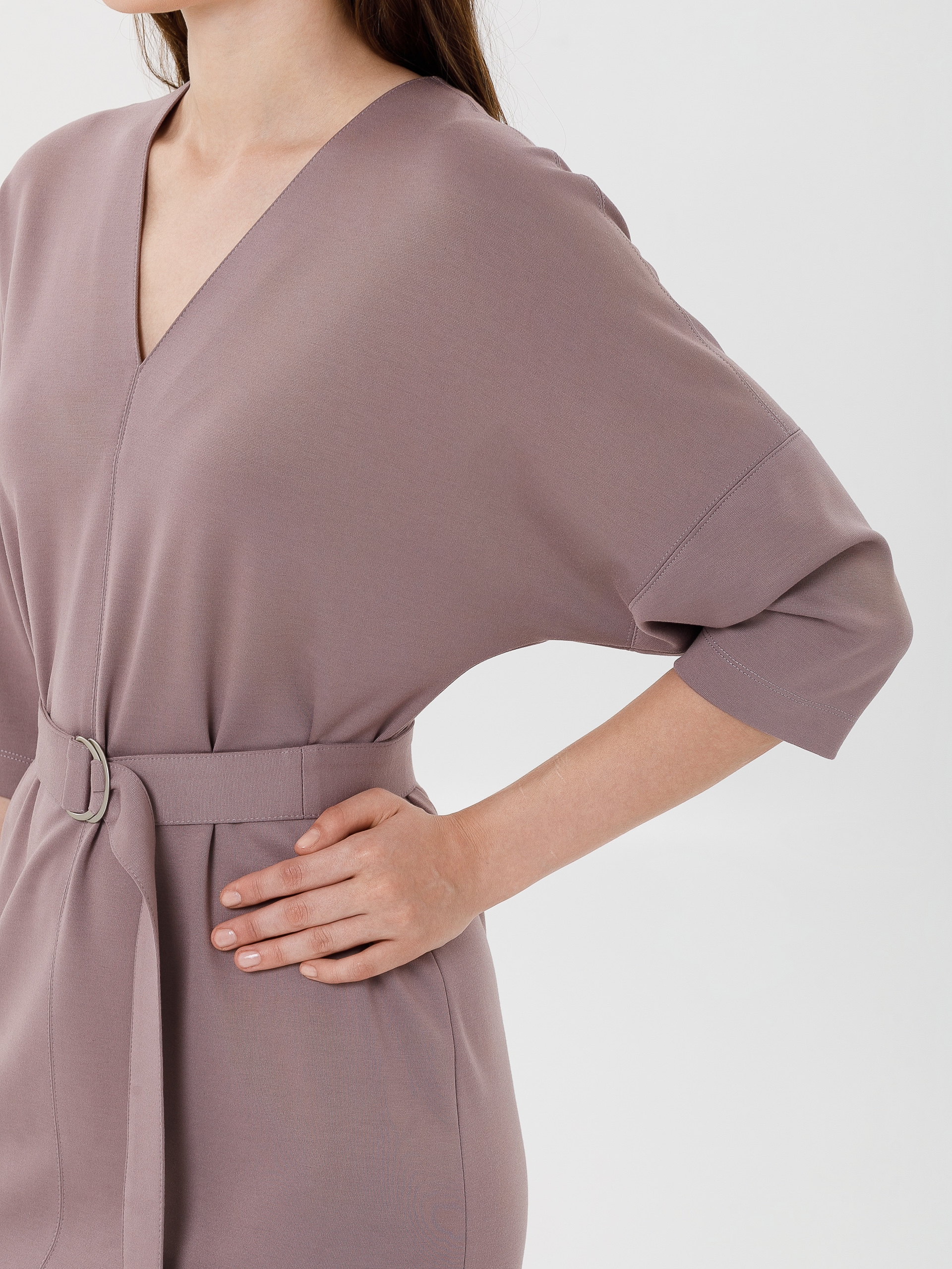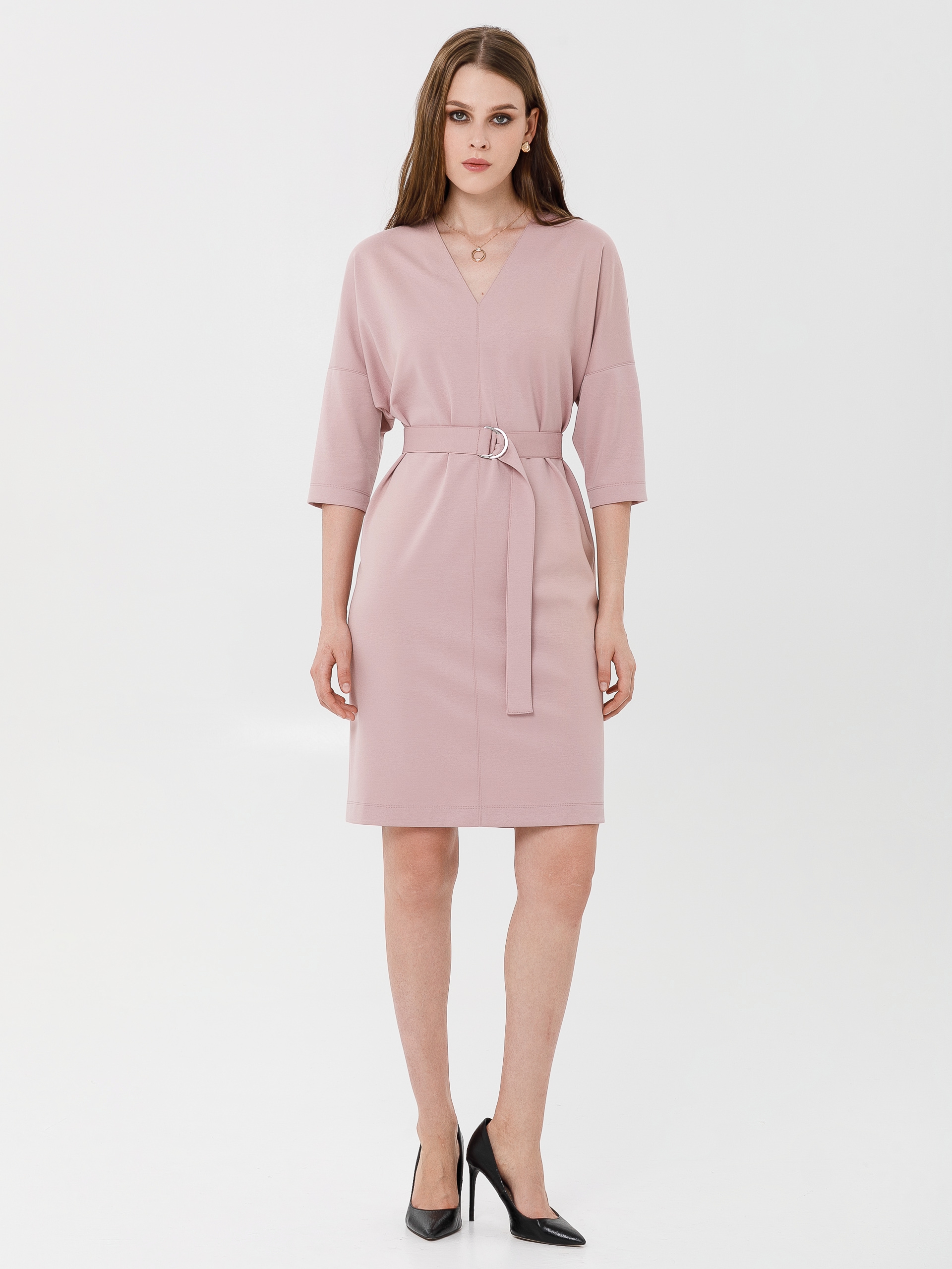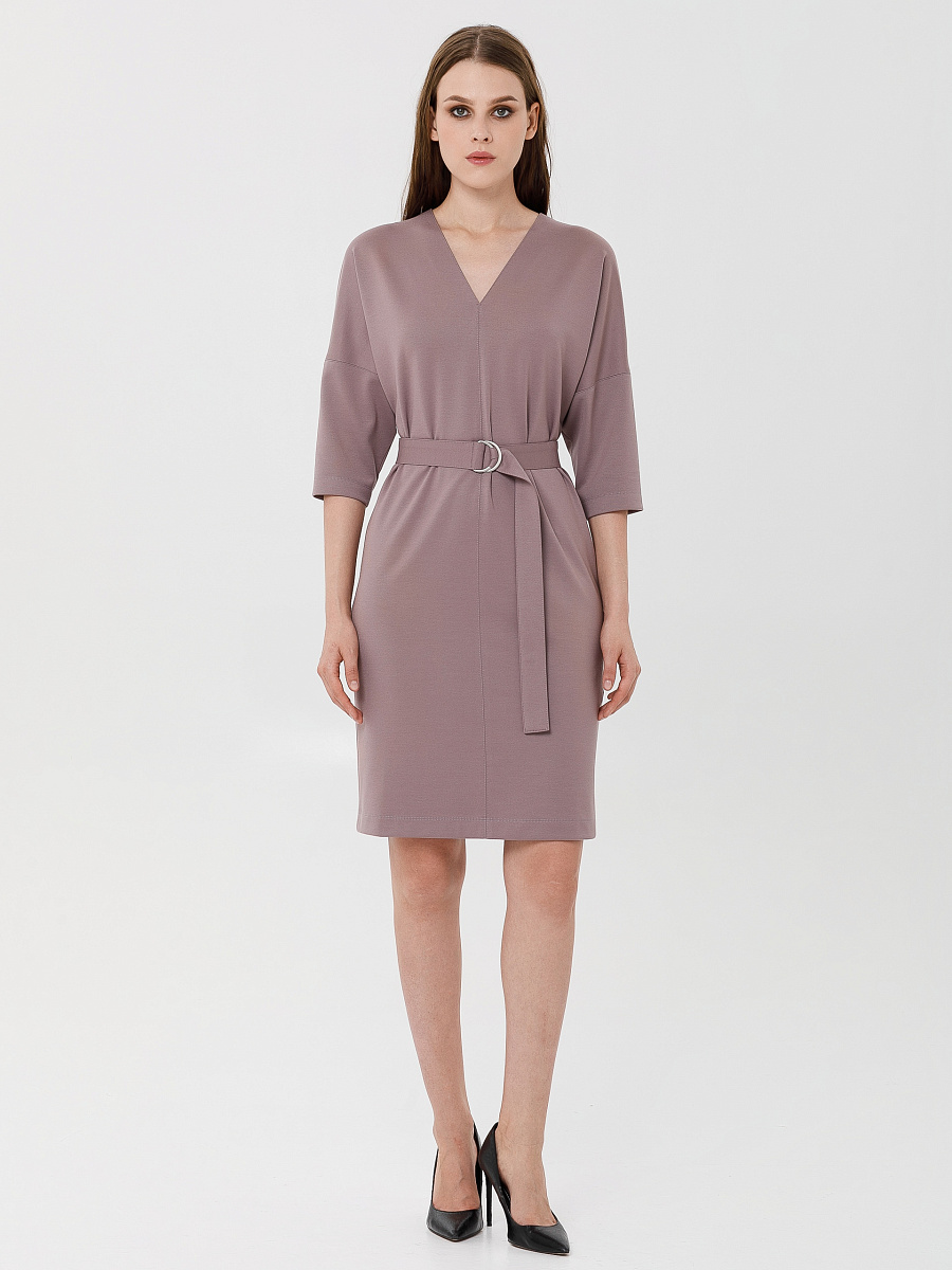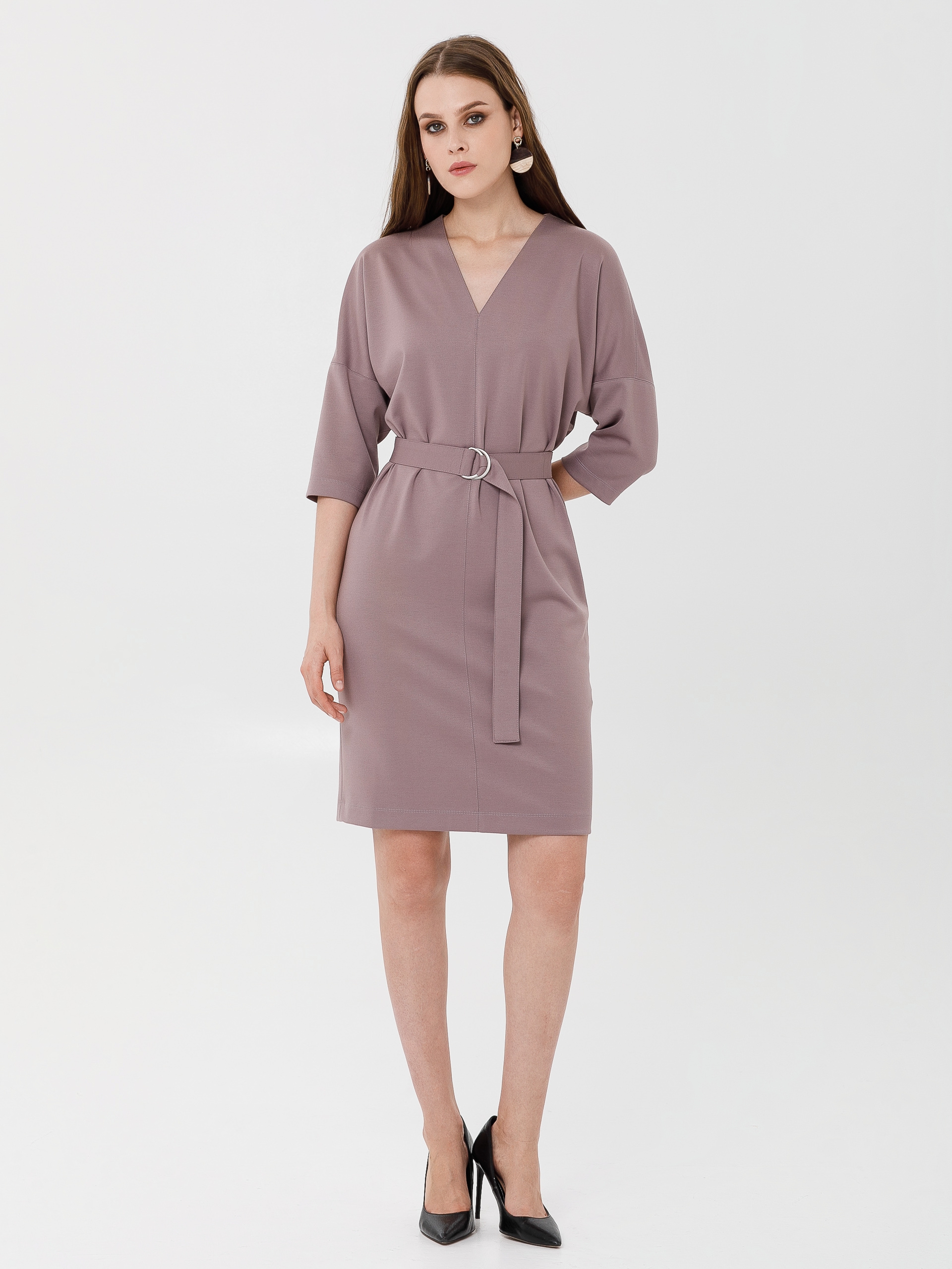 Перед и спинка со средним швом. Талия подчеркнута съемным поясом с полукольцами. Платье декорировано отделочными строчками.