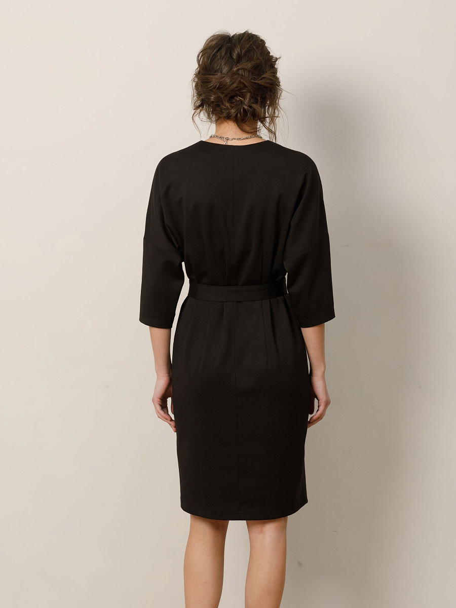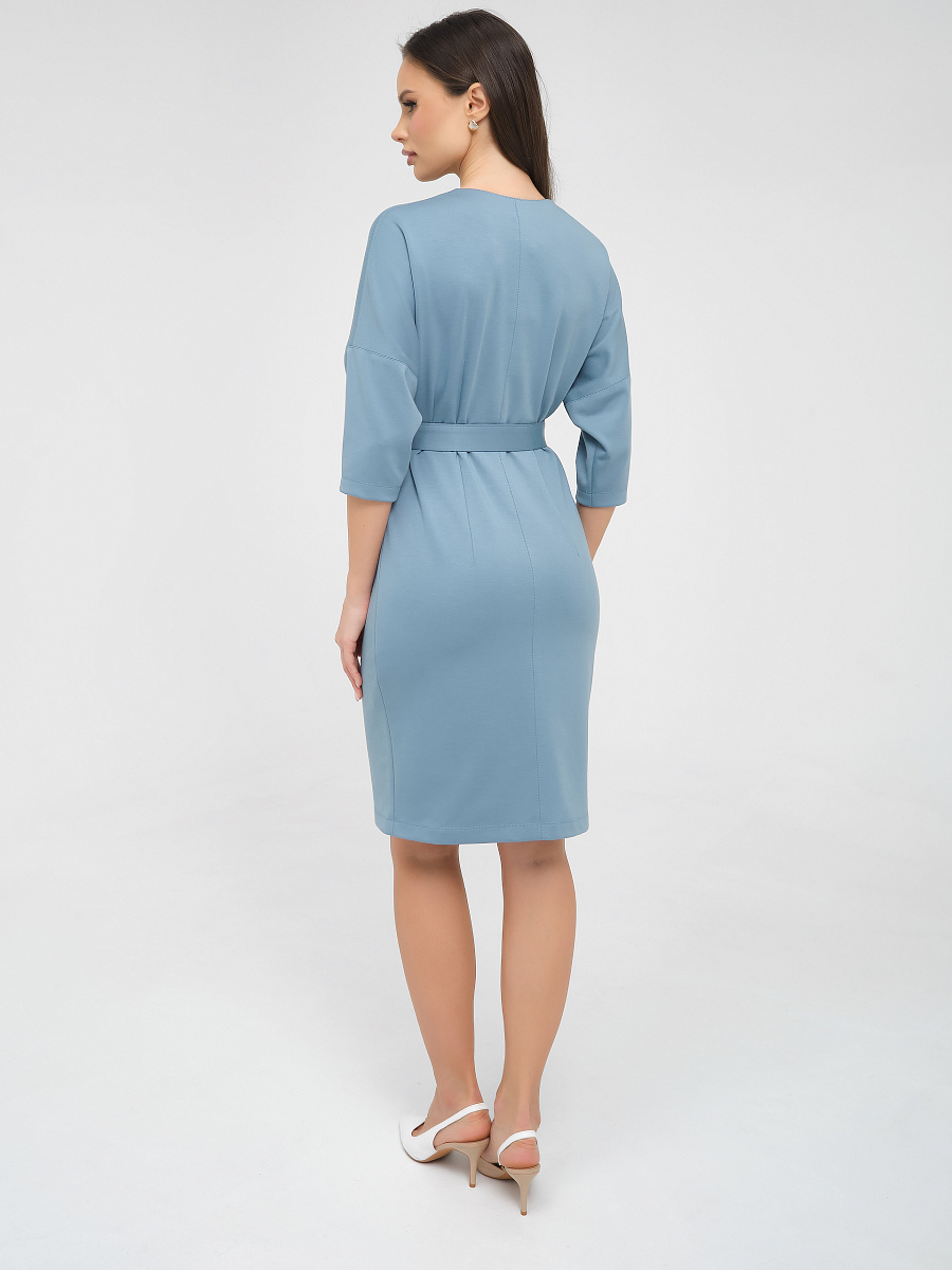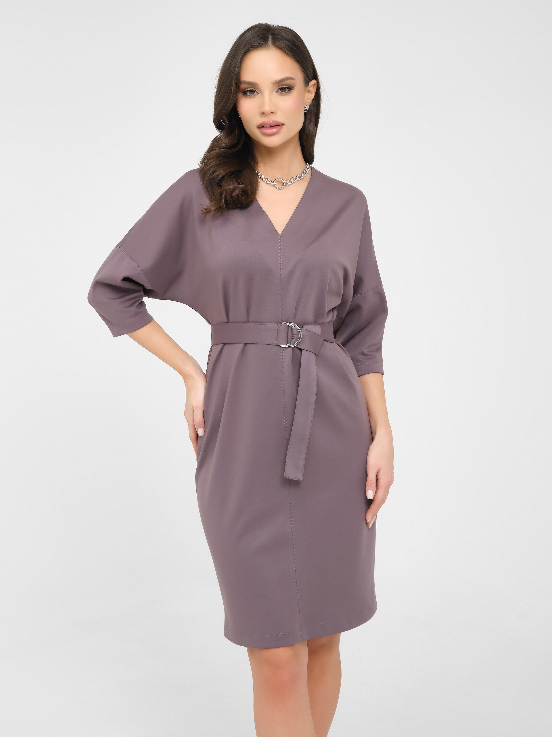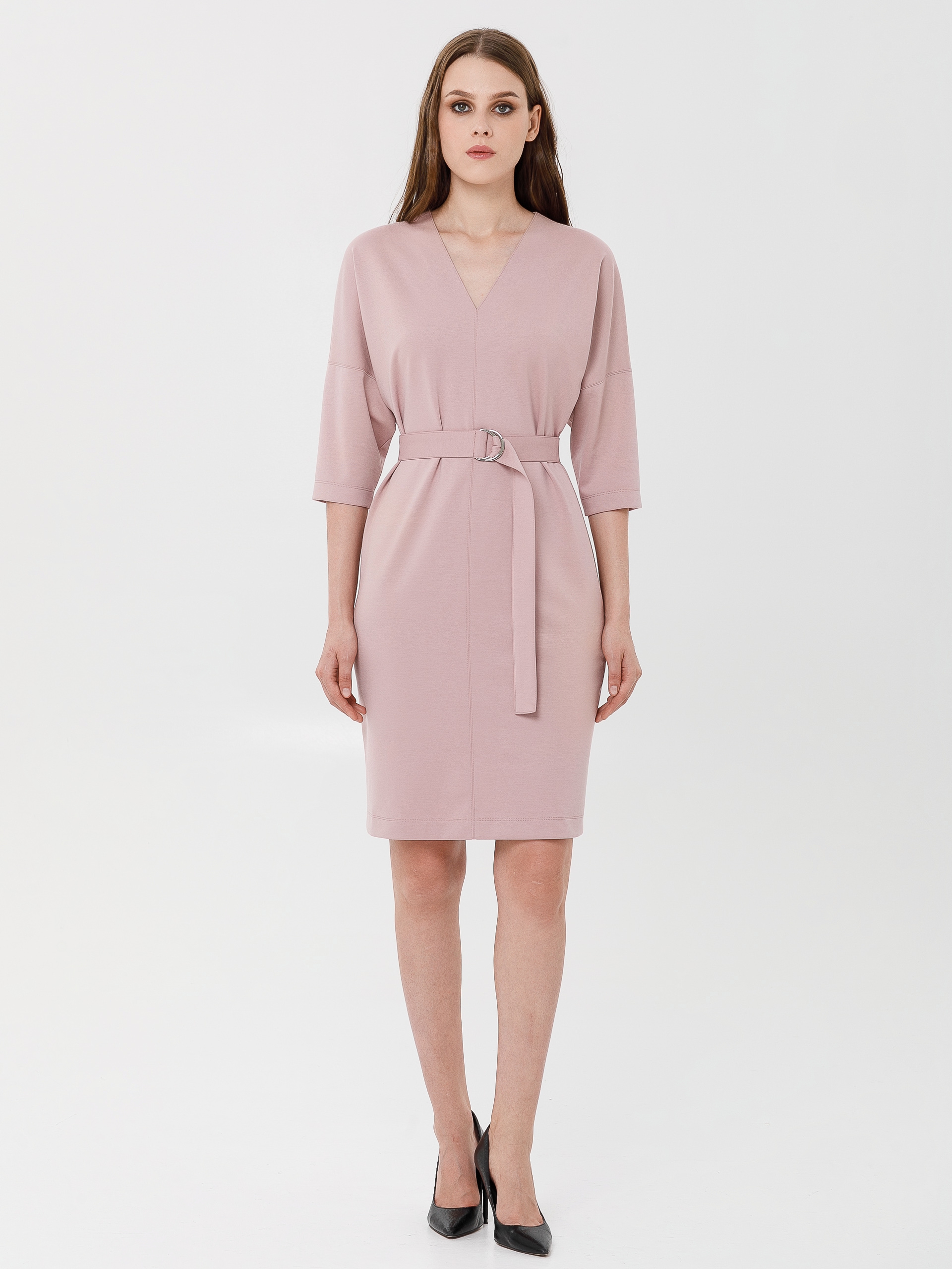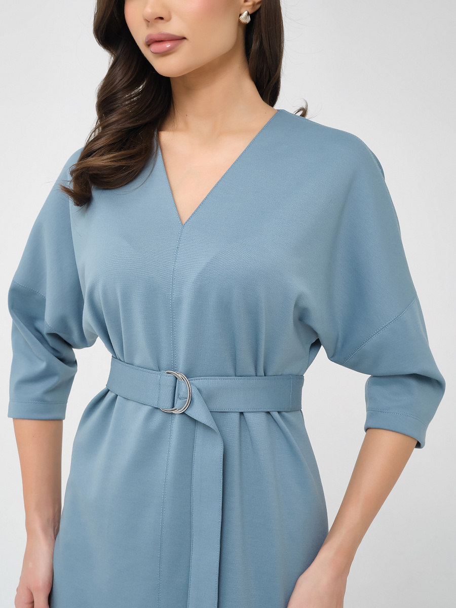 Перед и спинка со средним швом. Талия подчеркнута съемным поясом с полукольцами. Платье декорировано отделочными строчками.