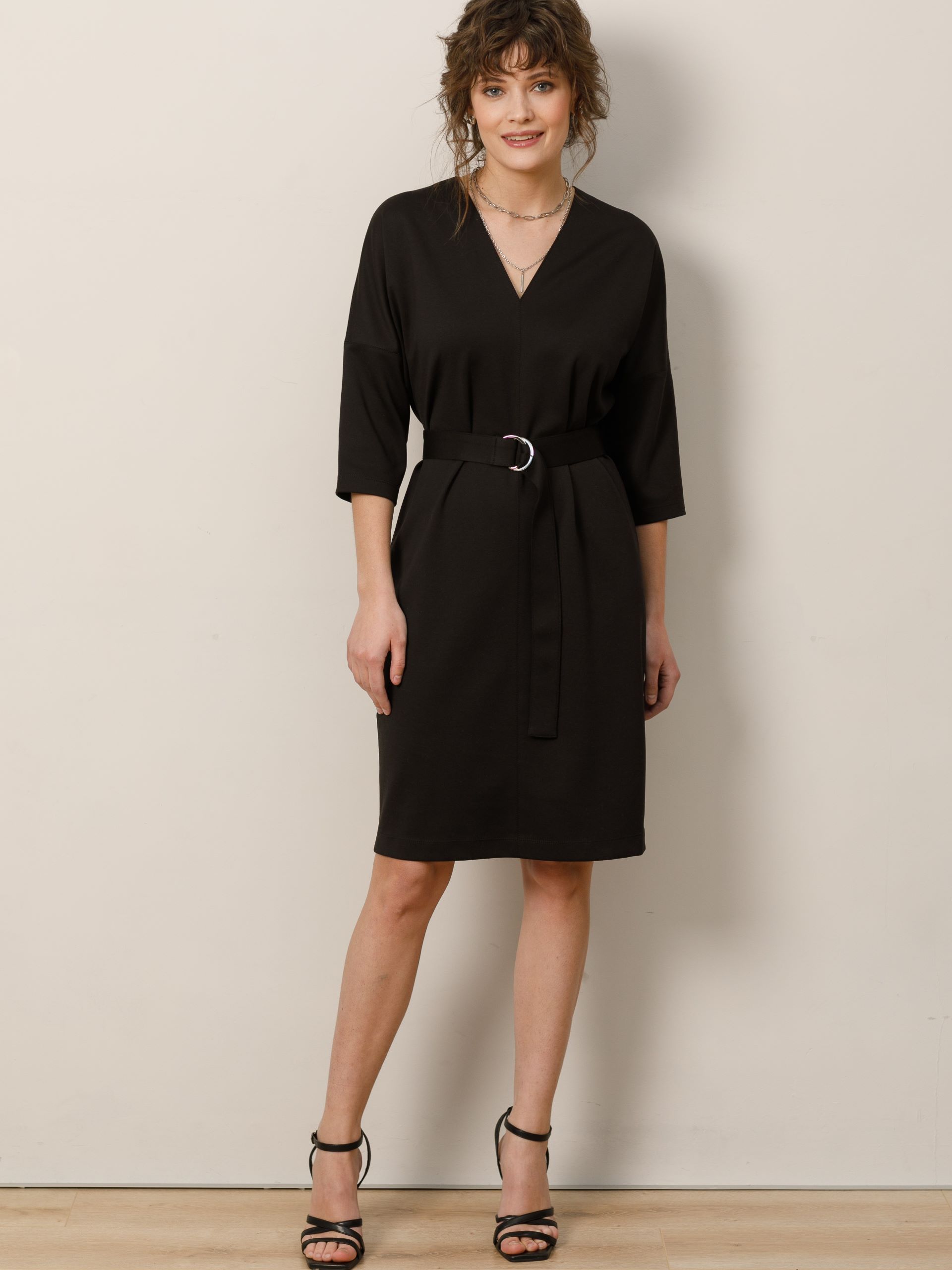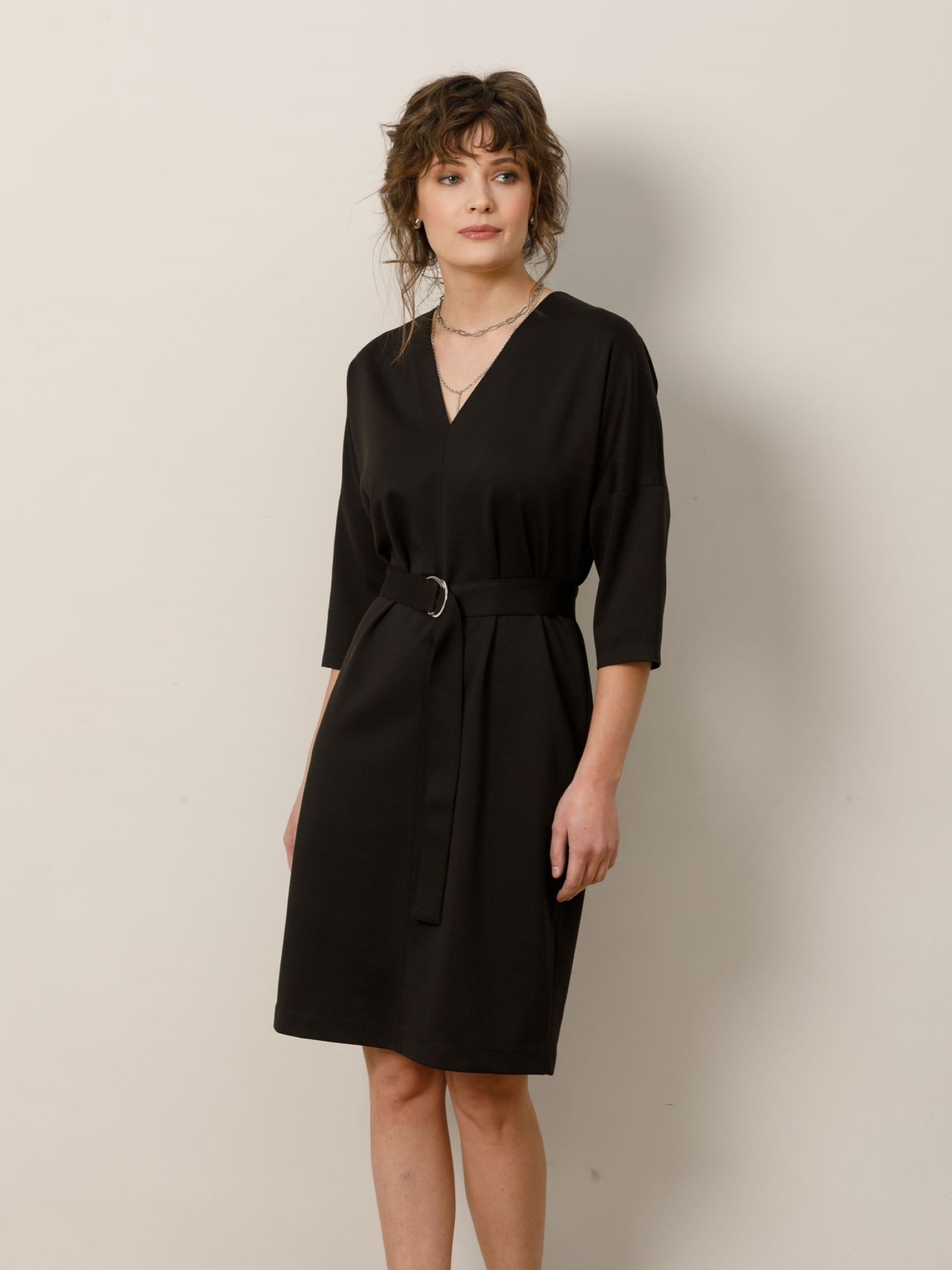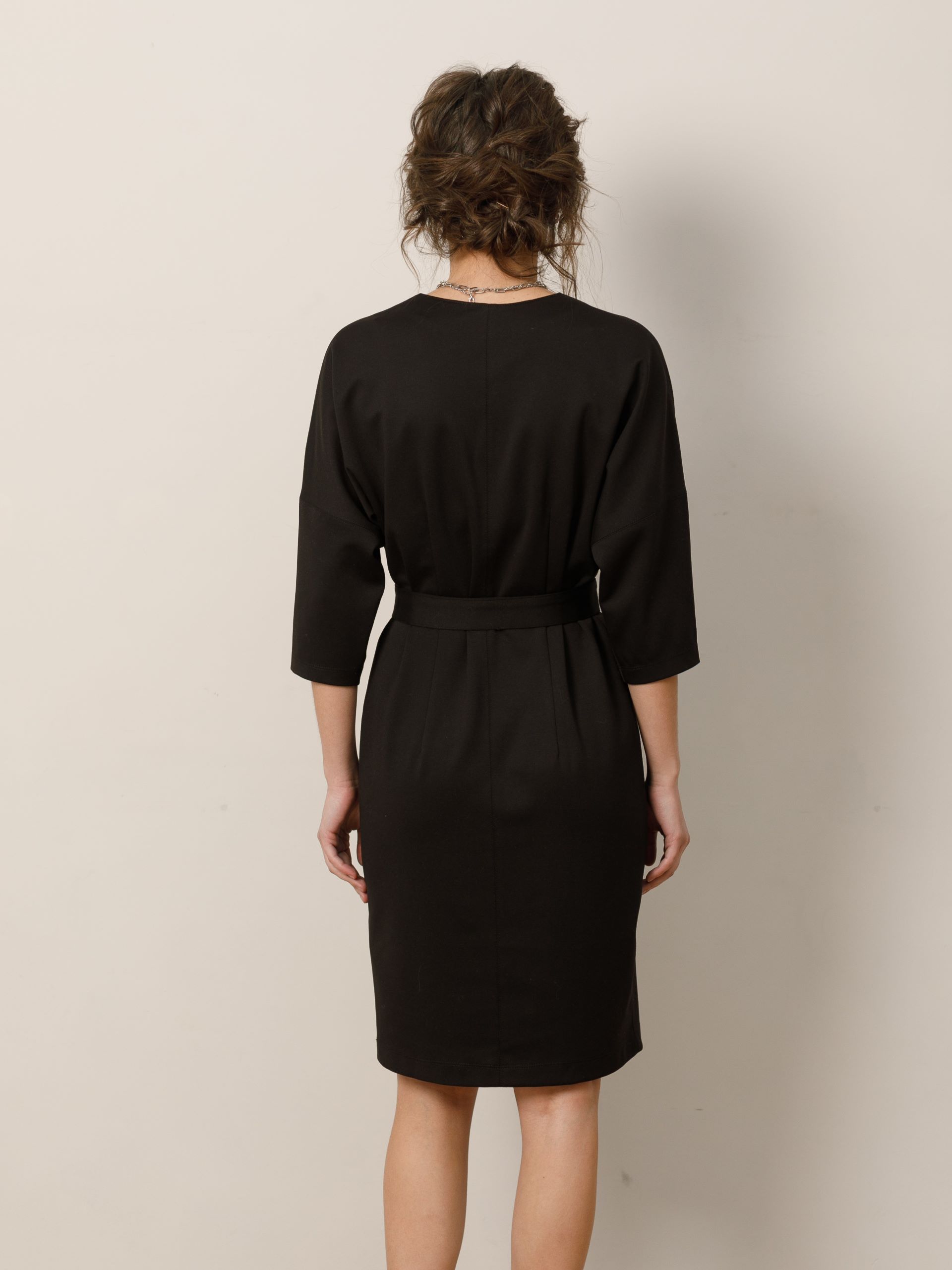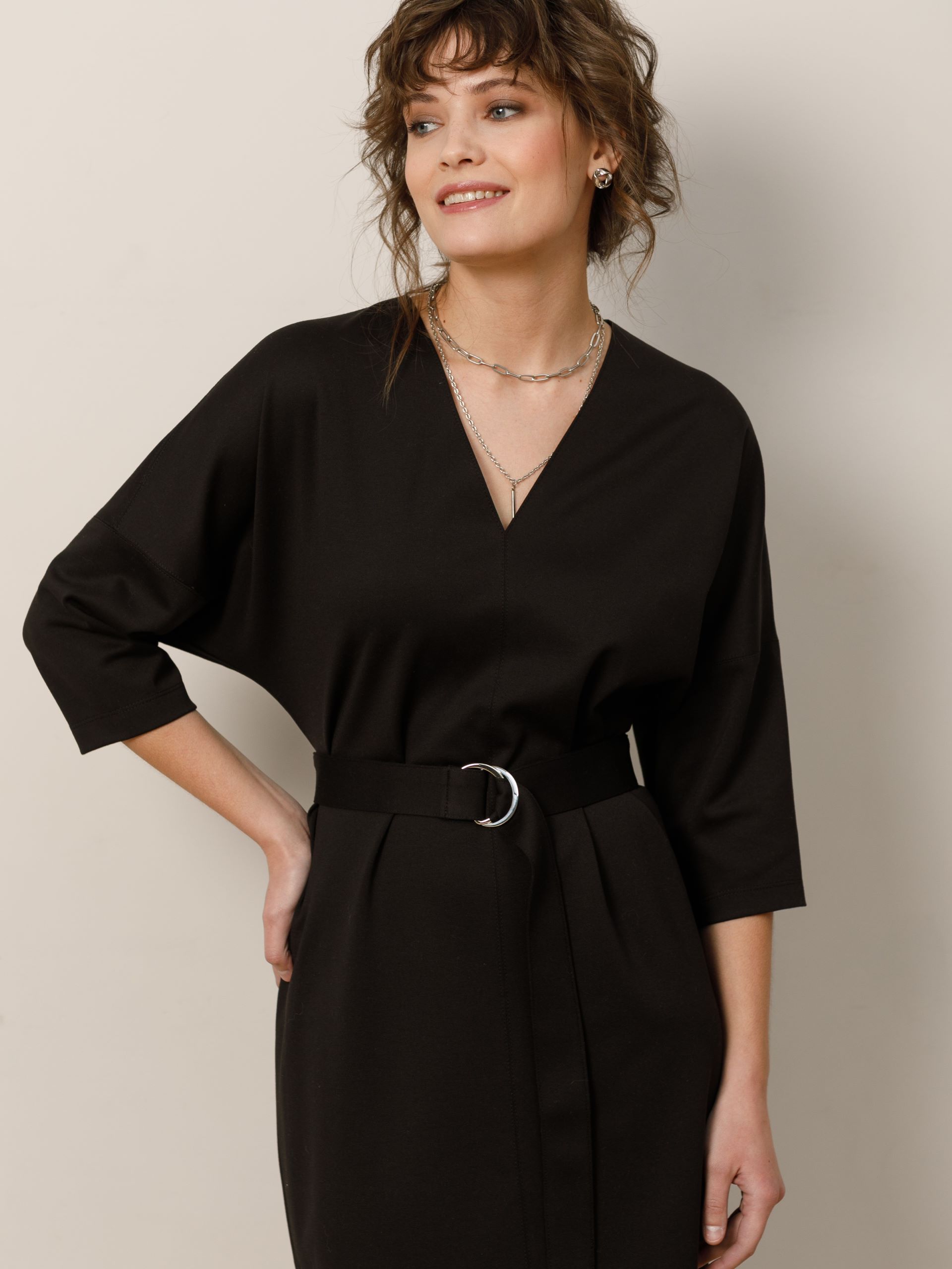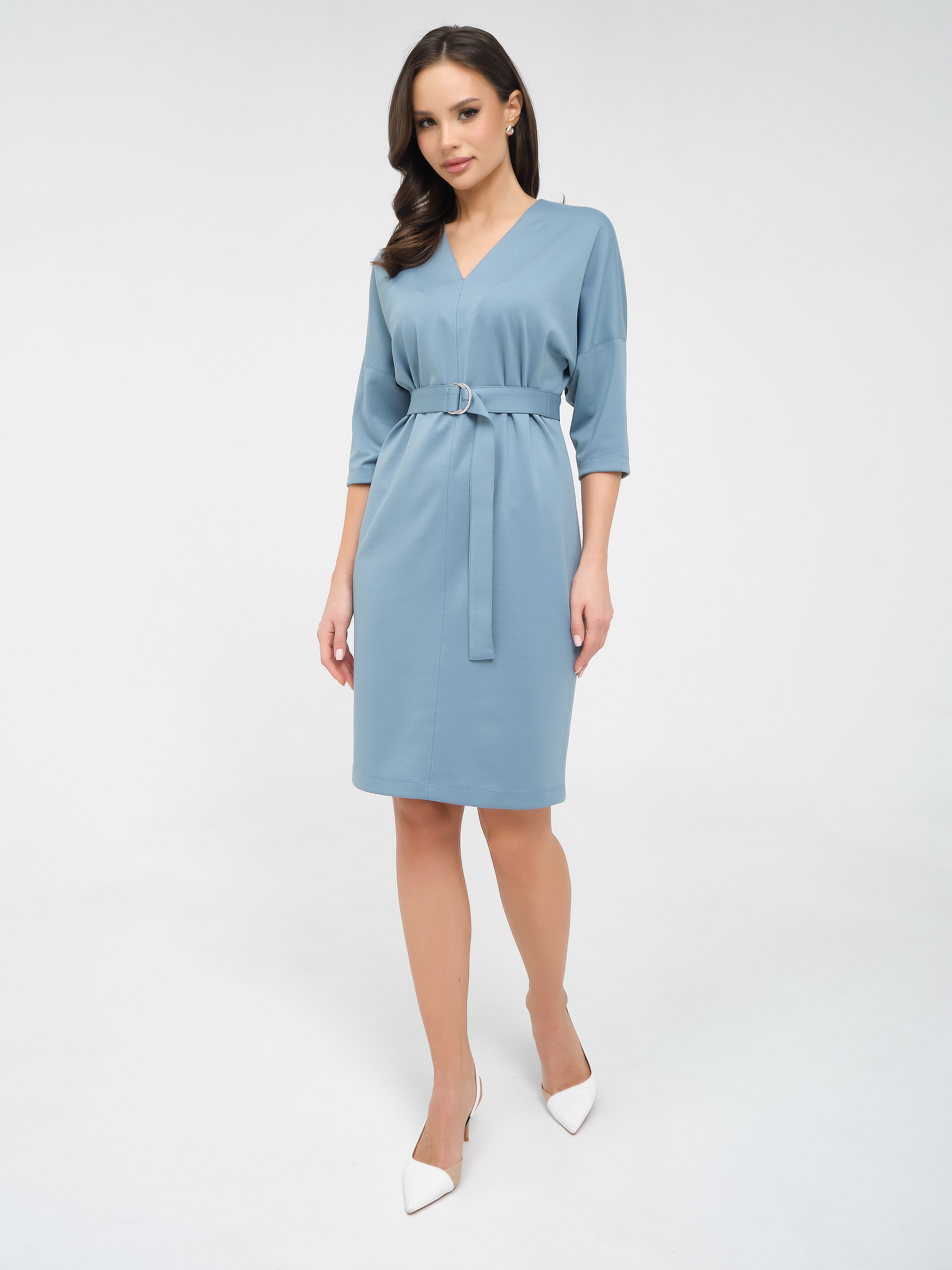 Перед и спинка со средним швом. Талия подчеркнута съемным поясом с полукольцами. Платье декорировано отделочными строчками.