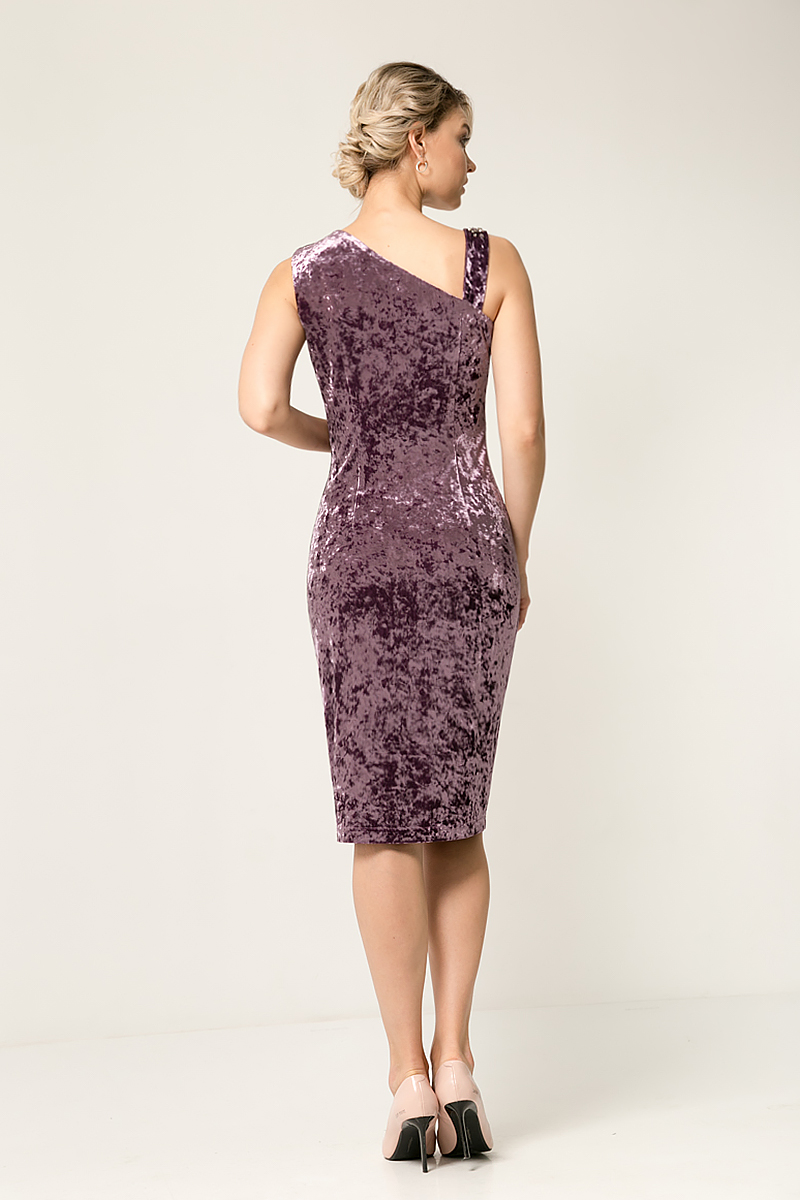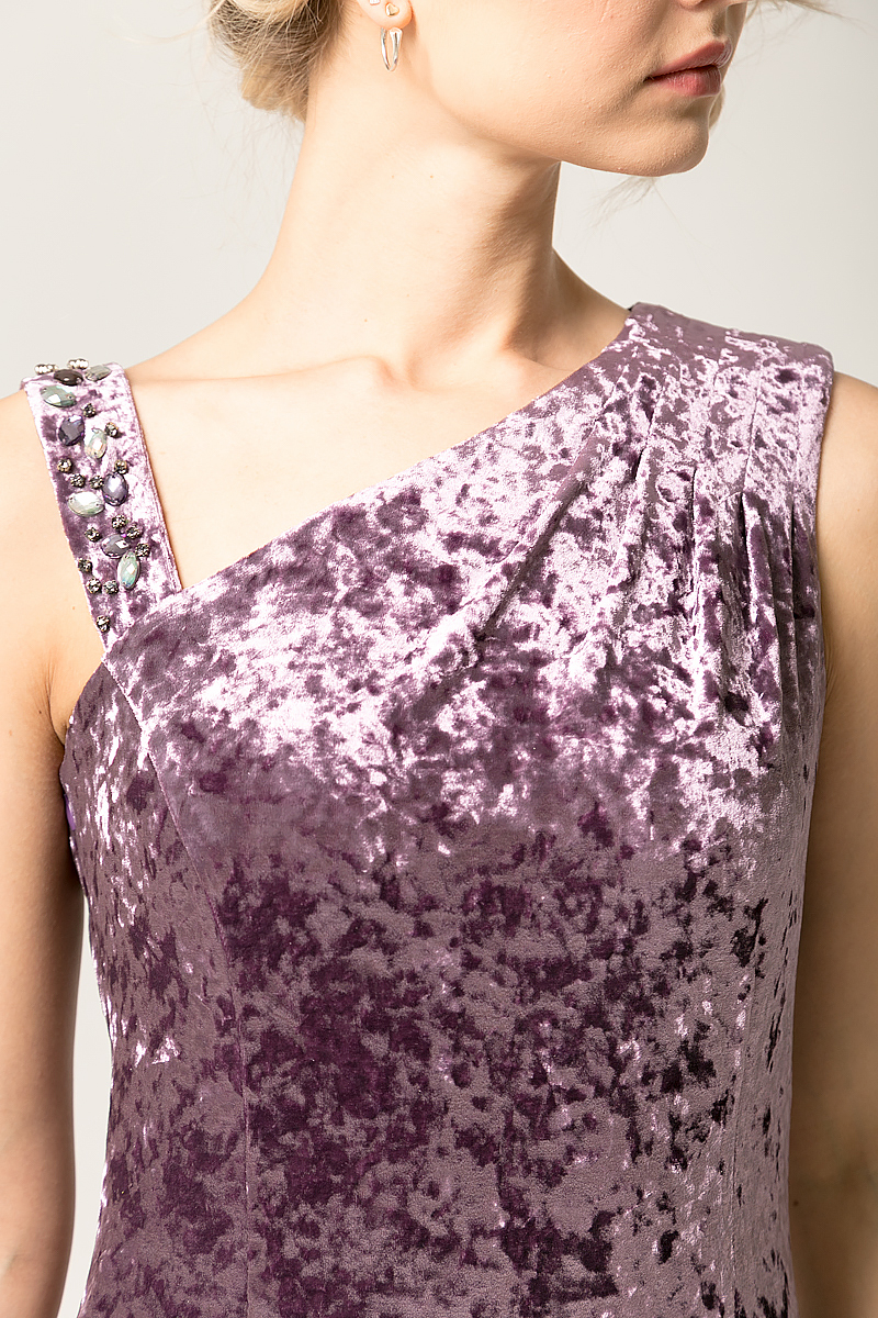 Платье из трикотажного бархата с эффектом «креш», прилегающего силуэта, ассиметричного кроя в верхней части, без рукавов.