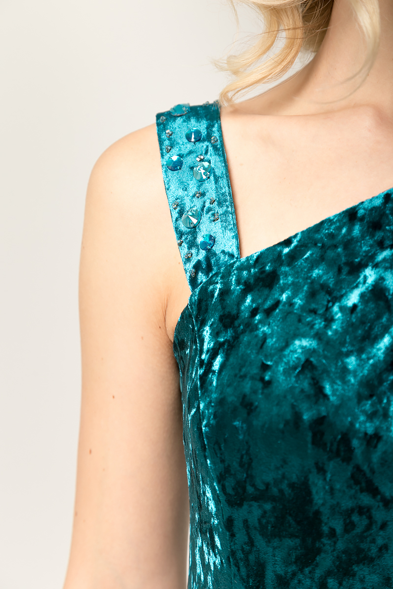 На переде в области плеча заложены защипы. Широкая бретель декорирована пришивными стразами. Модель без подкладки.