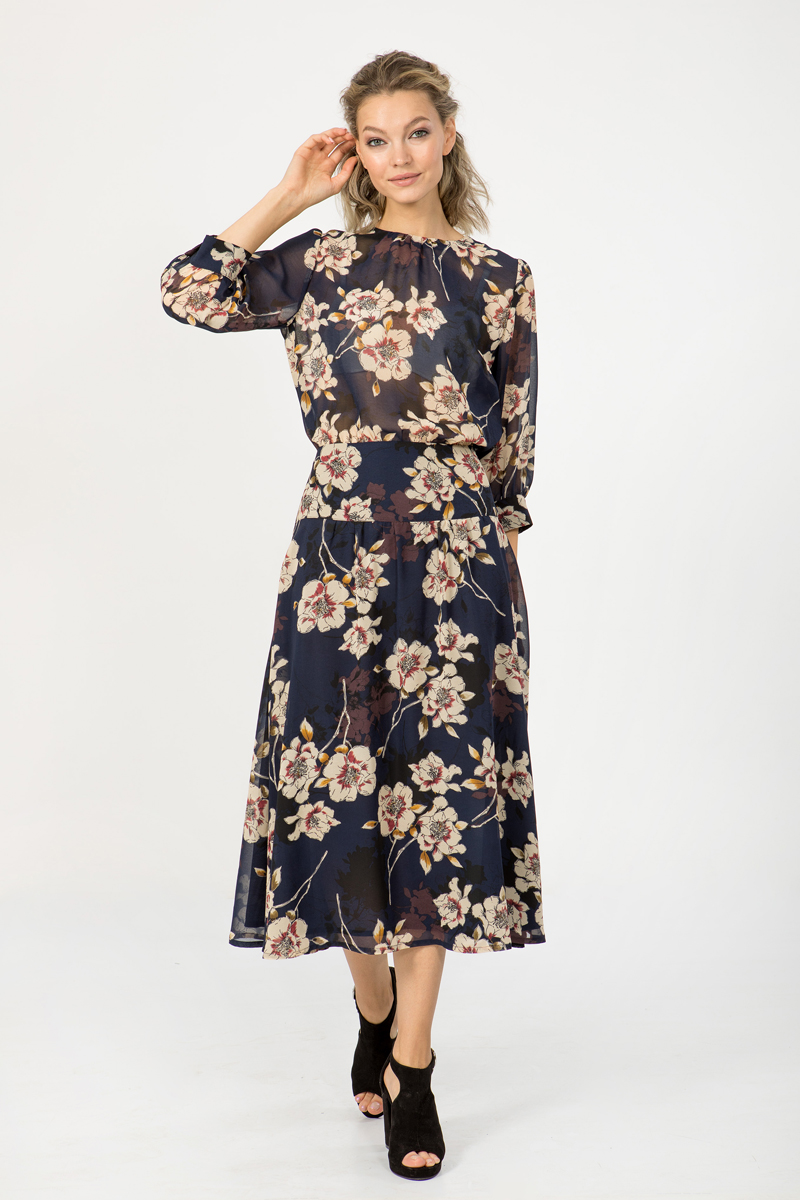 Платье из шифона с принтом, Х-образного силуэта, отрезное по линии талии.