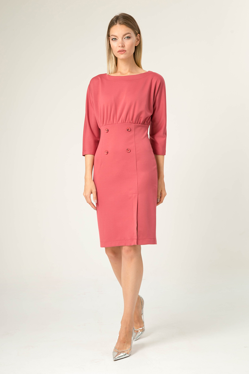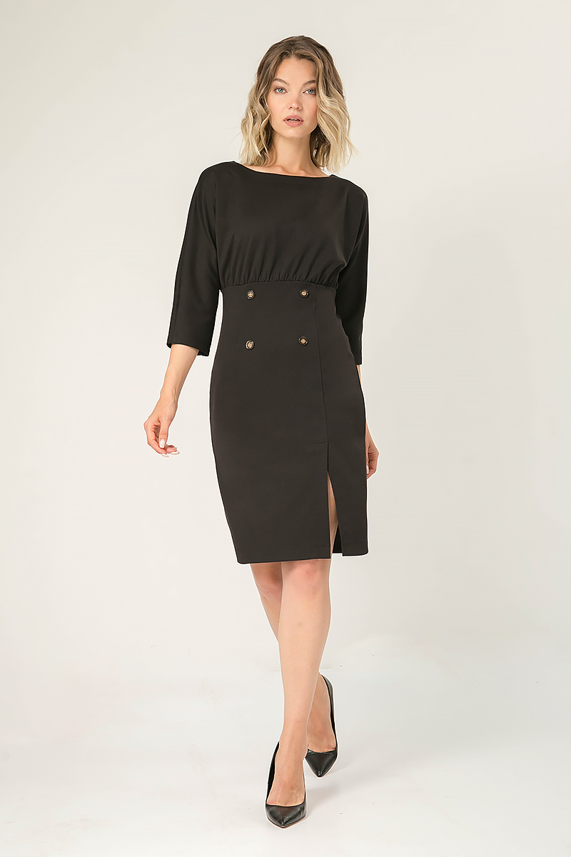 Верхняя часть платья со сборкой в области подреза. Средний шов спинки и вертикальный подрез переда снизу заканчиваются шлицами. Платье декорировано отделочными строчками и пуговицами.