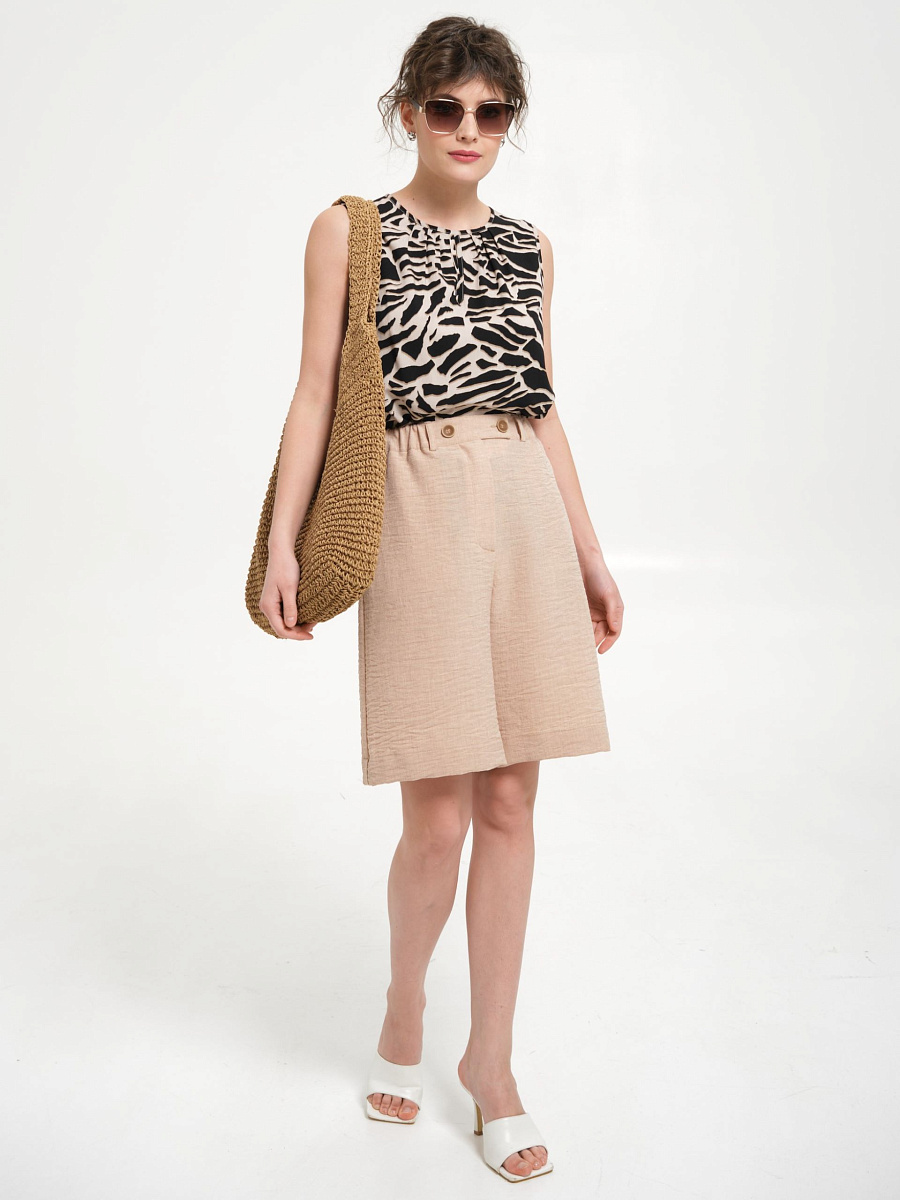 Спереди карманы в подрезных бочках. Сзади кокетки и застроченные горизонтальные складки. Под кокетками фигурные накладные карманы. Пояс эластичный, со шлёвками. Шорты декорированы отделочными строчками.