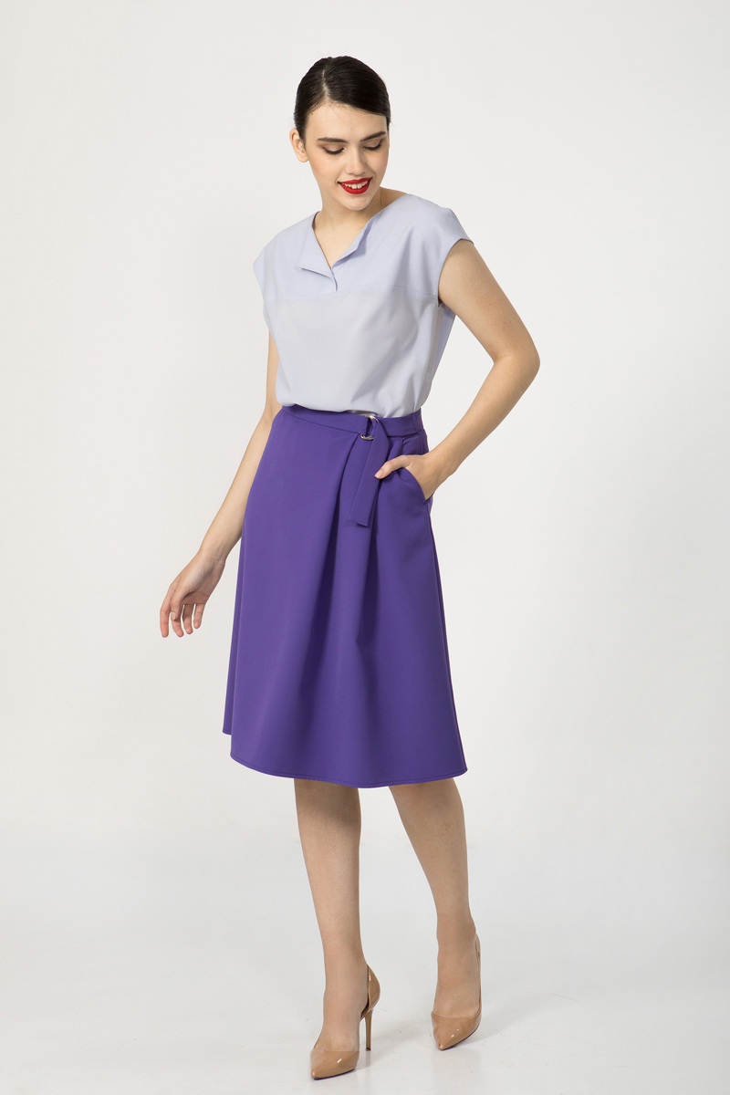 Переднее полотнище юбки ассиметричное, с двумя односторонними складками. В подрезных бочках карманы. На поясе хлястик, застегивающийся на металлические полукольца.