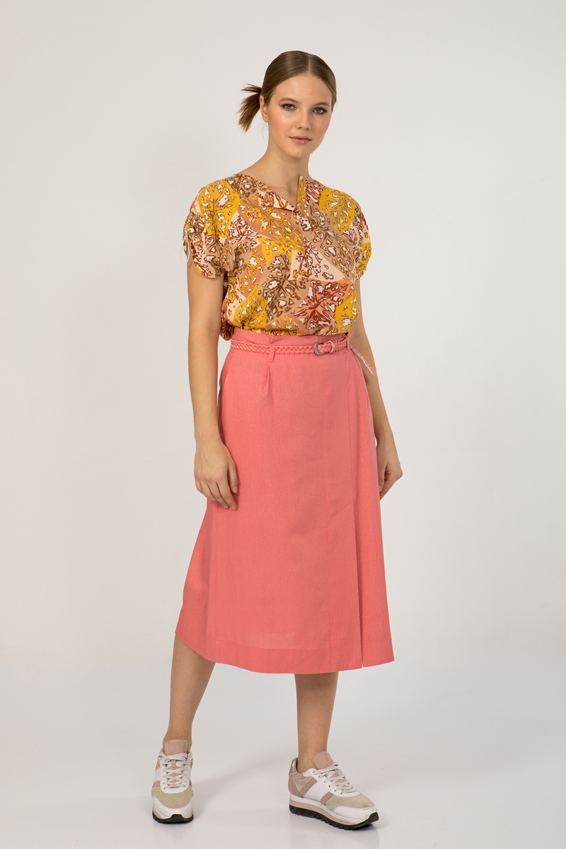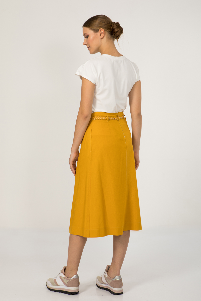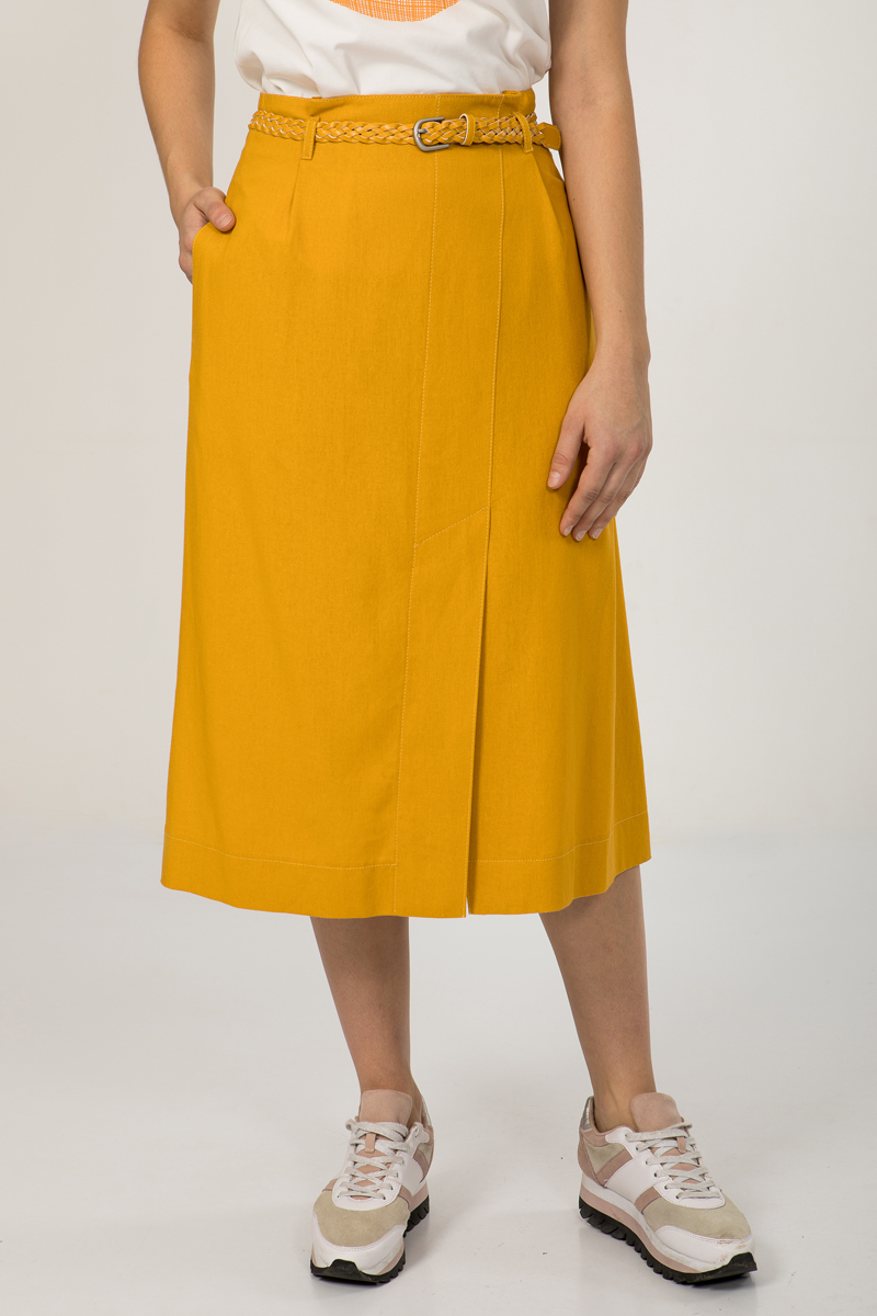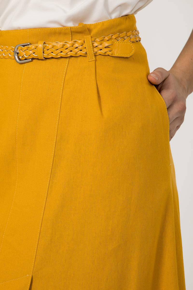 Юбка льняная А-образного силуэта, комфортной средней посадки, с цельнокроеным поясом и шлевками.