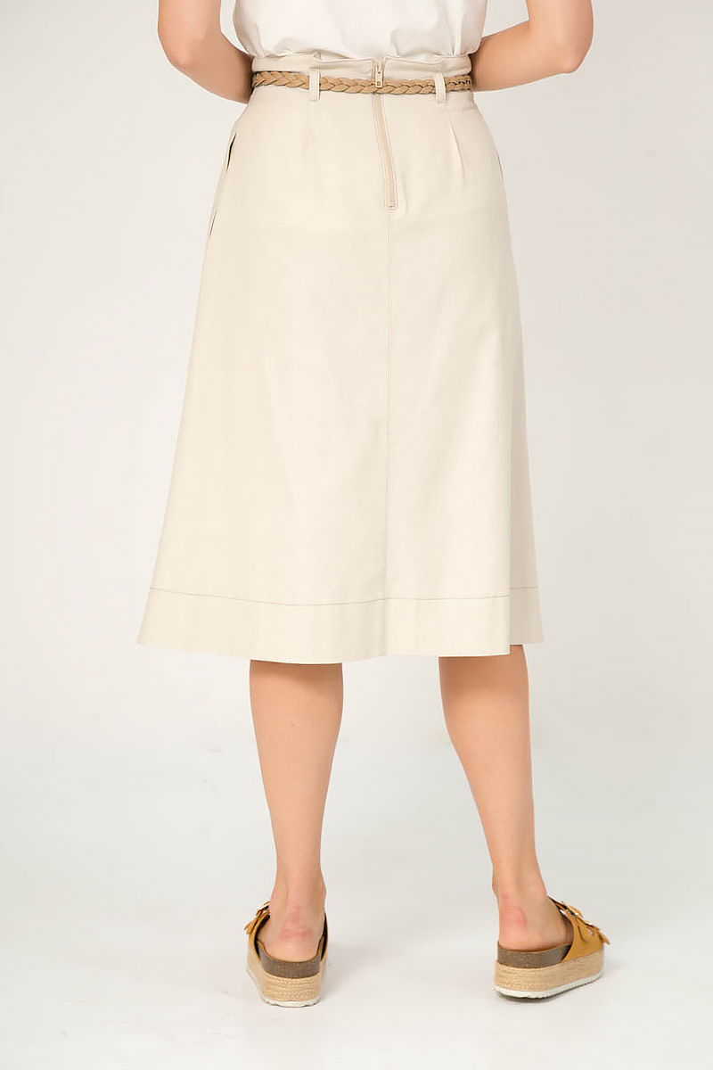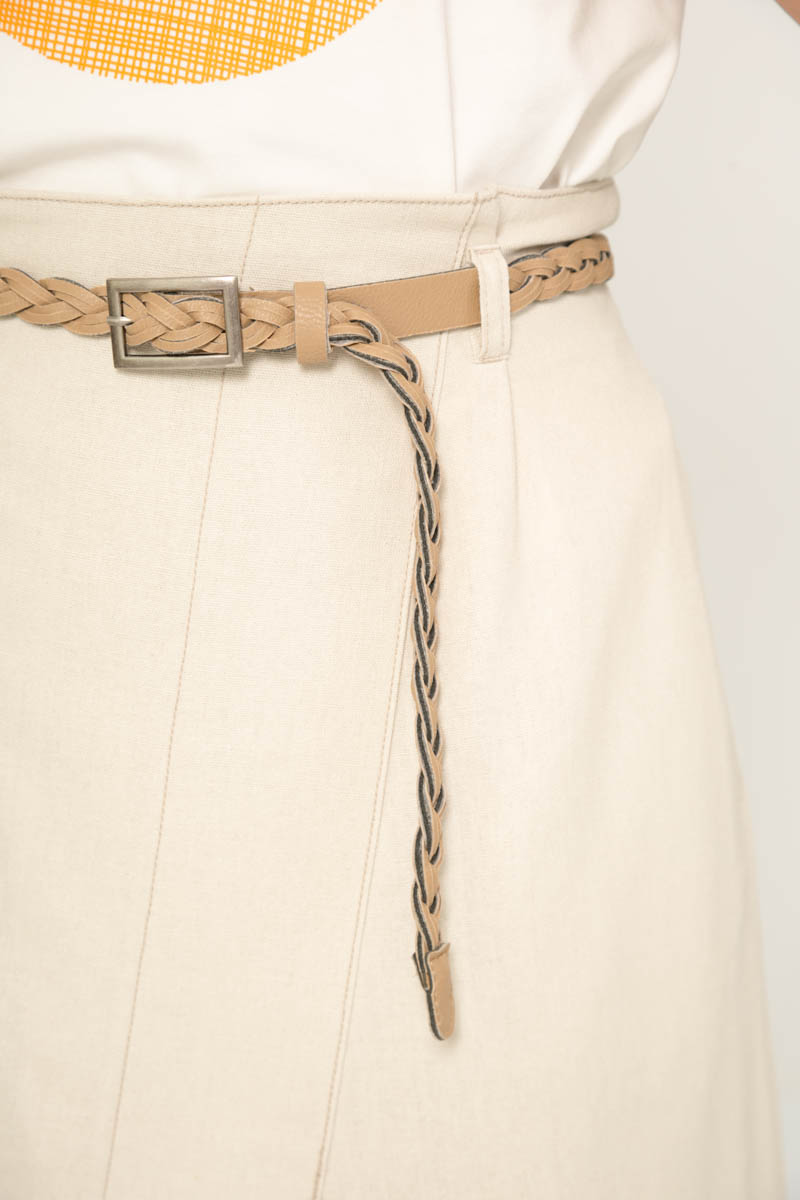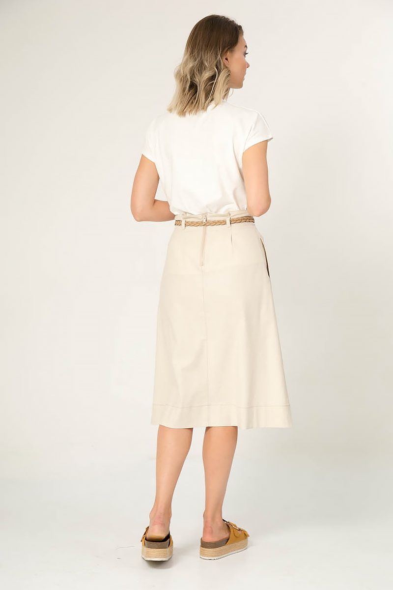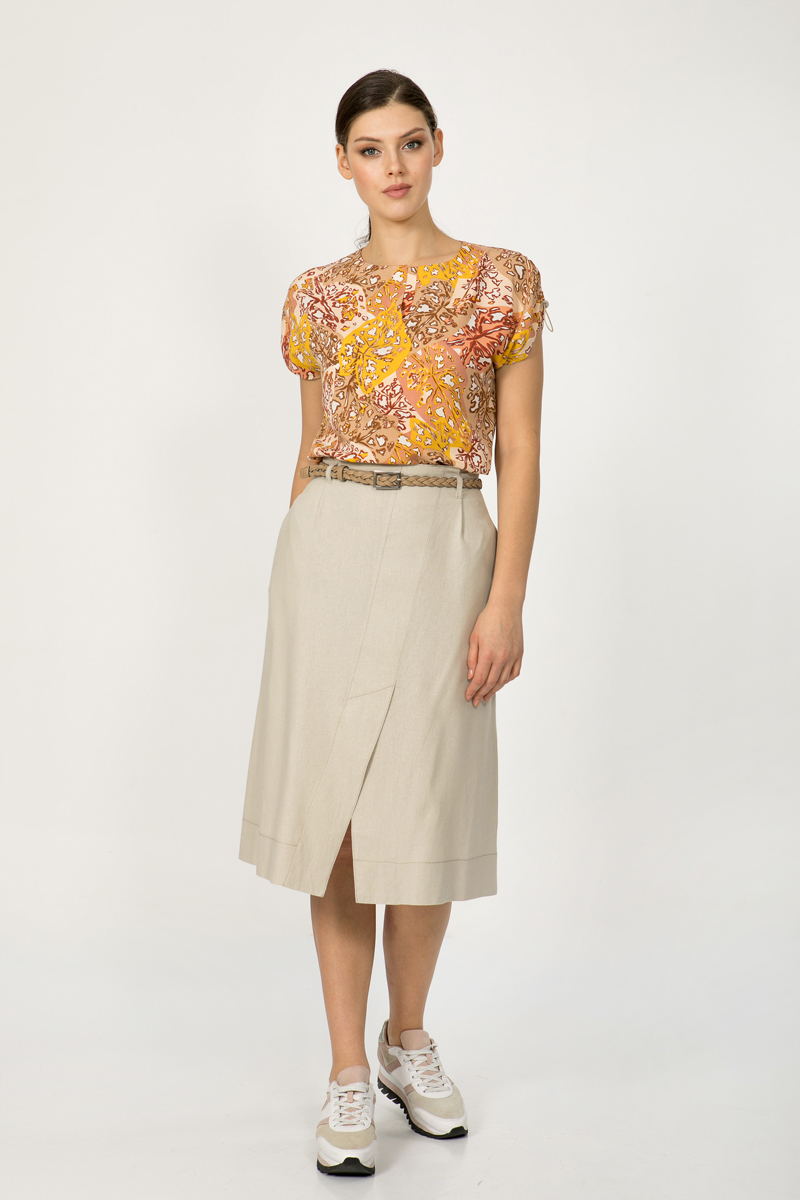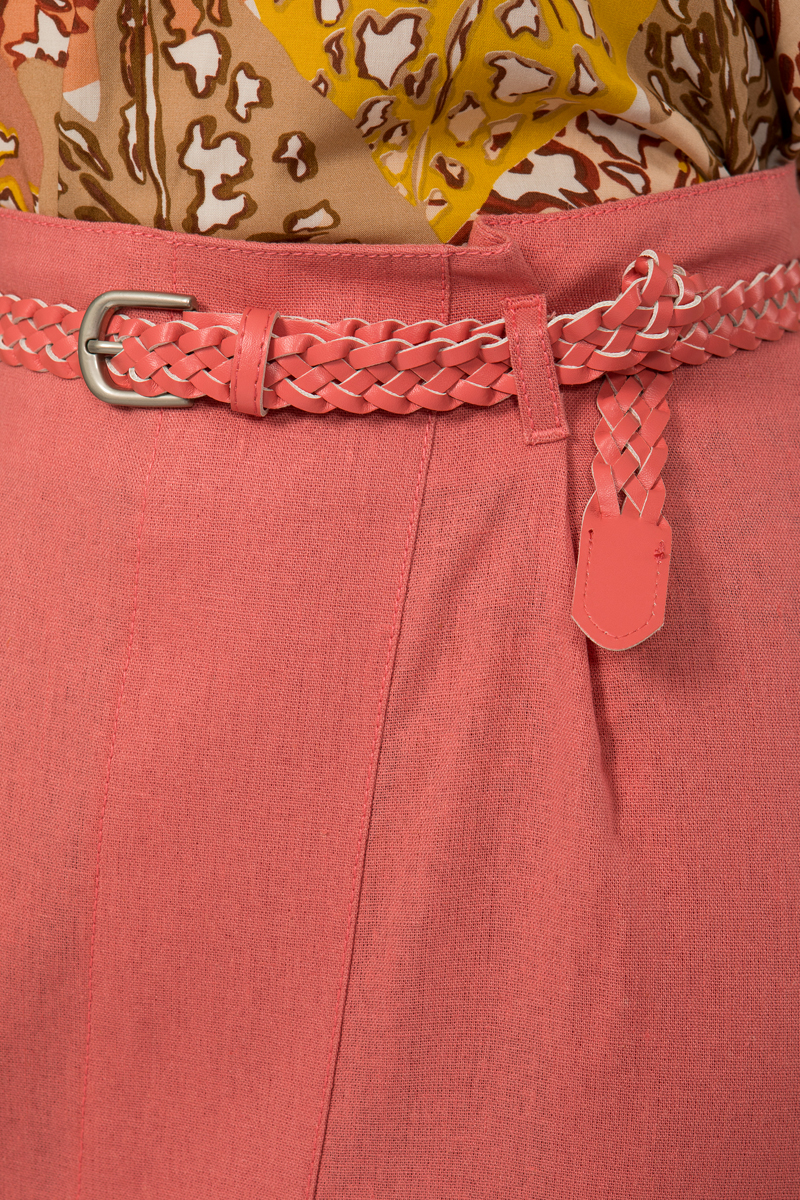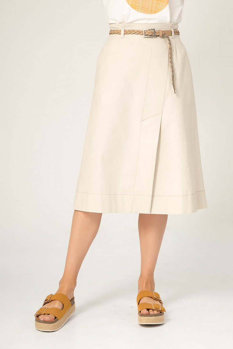 Переднее полотнище юбки ассиметричное, с защипами по талии и наклонным подрезом, который снизу заканчивается шлицей. В боковых швах карманы. Талия подчеркнута съемным плетеным ремнем с пряжкой. Юбка декорирована отделочными строчками.