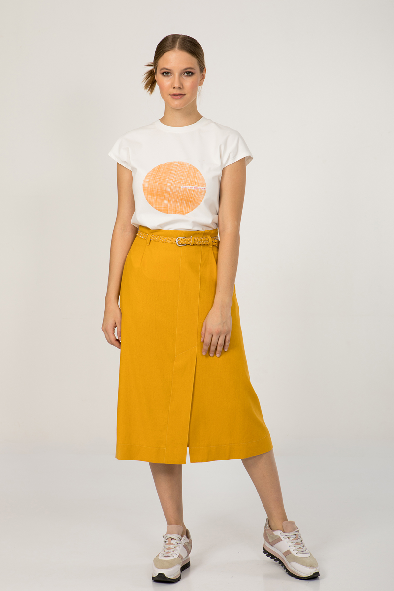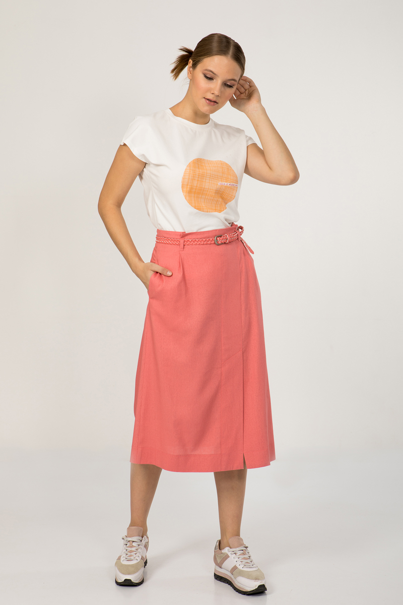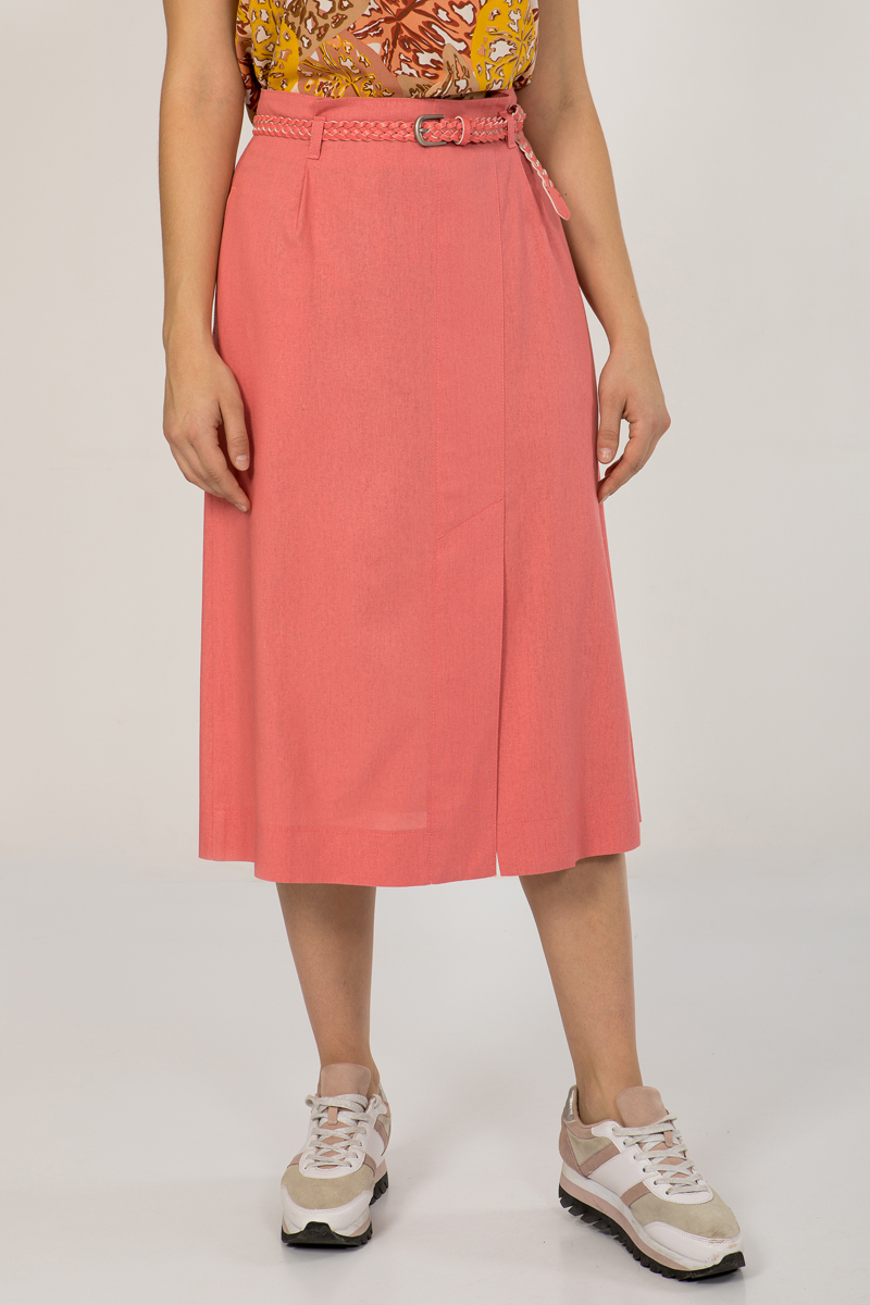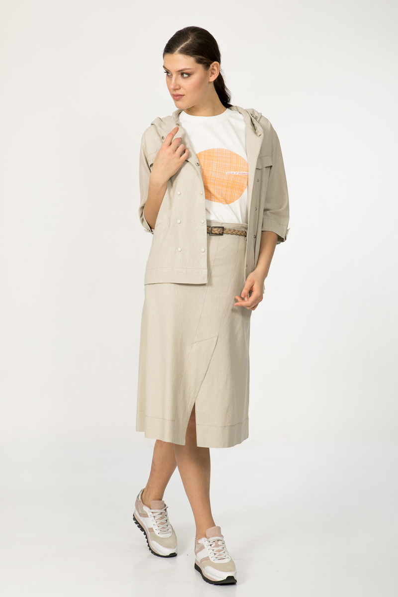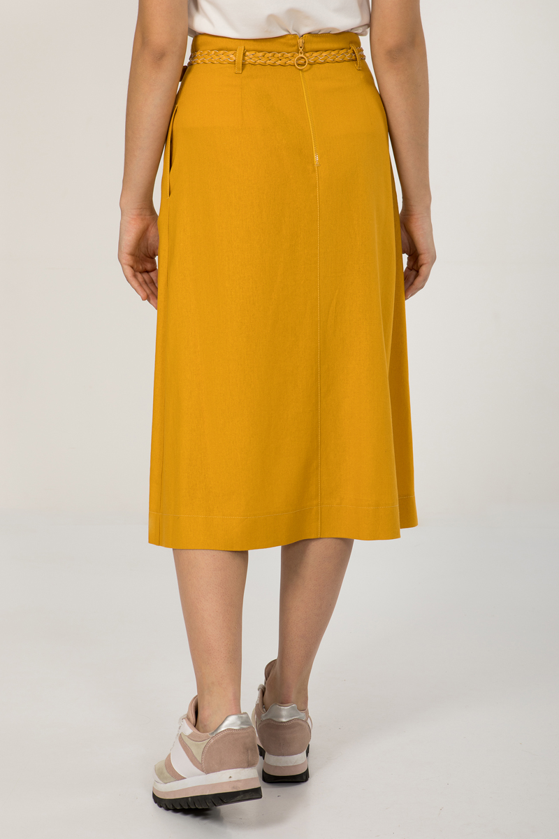 Переднее полотнище юбки ассиметричное, с защипами по талии и наклонным подрезом, который снизу заканчивается шлицей. В боковых швах карманы. Талия подчеркнута съемным плетеным ремнем с пряжкой. Юбка декорирована отделочными строчками.