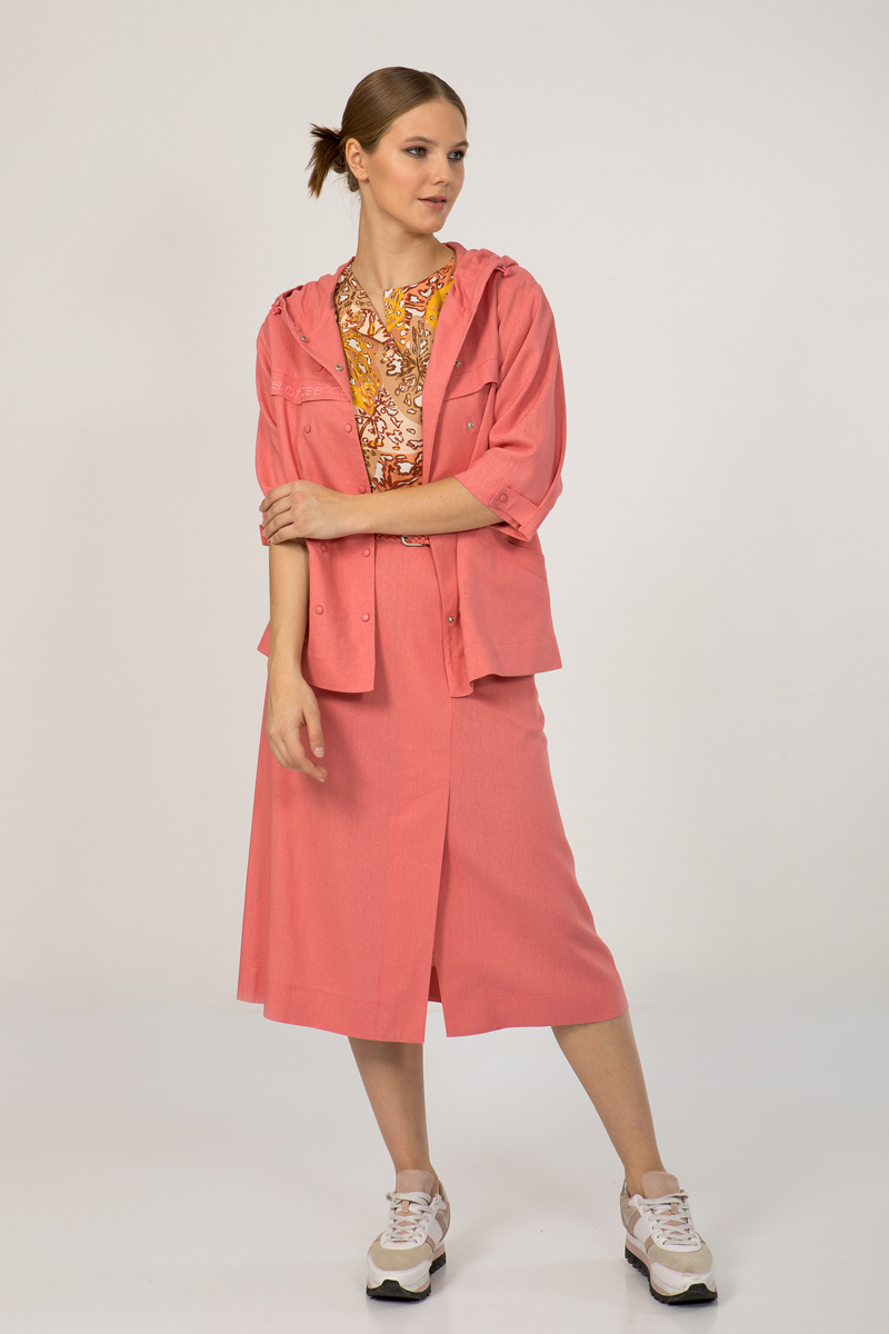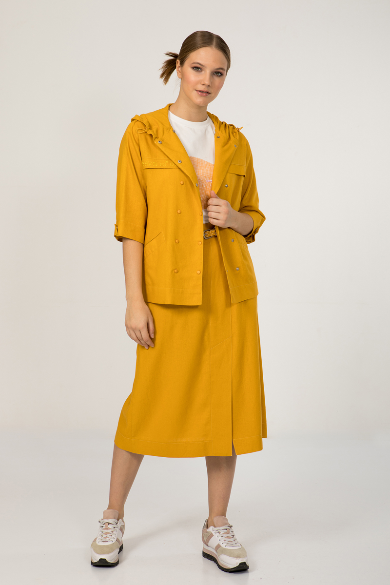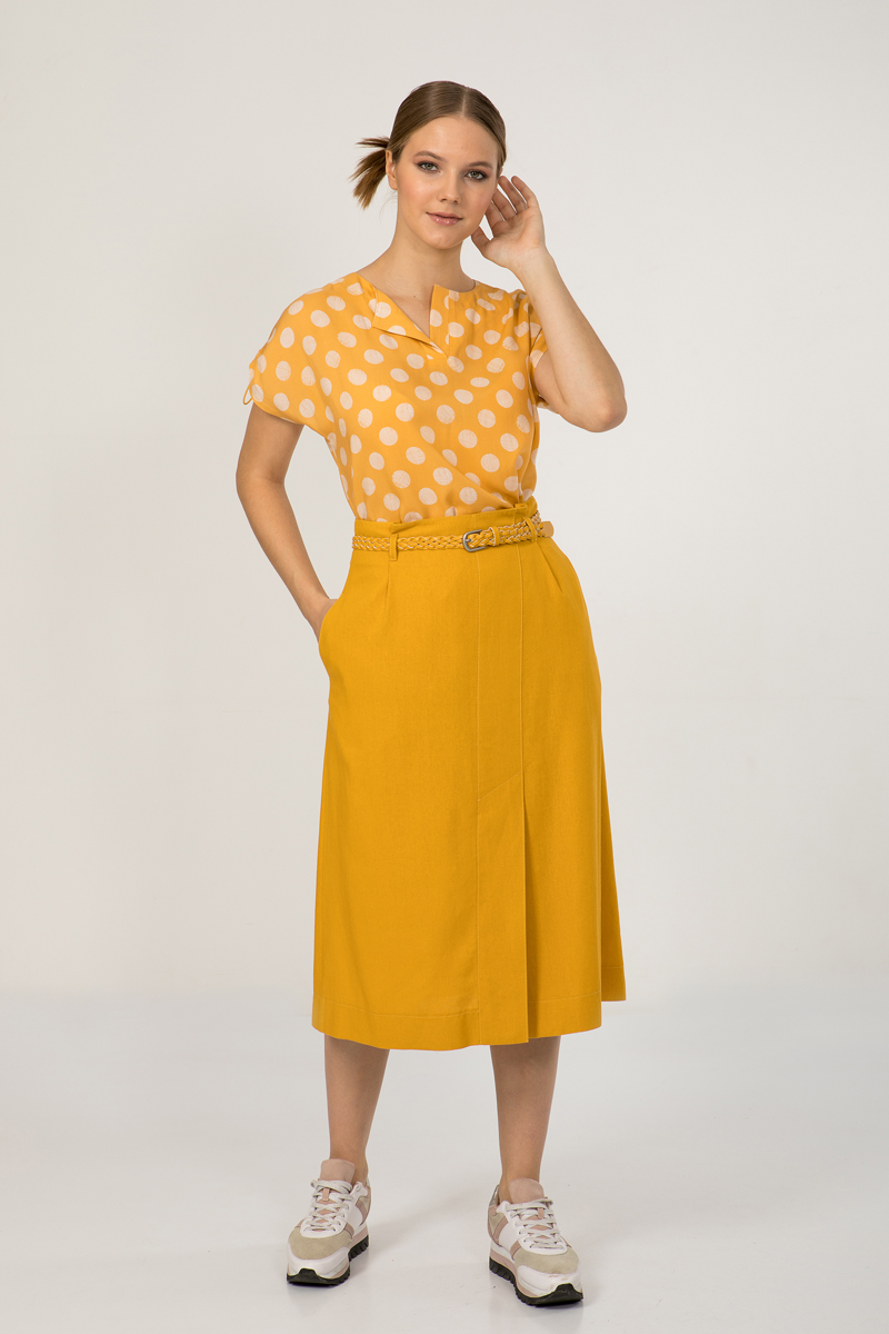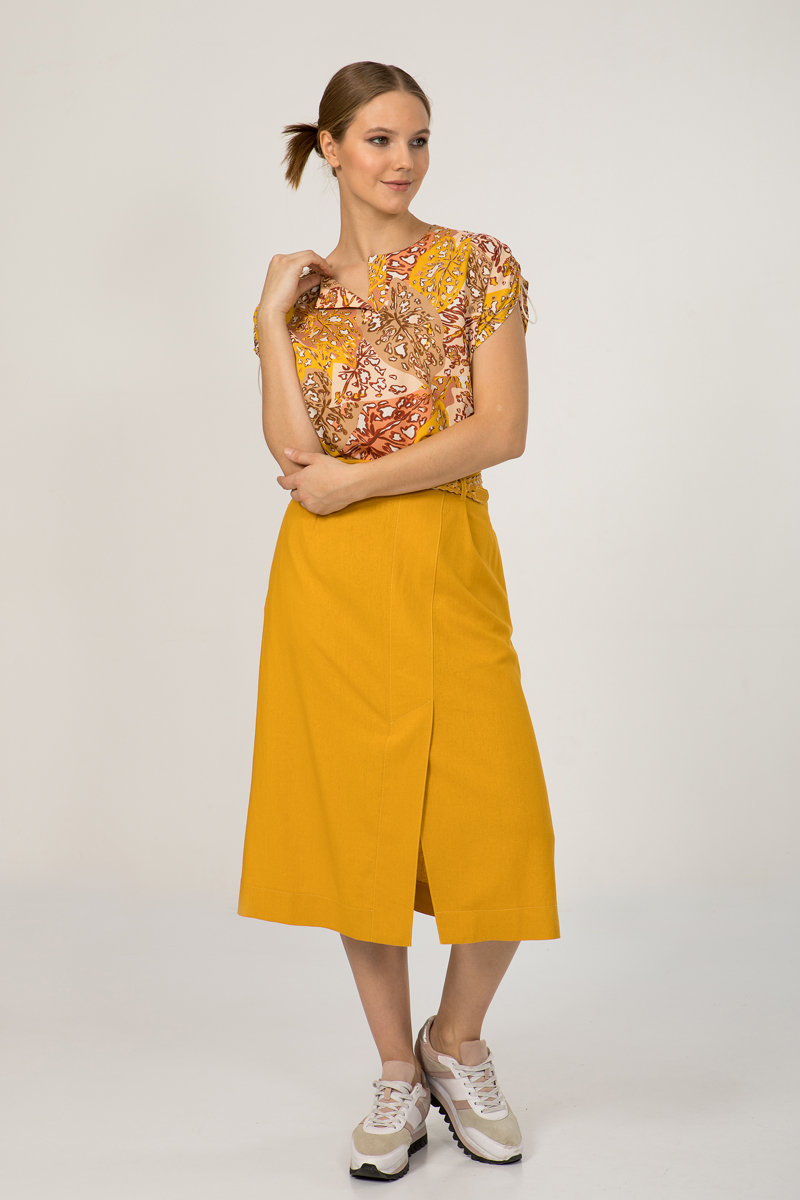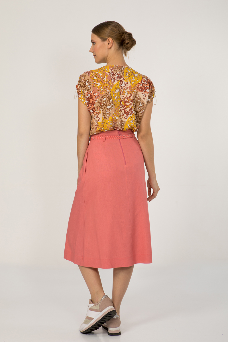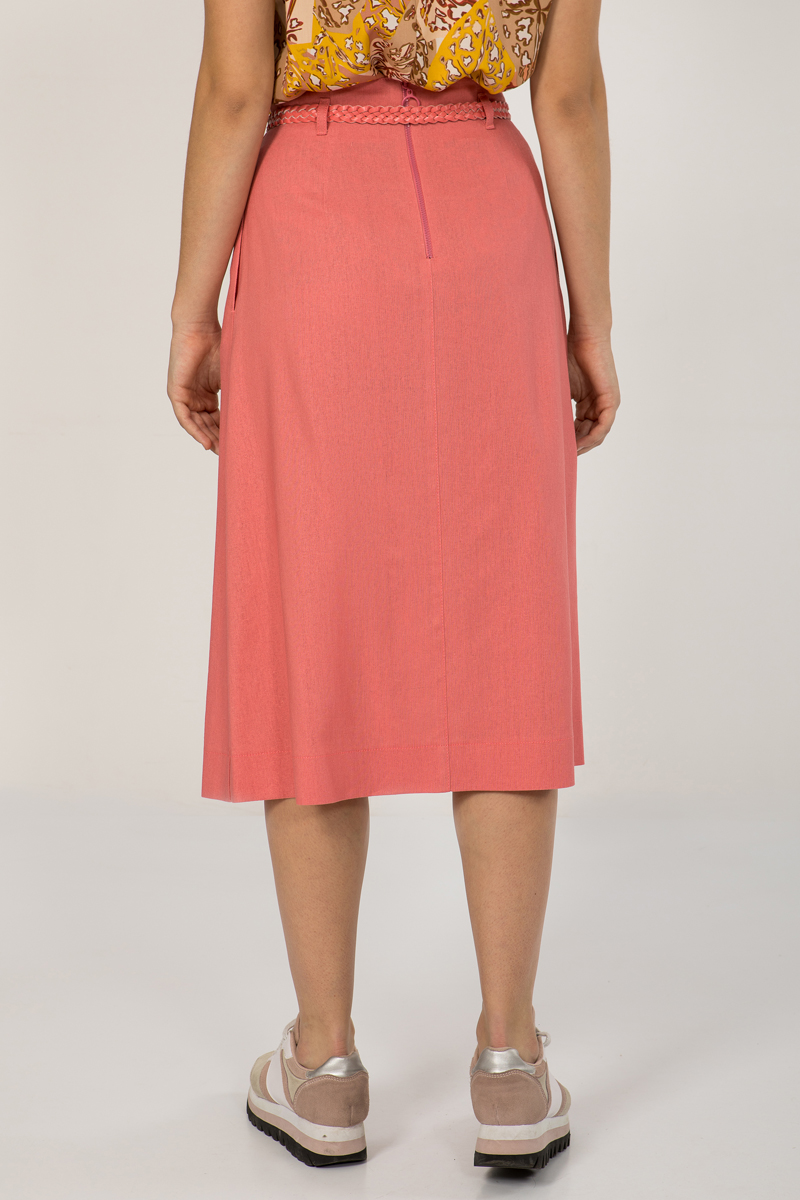 Переднее полотнище юбки ассиметричное, с защипами по талии и наклонным подрезом, который снизу заканчивается шлицей. В боковых швах карманы. Талия подчеркнута съемным плетеным ремнем с пряжкой. Юбка декорирована отделочными строчками.