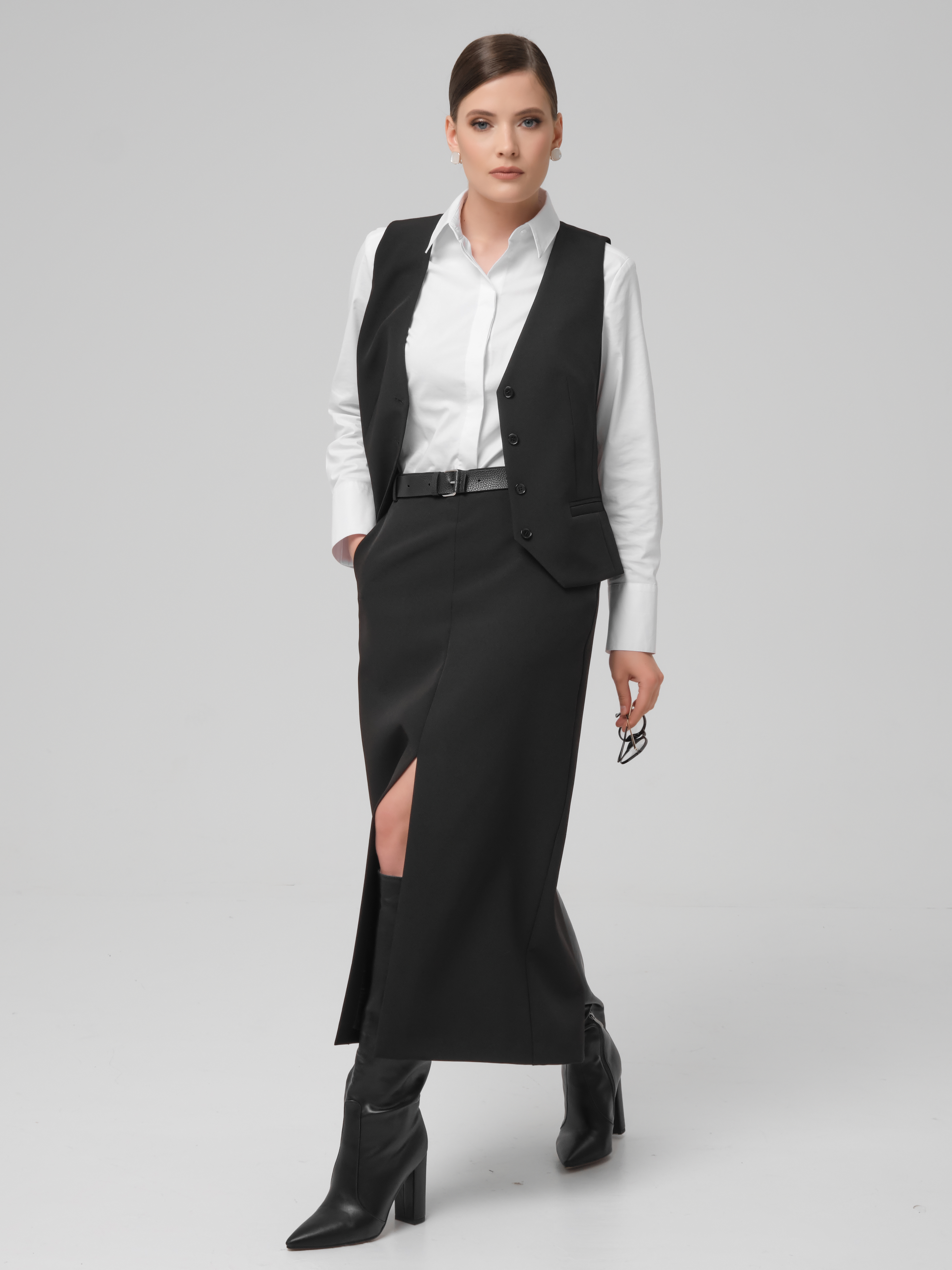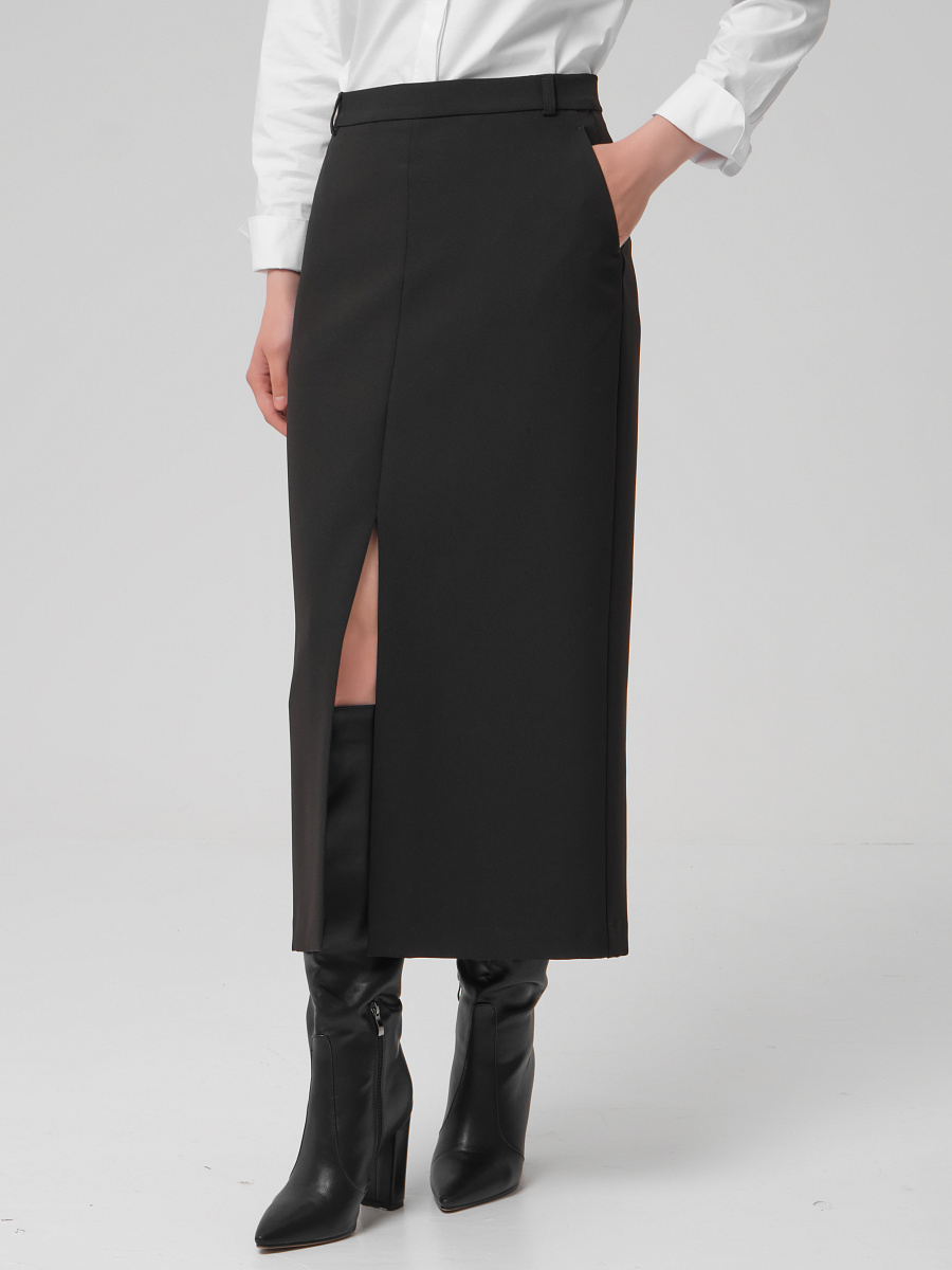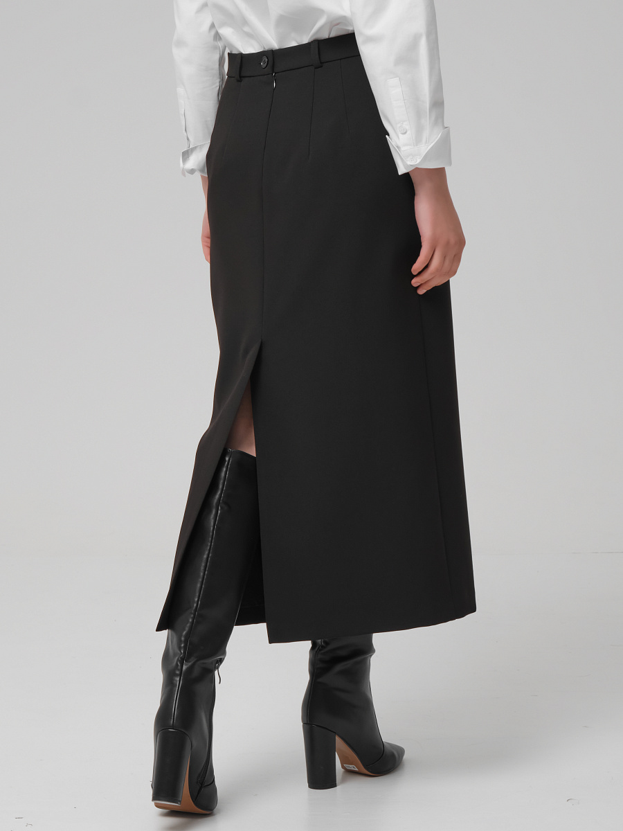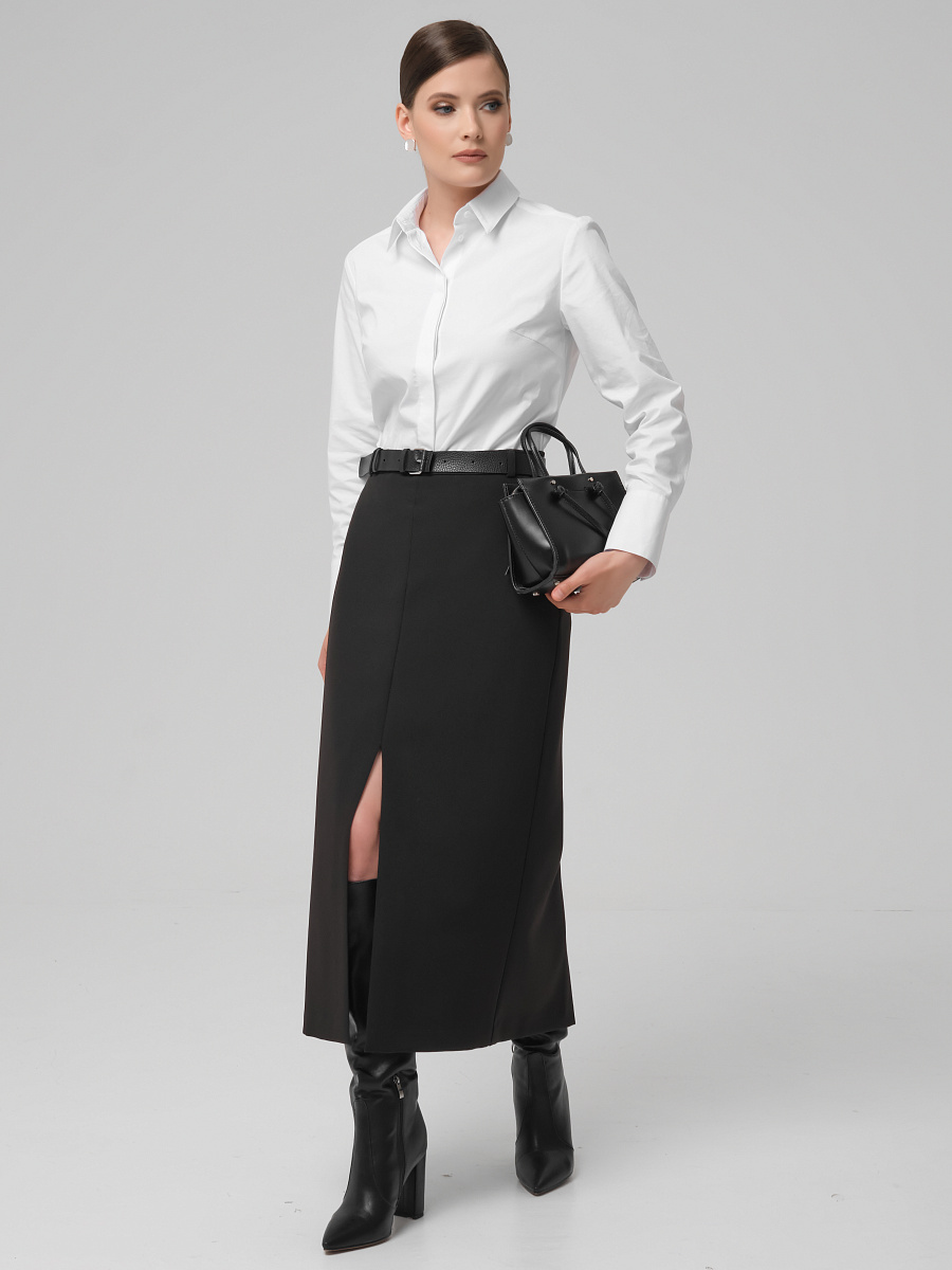 Модель прямого силуэта, на притачном поясе со шлёвками. Спереди карманы в подрезных бочках и высокий разрез в среднем шве. Сзади в среднем шве обработанана шлица и потайная застёжка молния. Ремень в комплект не входит.