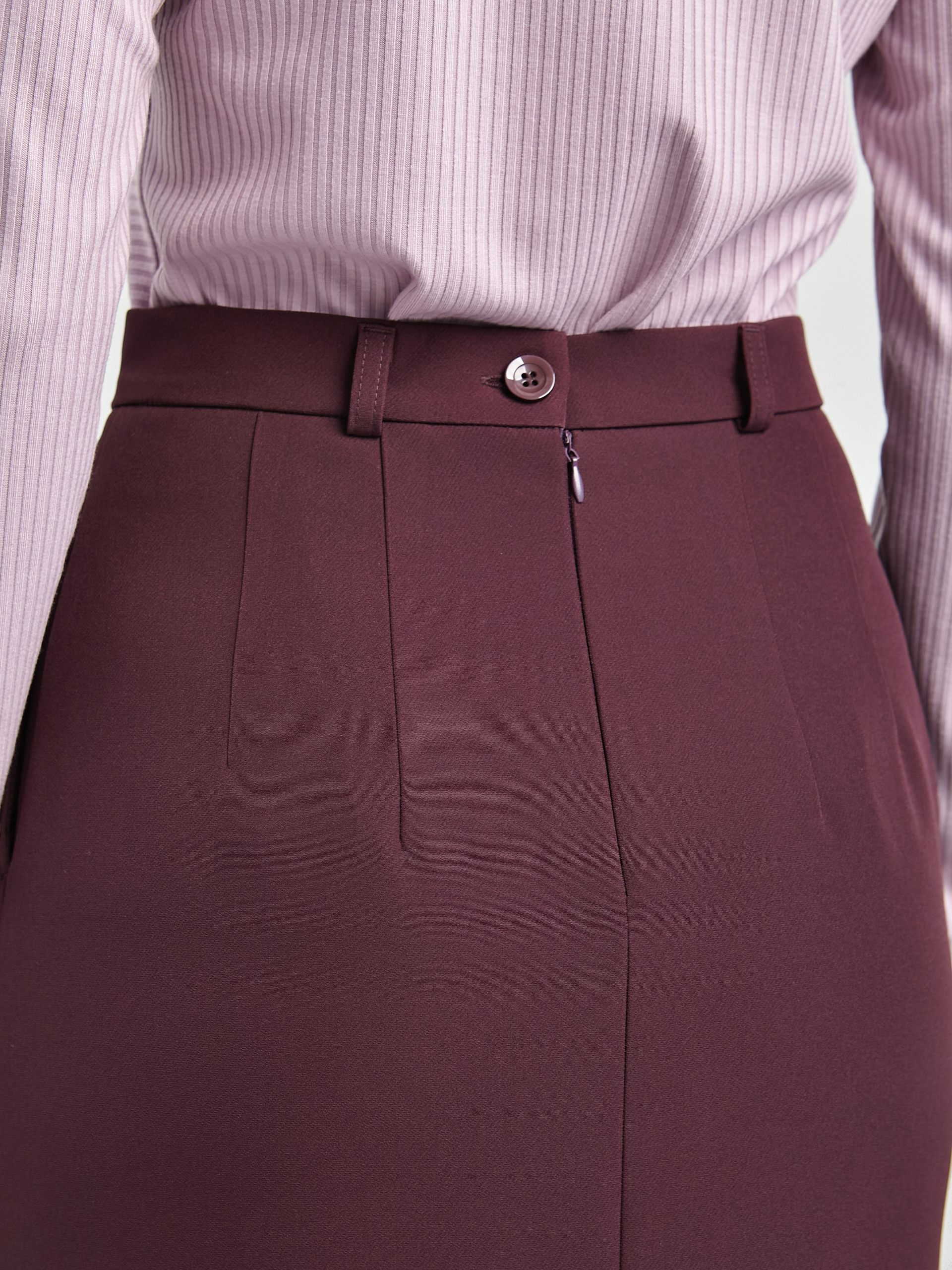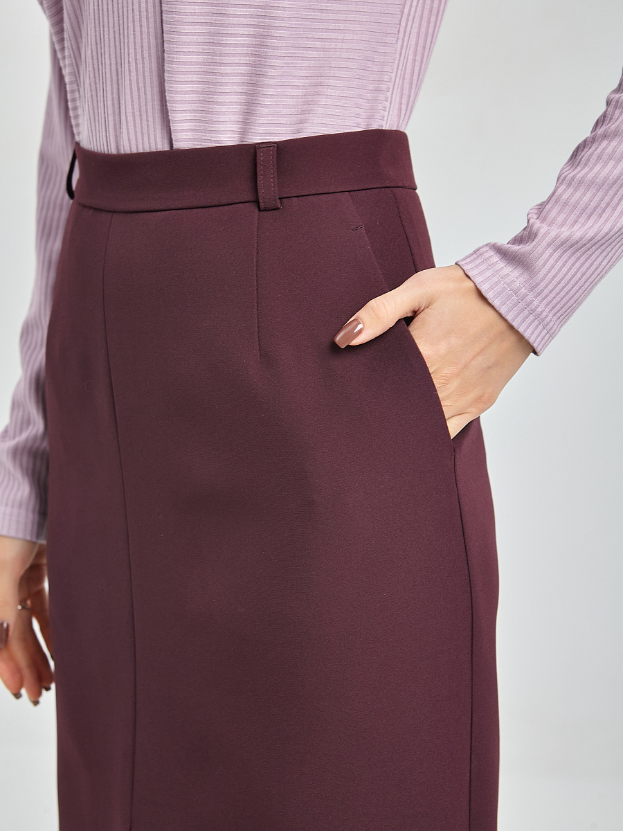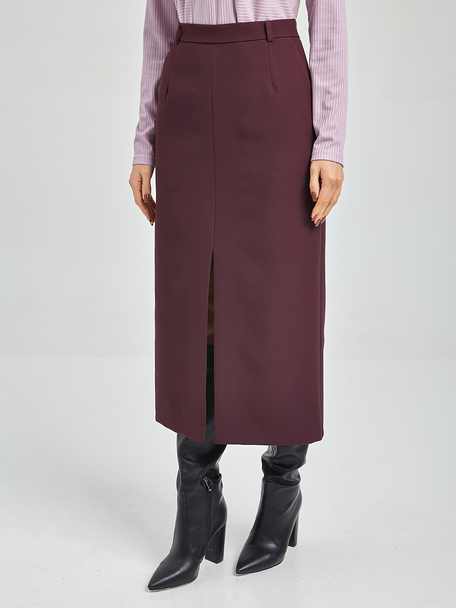 Модель прямого силуэта, на притачном поясе со шлёвками. Спереди карманы в подрезных бочках и высокий разрез в среднем шве. Сзади в среднем шве обработанана шлица и потайная застёжка молния. Ремень в комплект не входит.