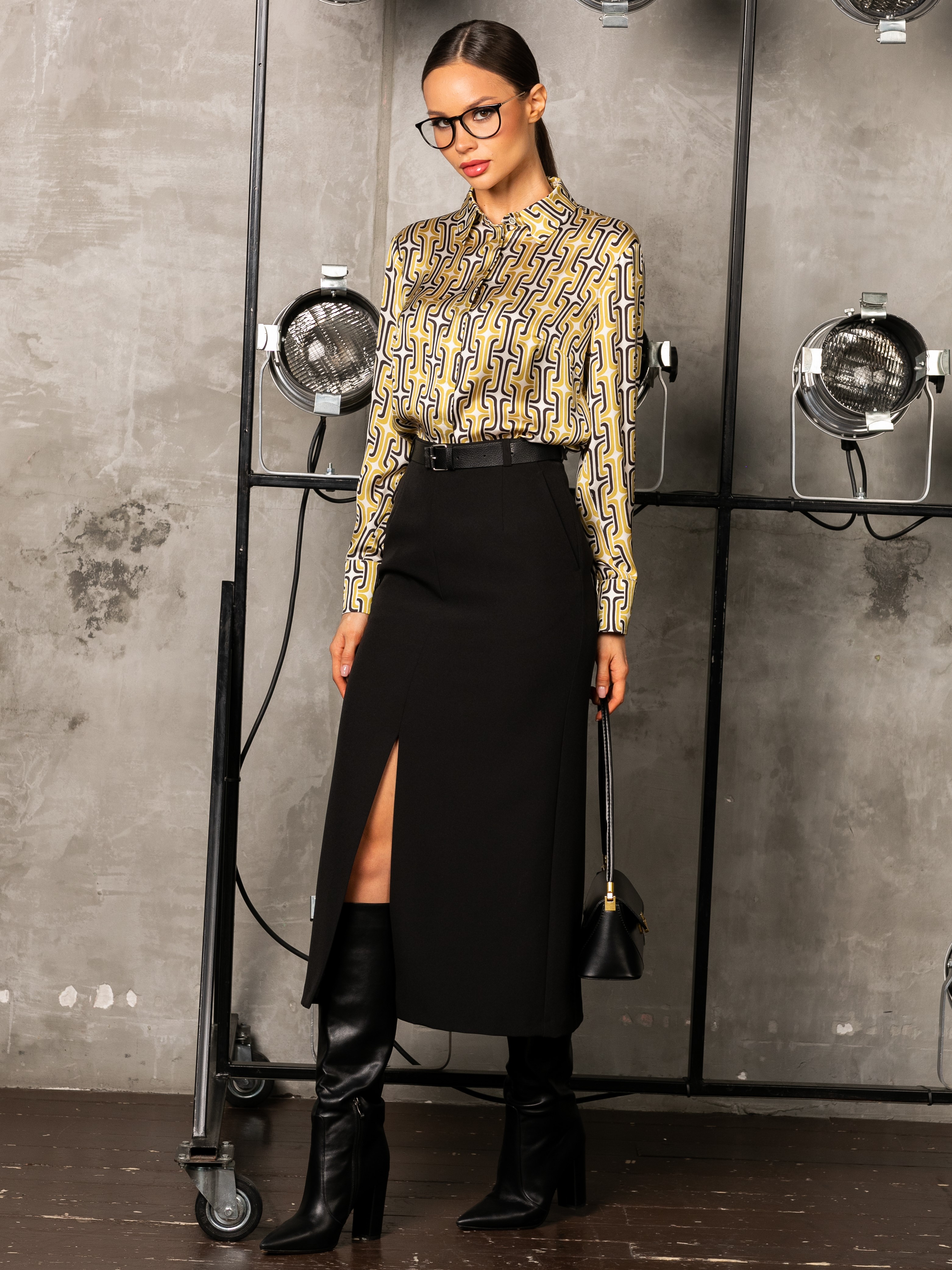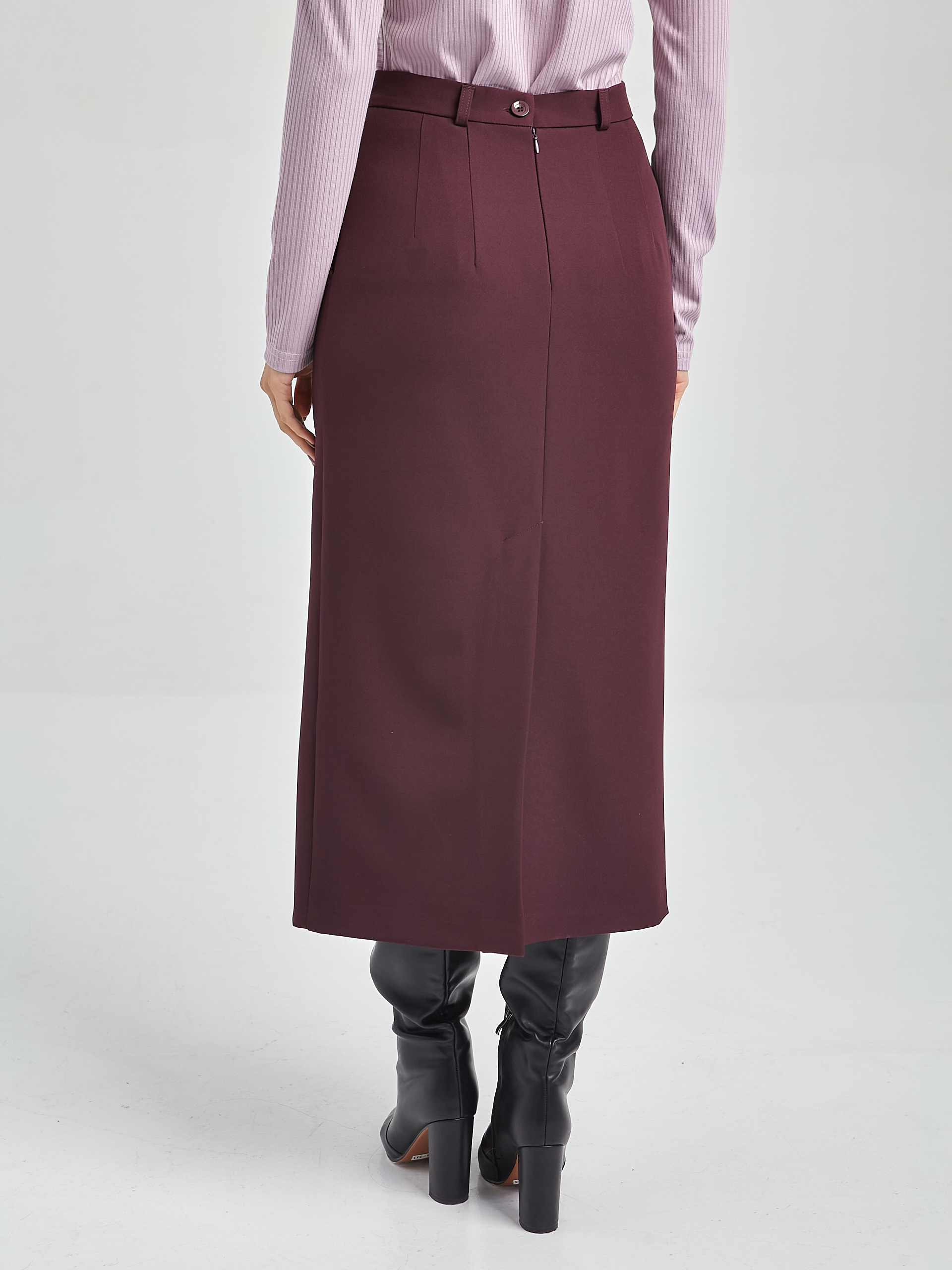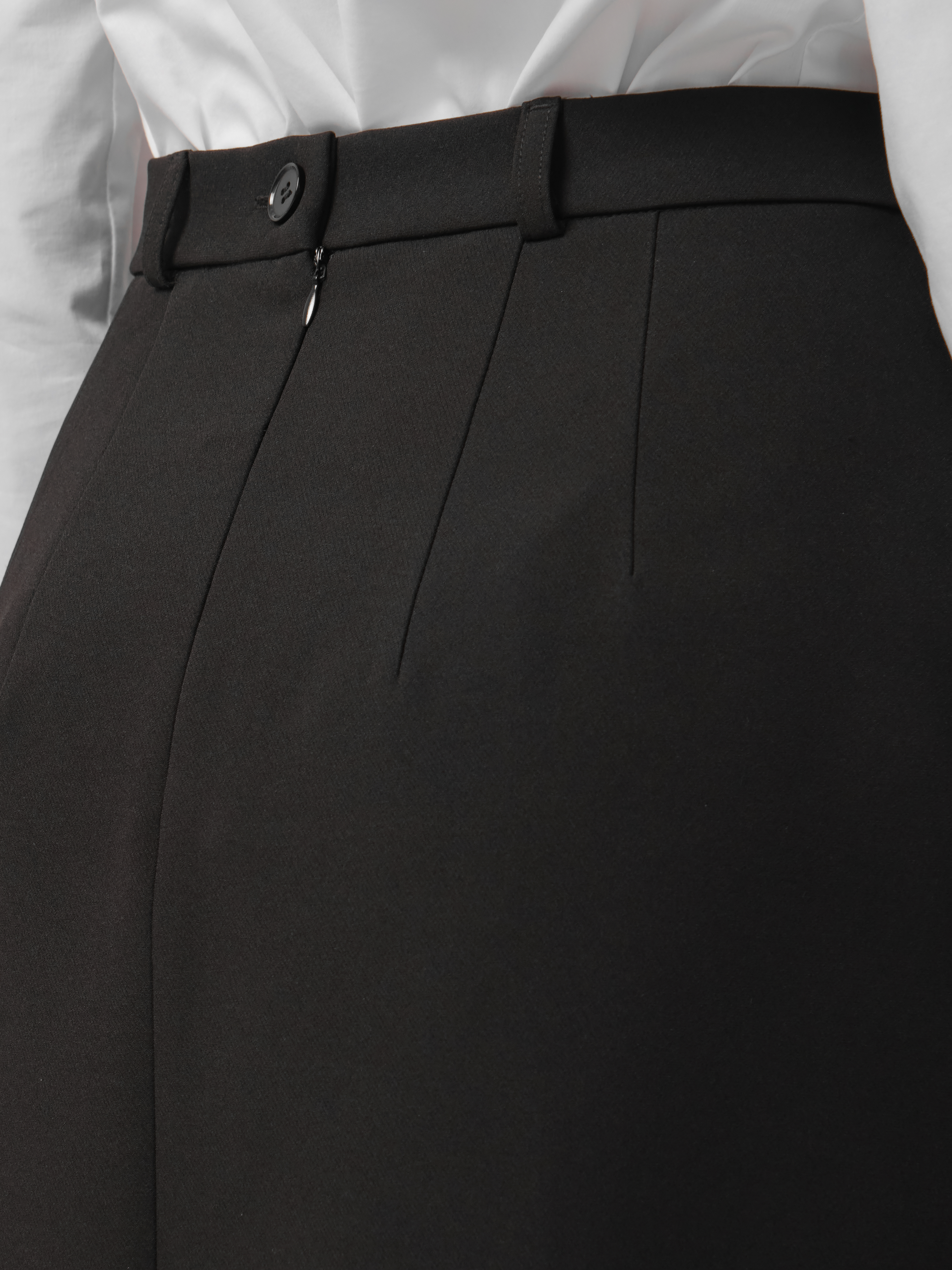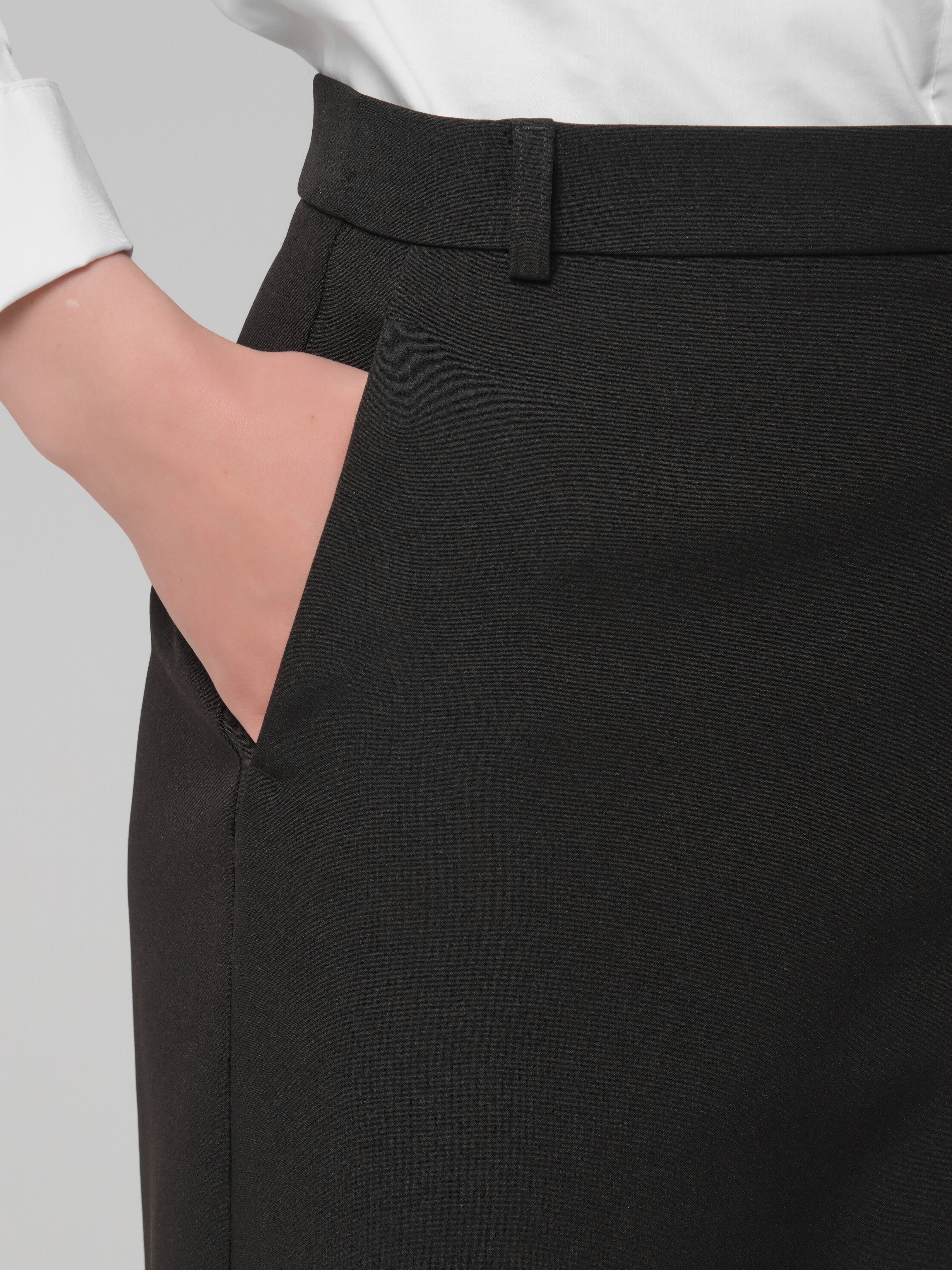 Модель прямого силуэта, на притачном поясе со шлёвками. Спереди карманы в подрезных бочках и высокий разрез в среднем шве. Сзади в среднем шве обработанана шлица и потайная застёжка молния. Ремень в комплект не входит.