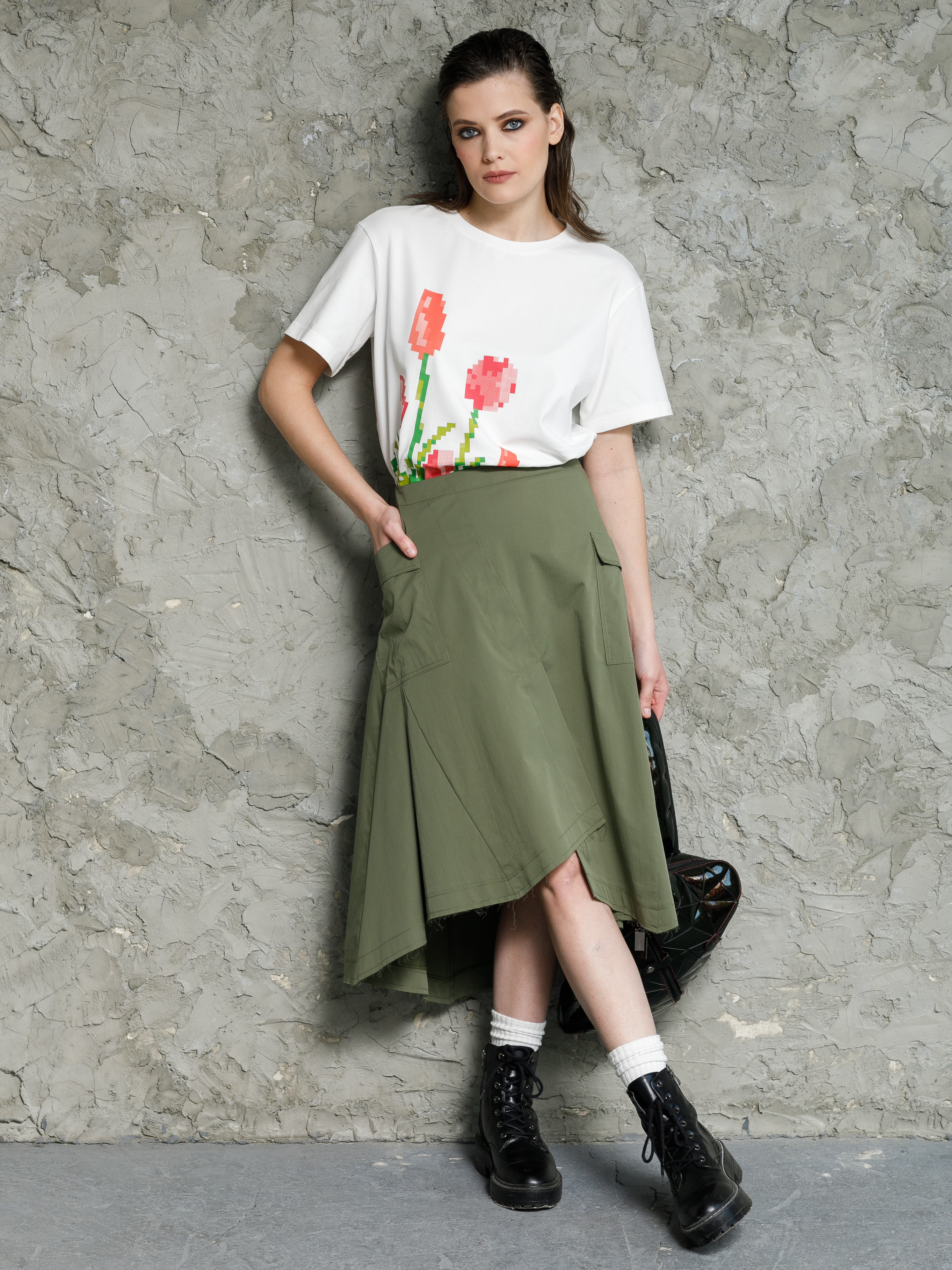 Модель А-образного силуэта. Сзади рельефы и застёжка на металлическую молнию в среднем шве. Спереди наклонные рельефы с застроченными складками. Наклонный подрез посередине с запахом. По бокам наклонные разноуровневые накладные карманы с цельнокроенными клапанами. Низ юбки обработан швами с открытыми срезами..
