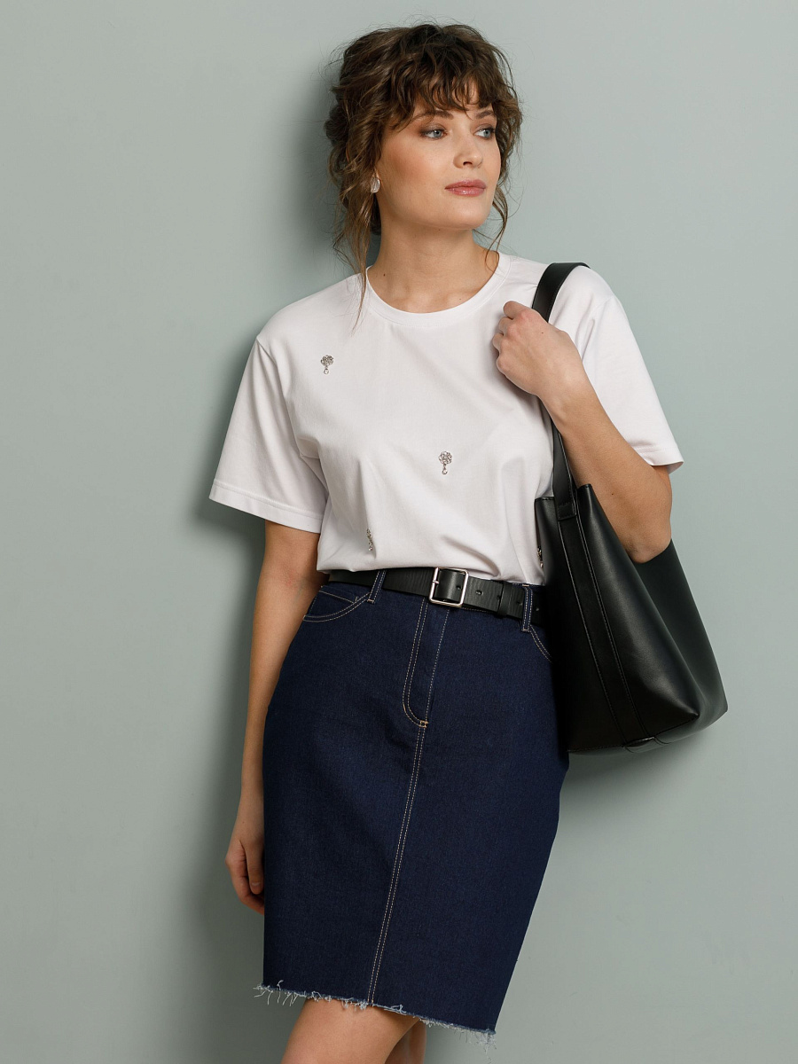 Модель прямого силуэта, без подклада. Пояс притачной, со шлёвками. Спереди карманы в подрезных бочках и застёжка в среднем шве на молнию и пуговицу на поясе. Сзади средний шов, кокетки и фигурные накладные карманы. Юбка декорирована хольнитенами и отделочными строчками. Низ изделия с необработанными срезами. Ремень в комплект не входит.