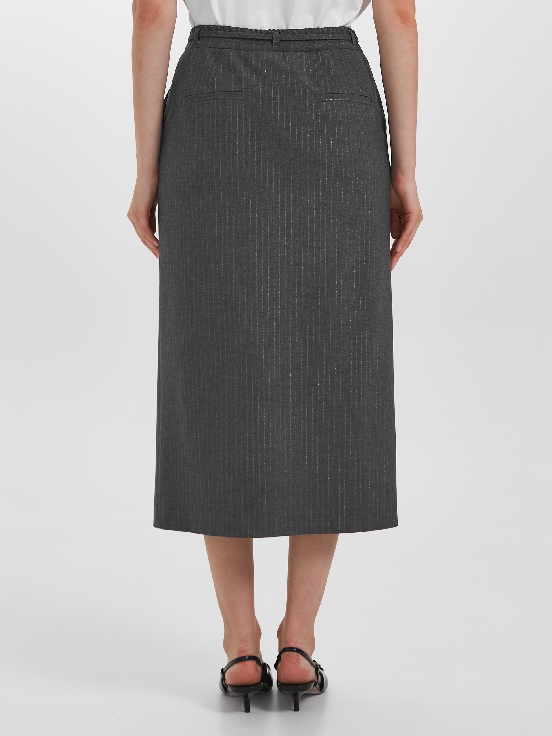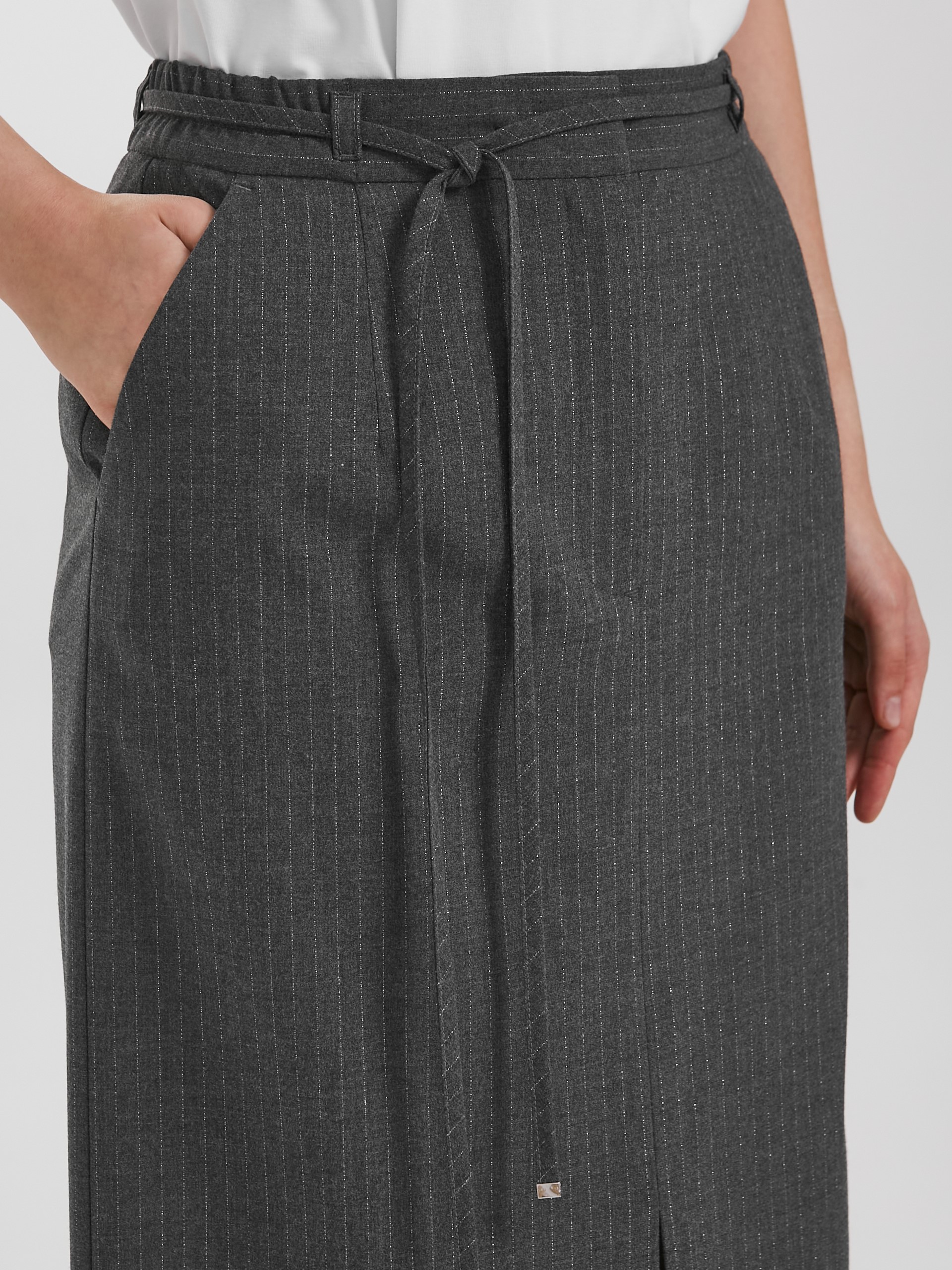 Модель прямого силуэта, на подкладе. Пояс притачной, с резиной и шлёвками. Спереди карманы в подрезных бочках и высокий разрез в среднем шве. Застёжка на молнию и крючки с пуговицей на поясе. Сзади прорезные карманы с листочкой. В шлёвки вставлен пояс-шнурок с наконечниками.
