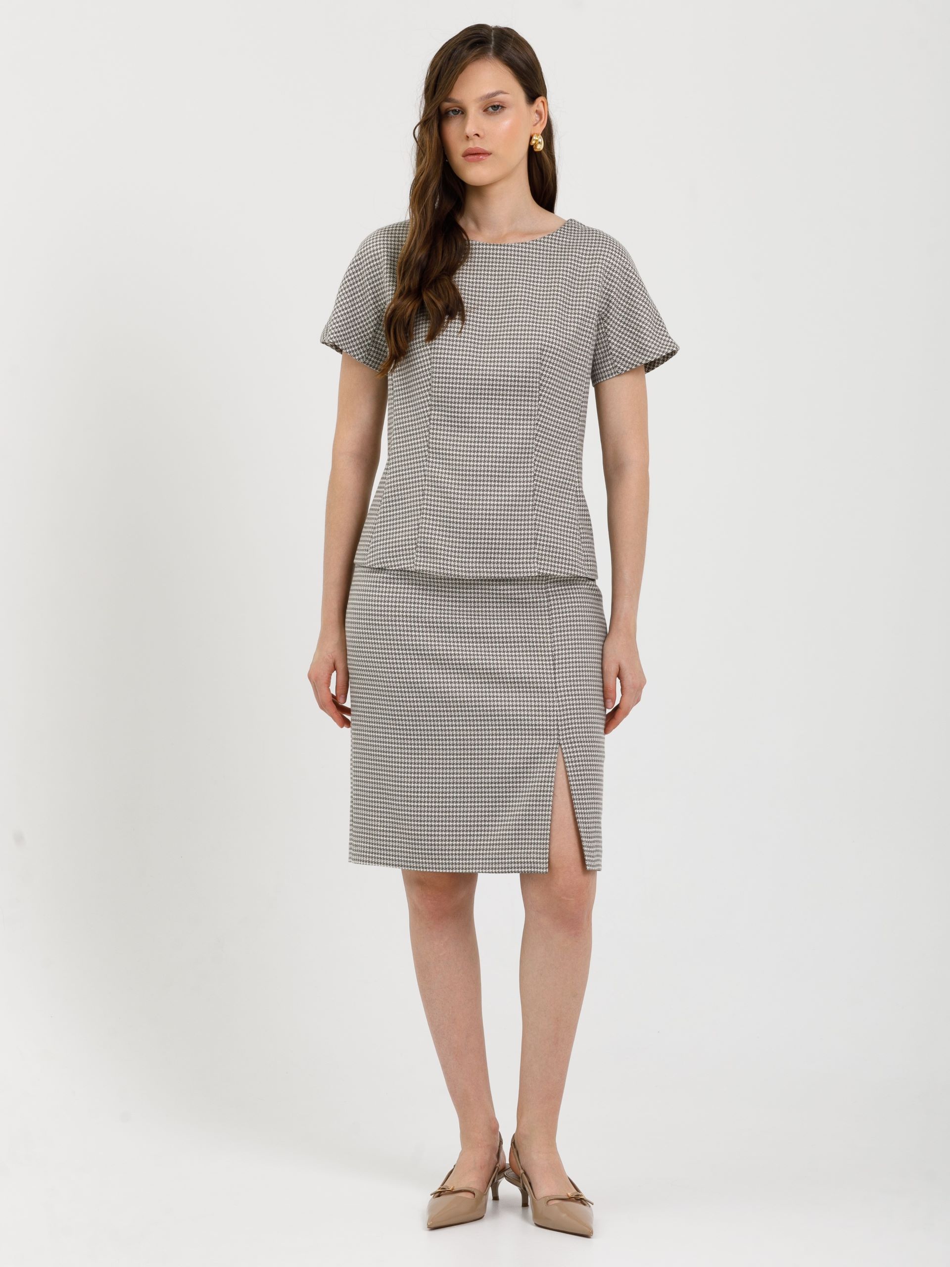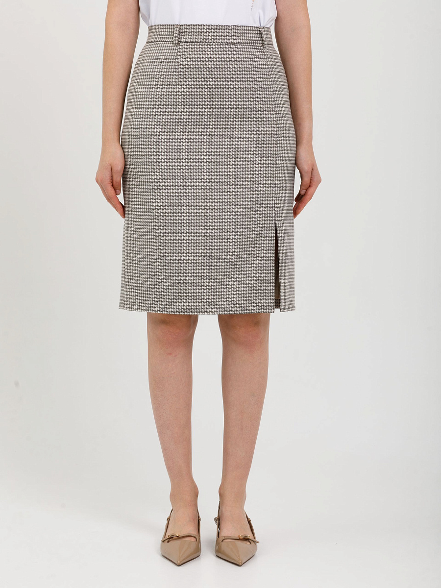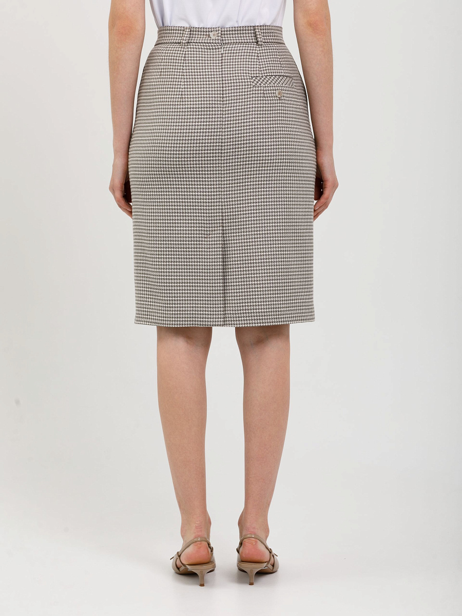 Модель прямого силуэта, на подкладе и притачном поясе со шлёвками. Спереди в рельефе высокий разрез. Сзади прорезной карман с листочкой и застёжкой на пуговицу. В среднем шве обработаны шлица и застёжка на потайную молнию и пуговицу на поясе. Ремень в комплект не входит.