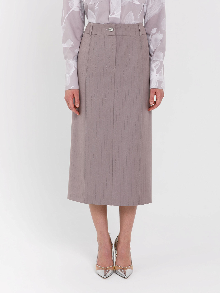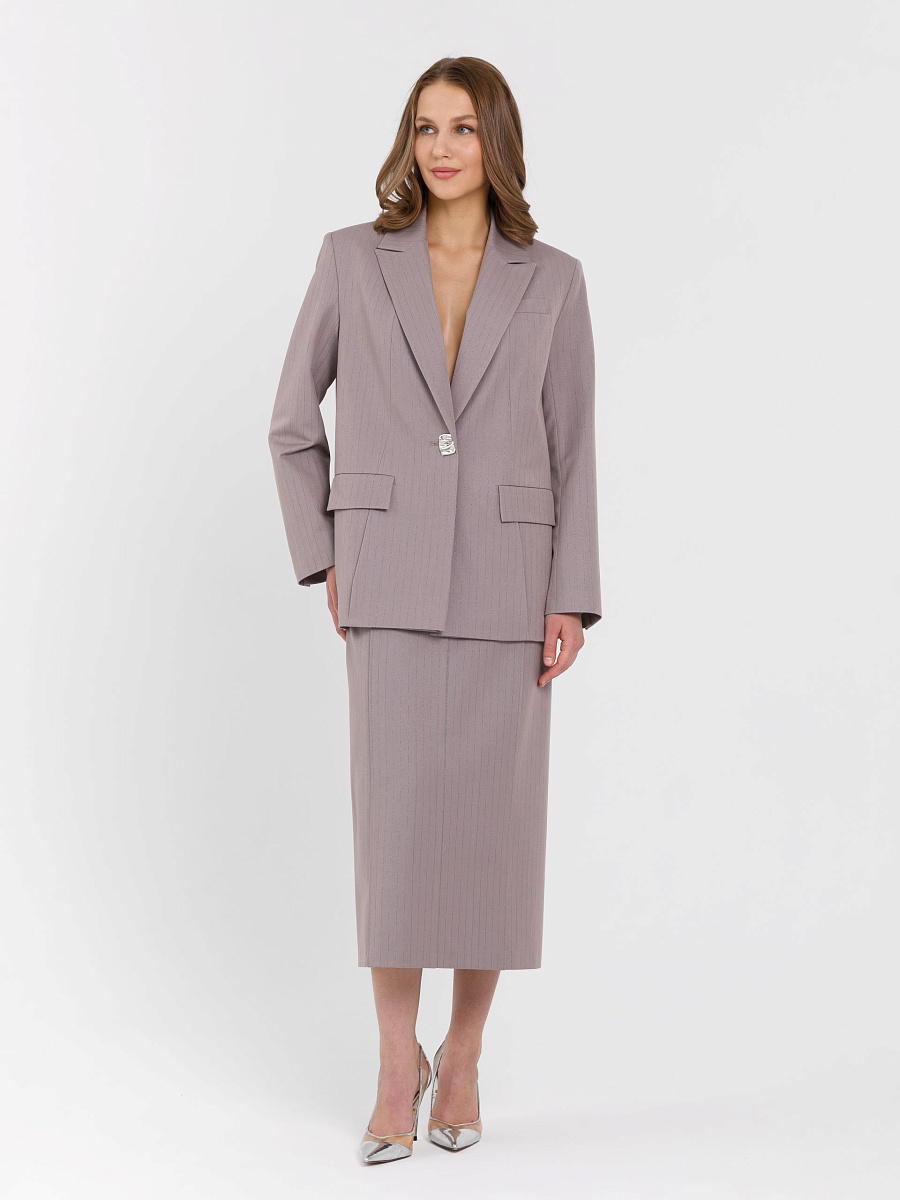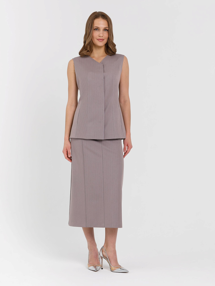 Модель прямого силуэта, на кокетке, с застроченными рельефами, без боковых швов, со шлёвками, на подкладе. Спереди в среднем шве застёжка на молнию и пуговицу на кокетке. Сзади средний шов заканчивется шлицей.