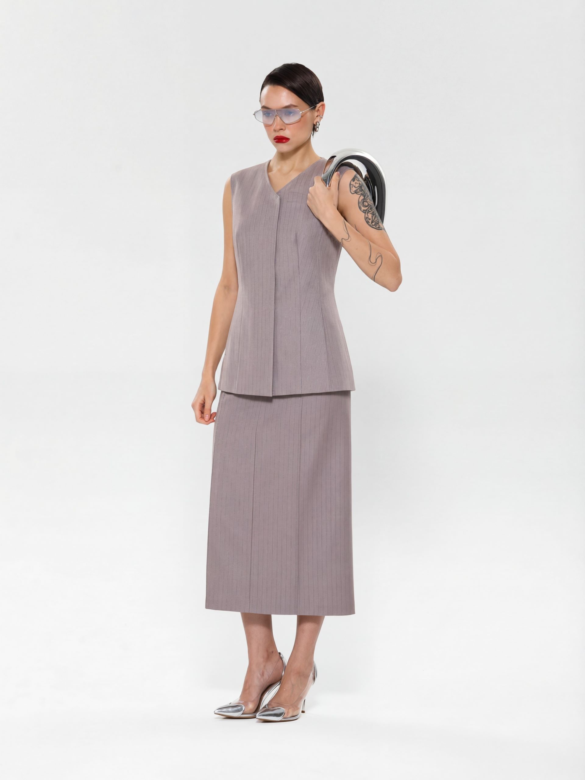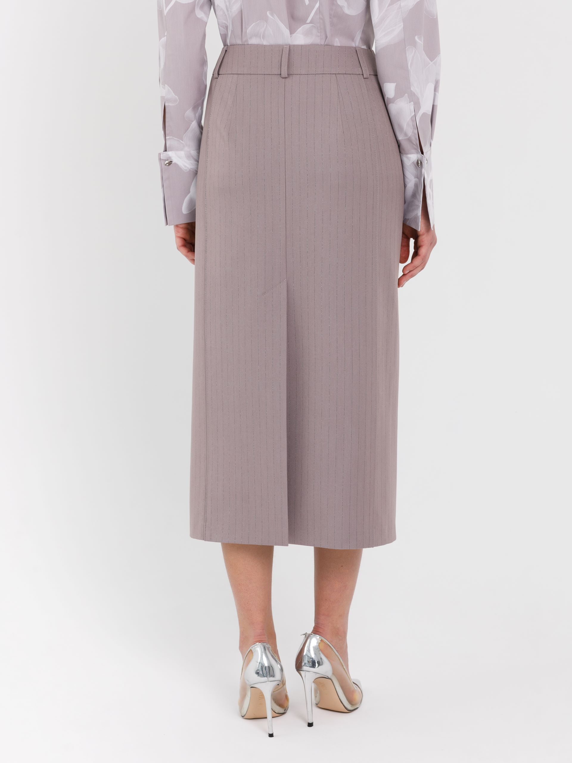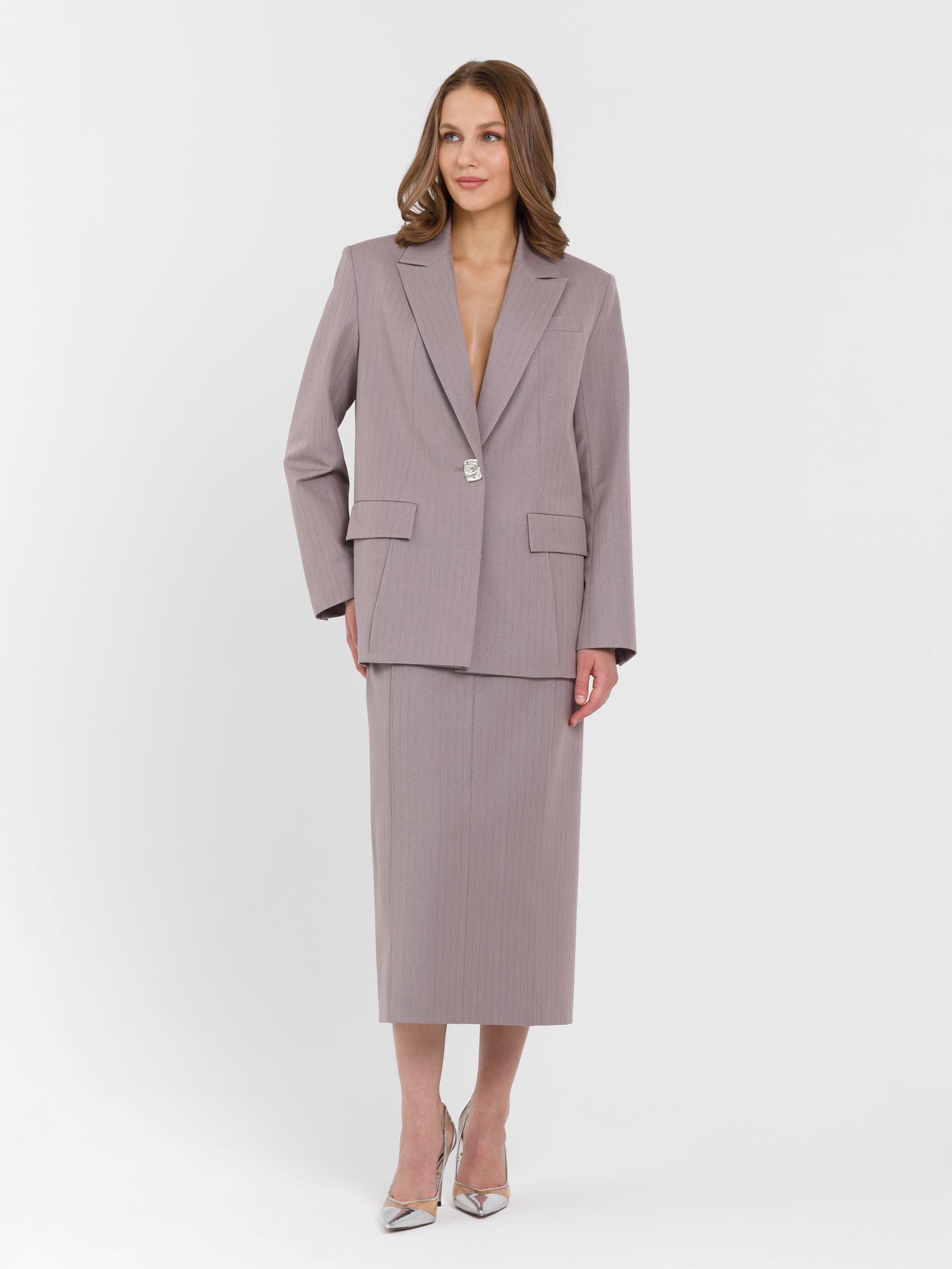 Модель прямого силуэта, на кокетке, с застроченными рельефами, без боковых швов, со шлёвками, на подкладе. Спереди в среднем шве застёжка на молнию и пуговицу на кокетке. Сзади средний шов заканчивется шлицей.