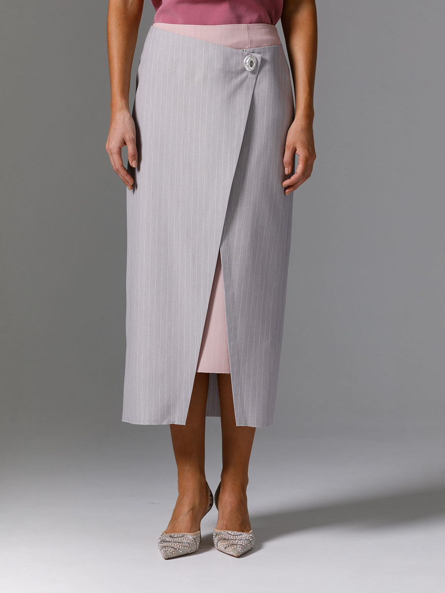 Модель прямого силуэта, без подклада. Сзади в среднем шве обработана потайная застёжка молния и шлица. Перед комбинированный, с имитацией запаха. Низ разноуровневый. Юбка декорирована брошью и швами с открытыми срезами.