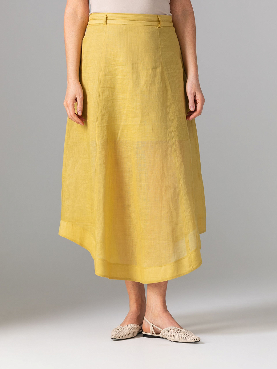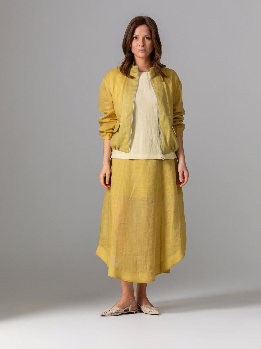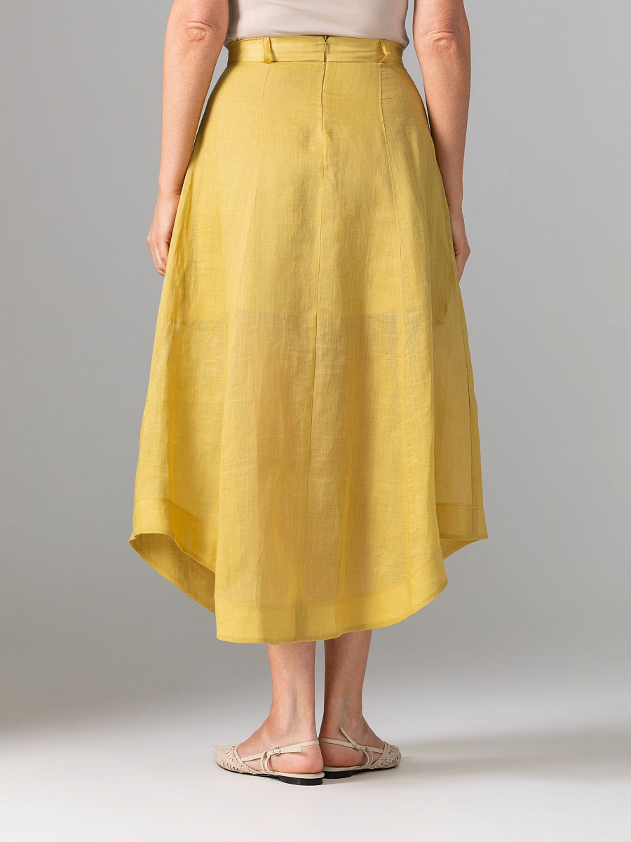 Модель А-силуэта, на подкладе изо льна, с рельефами и фигурной линией низа. Пояс комбинированный, со шлёвками, спереди декоративная окантовка, сзади частичная сборка на резину. В среднем шве спинки потайная застёжка молния.