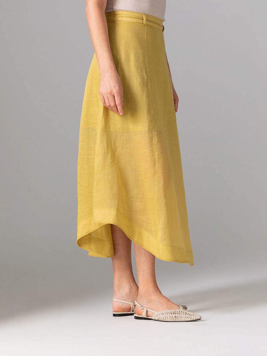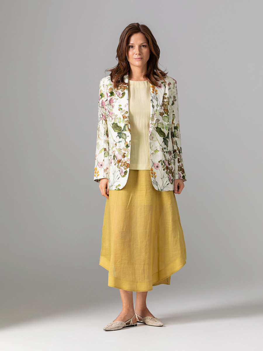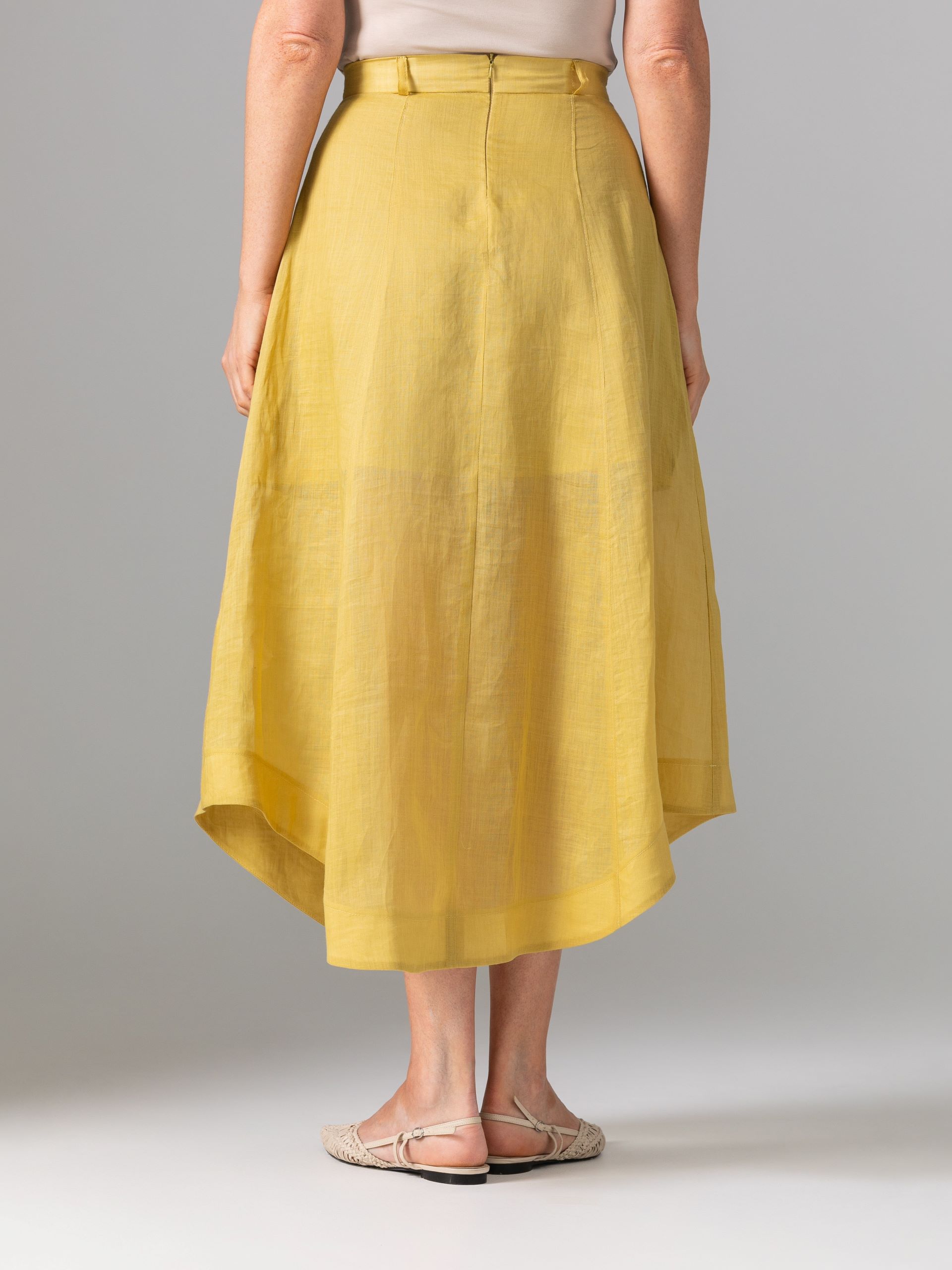 Модель А-силуэта, на подкладе изо льна, с рельефами и фигурной линией низа. Пояс комбинированный, со шлёвками, спереди декоративная окантовка, сзади частичная сборка на резину. В среднем шве спинки потайная застёжка молния.
