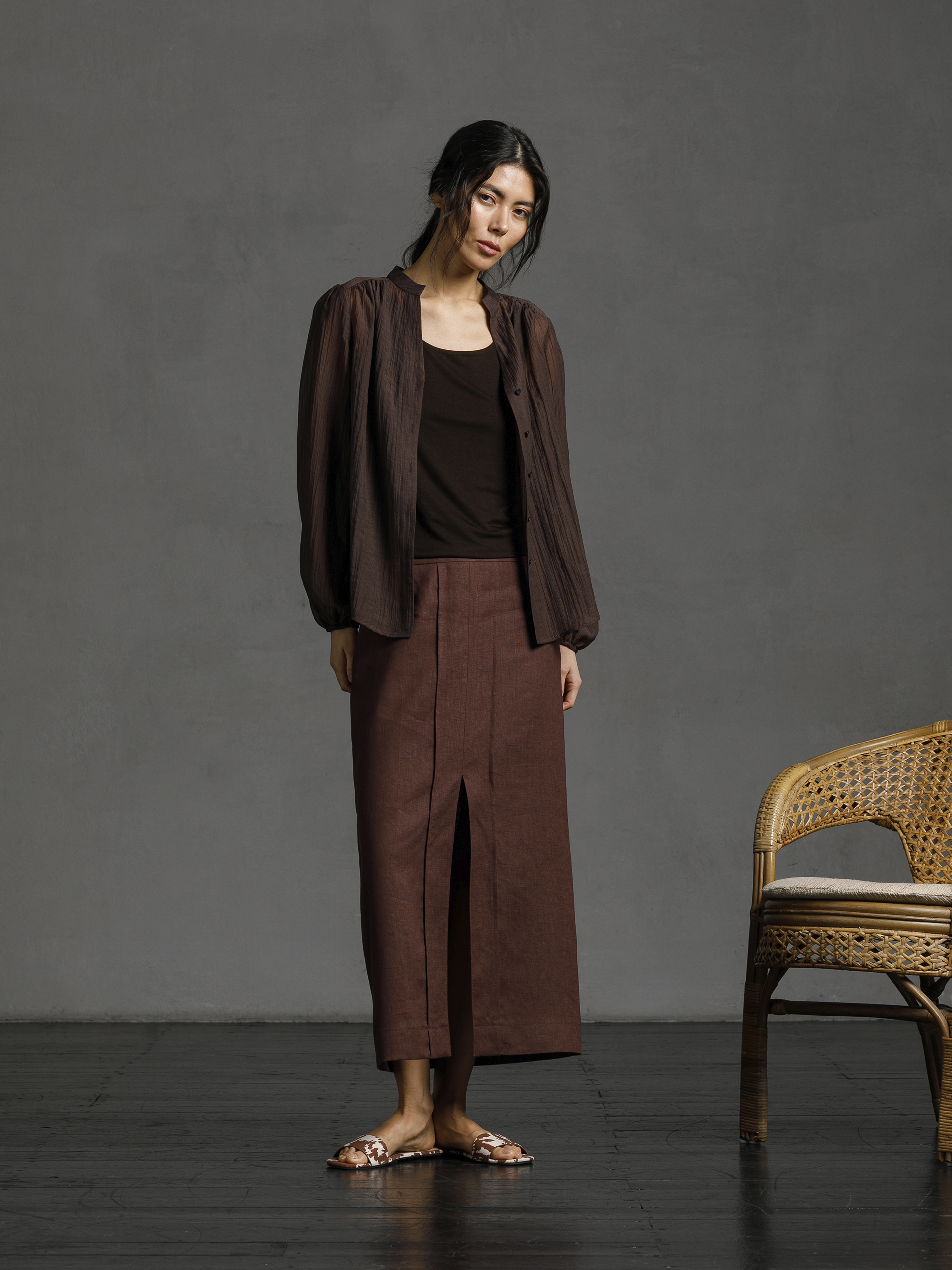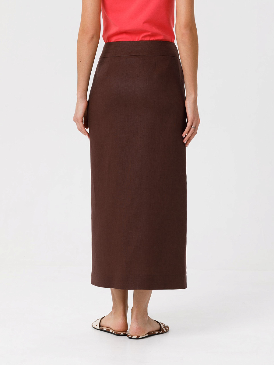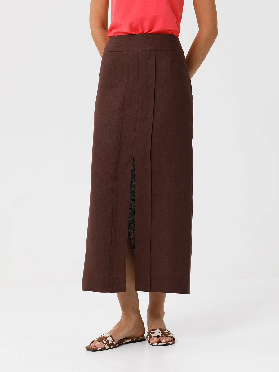 Модель прямого силуэта, на кокетке, без подклада. В левом боковом шве потайная застёжка молния. Спереди вертиральные подрезы, средний шов снизу заканчивается разрезом. Юбка декорирована отделочными строчками.