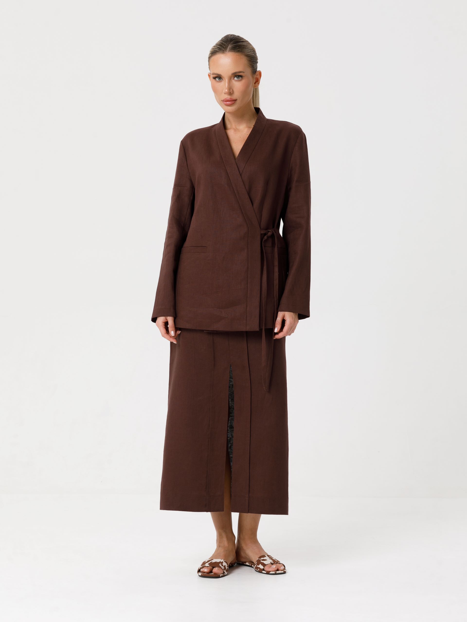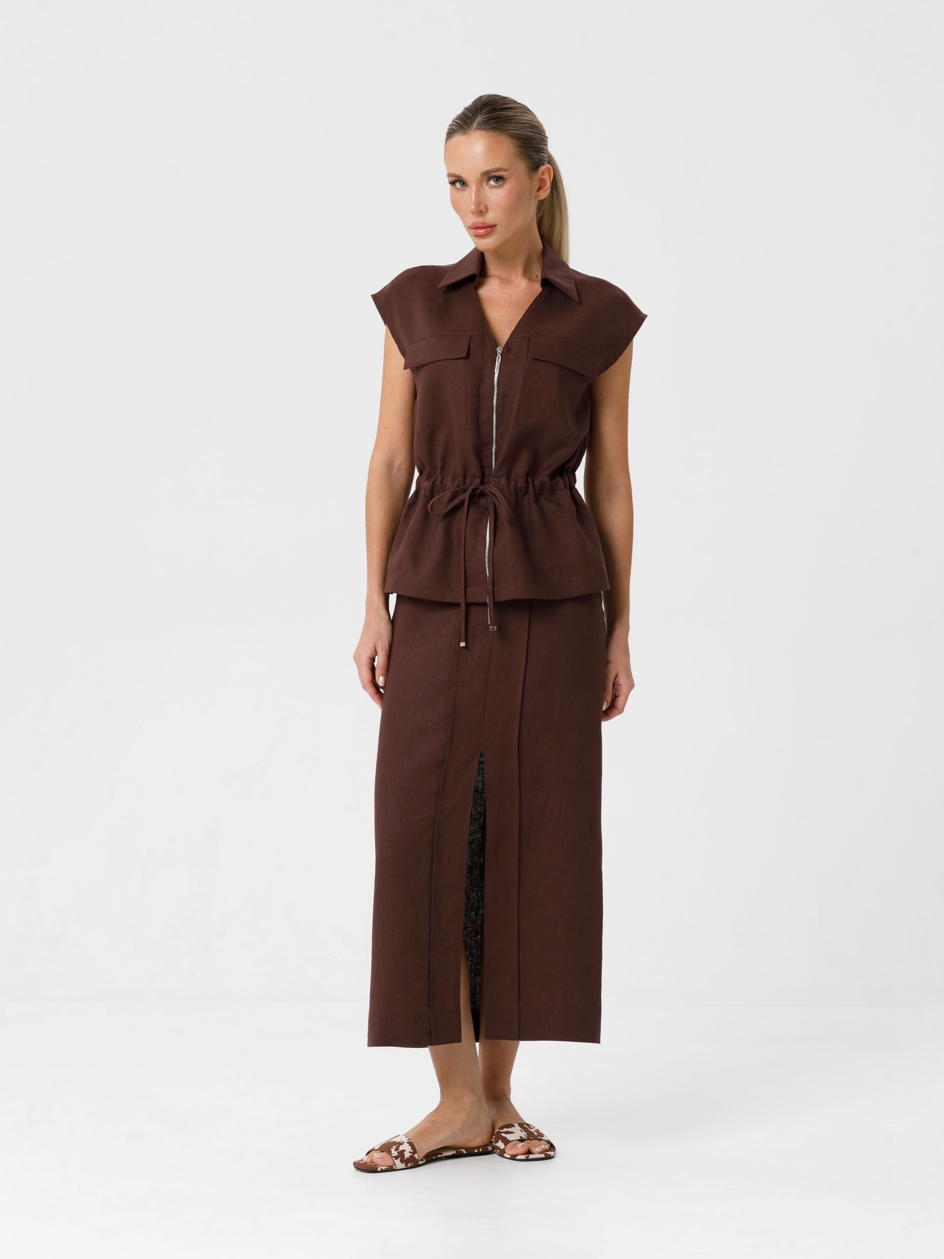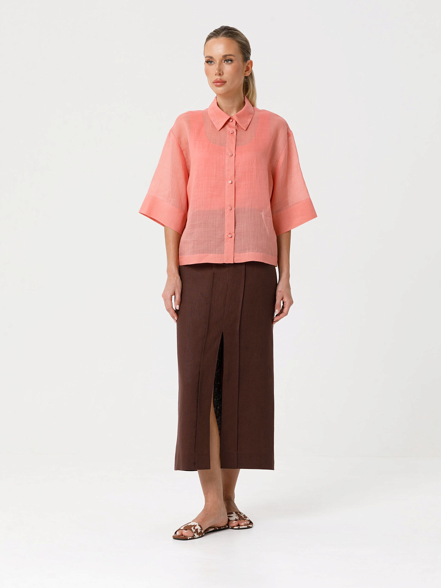 Модель прямого силуэта, на кокетке, без подклада. В левом боковом шве потайная застёжка молния. Спереди вертиральные подрезы, средний шов снизу заканчивается разрезом. Юбка декорирована отделочными строчками.