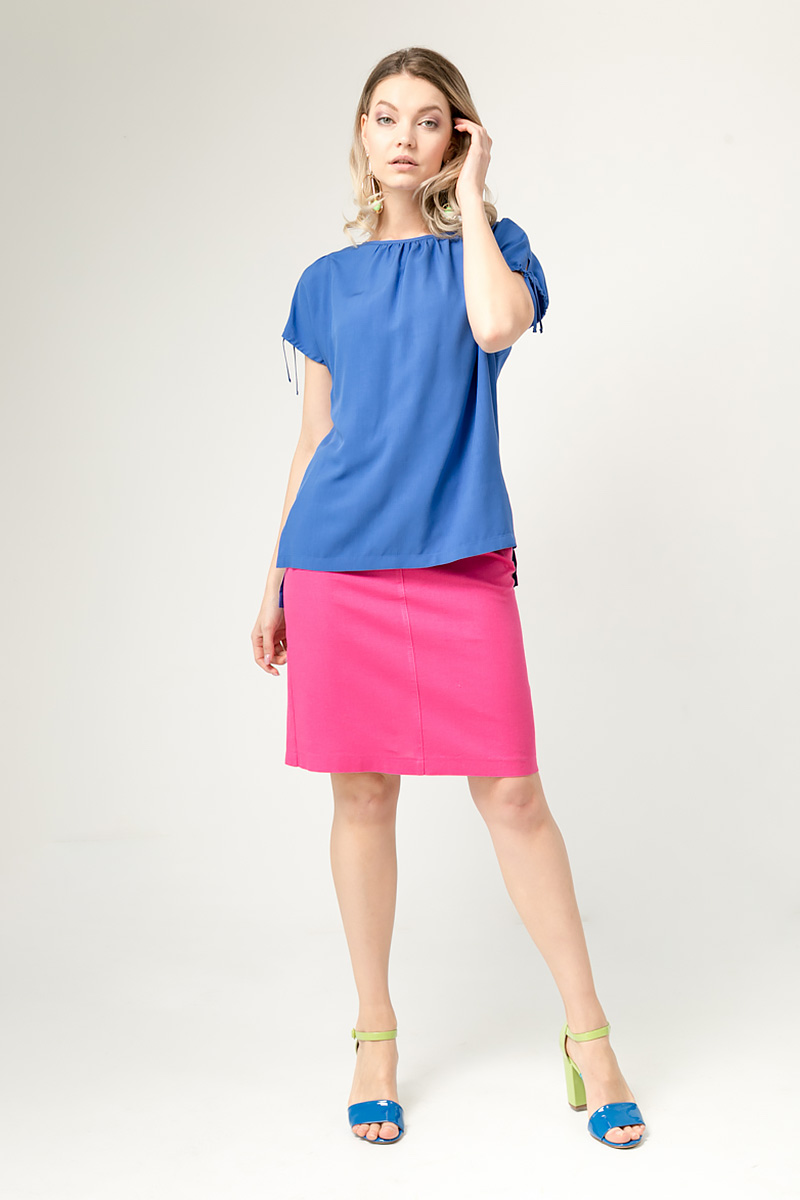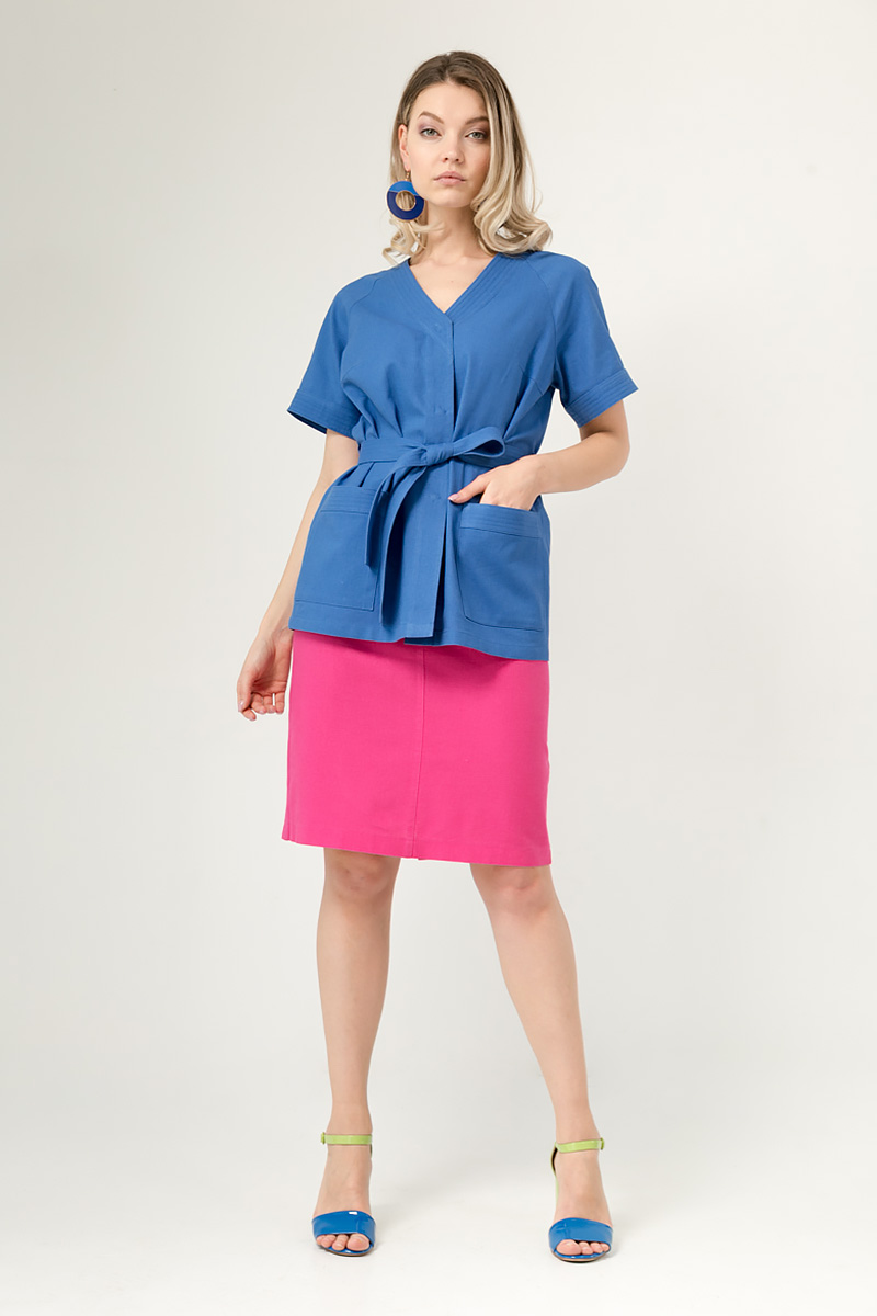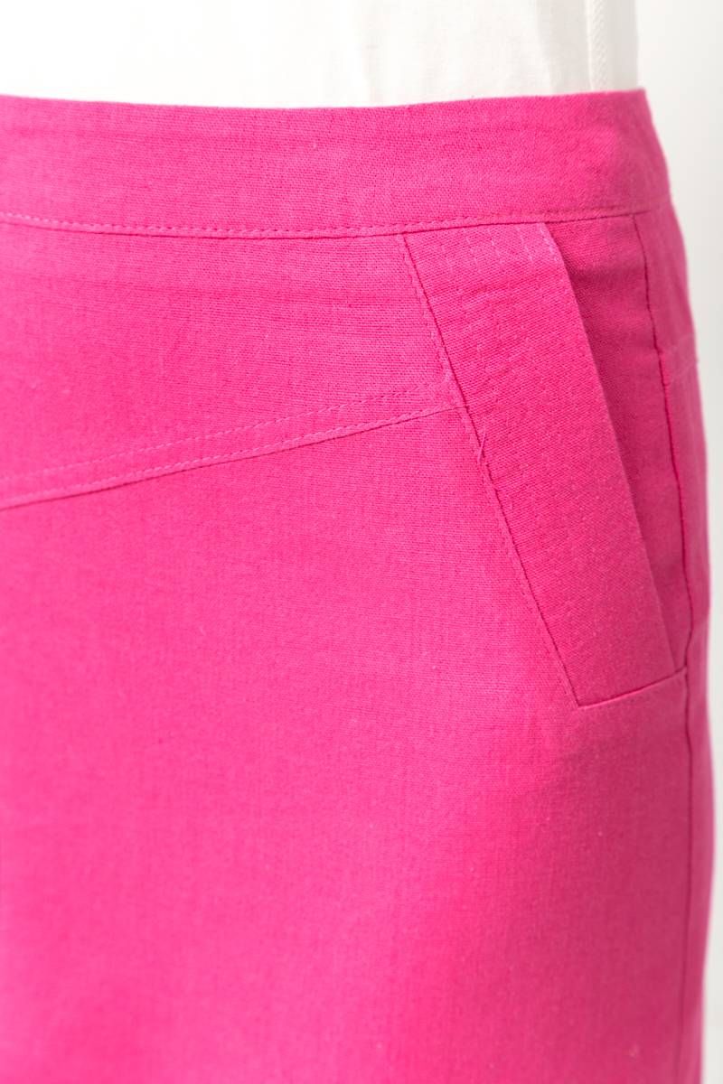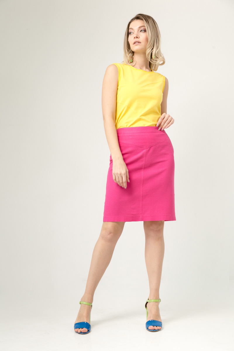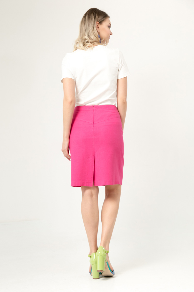 Переднее полотнище юбки с фигурной кокеткой и средним швом. В подрезных бочках имитация карманов с широкой листочкой. Заднее полотнище с кокетками и средним швом, который снизу заканчивается шлицей. Юбка декорирована отделочными строчками.