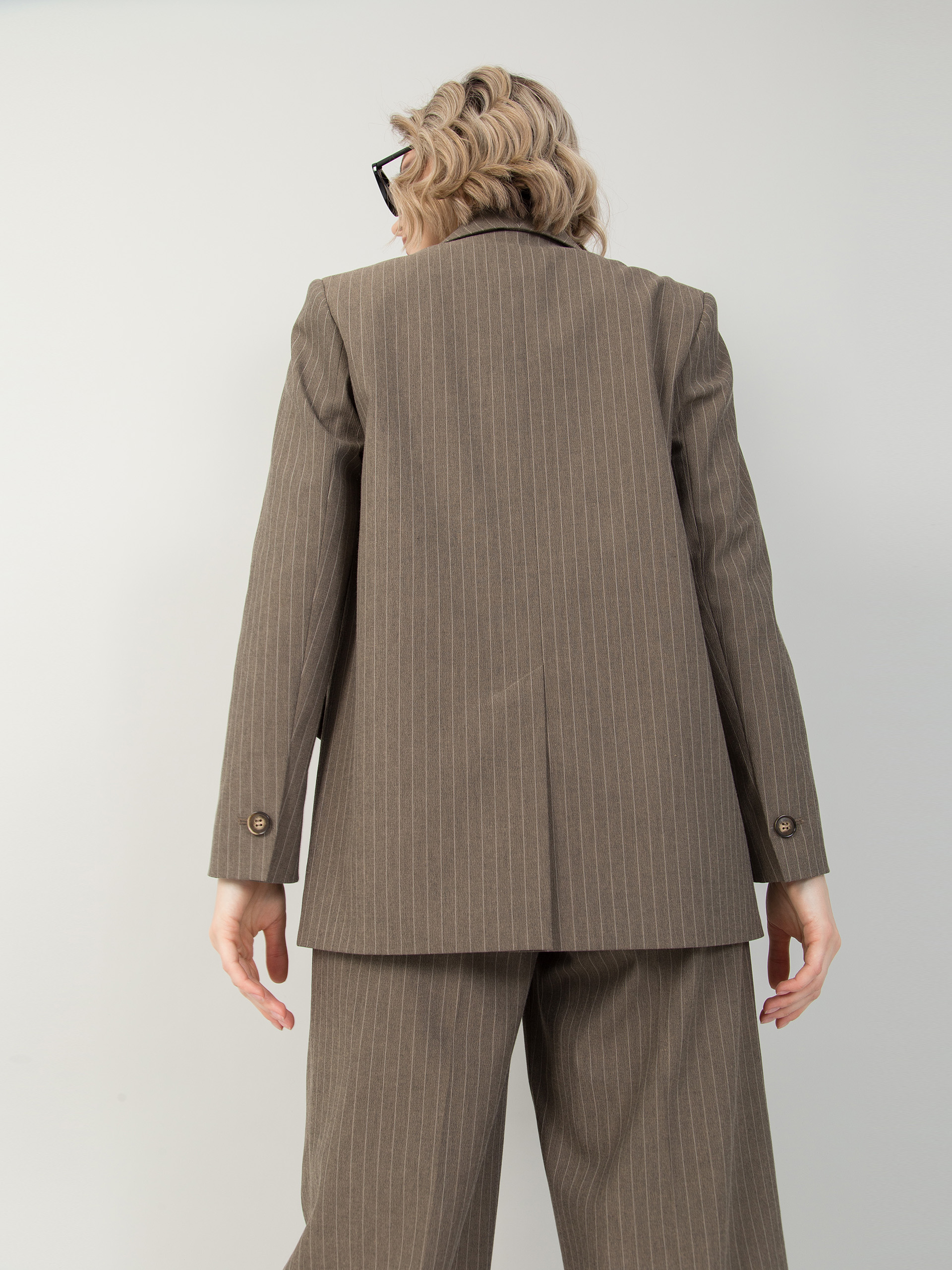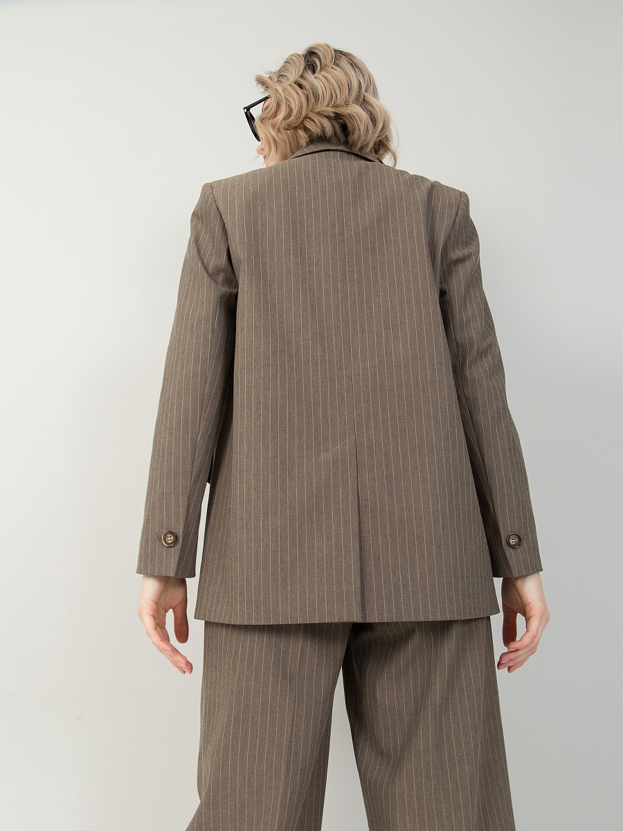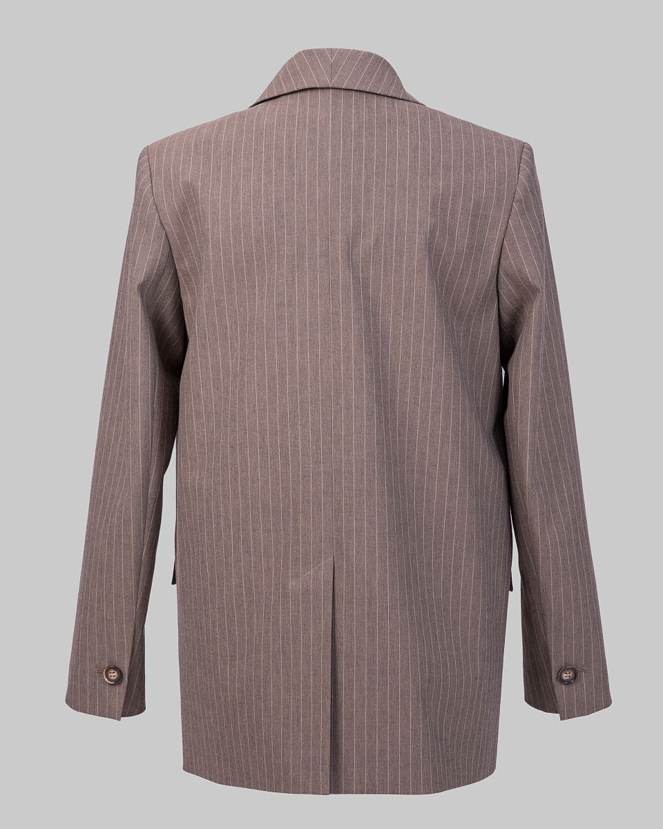 Жакет в полоску.. На переде имитация кармана с листочкой. Средний шов спинки снизу заканчивается разрезом. По низу рукава шлица с декоративной петлей и пуговицей.