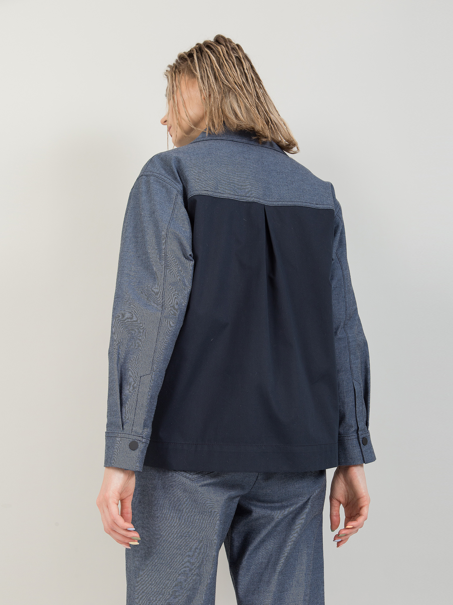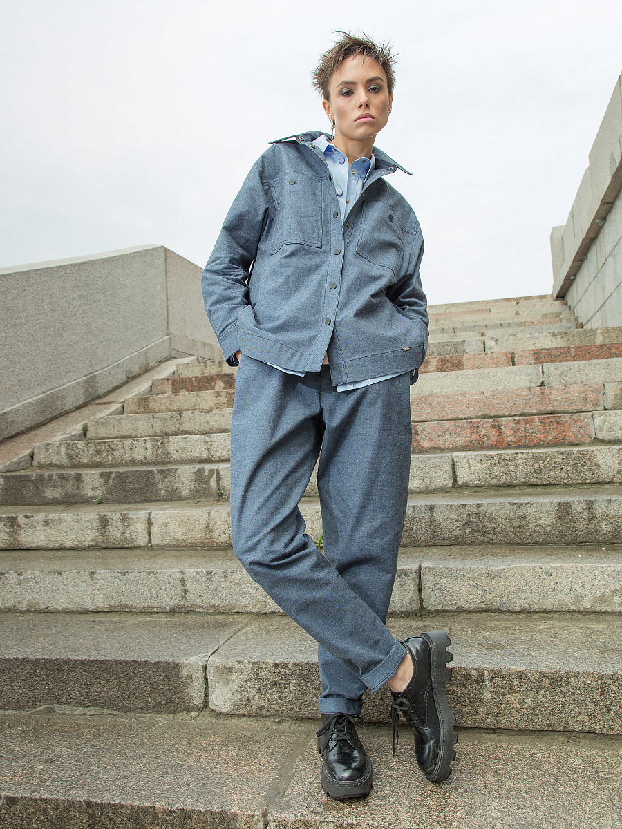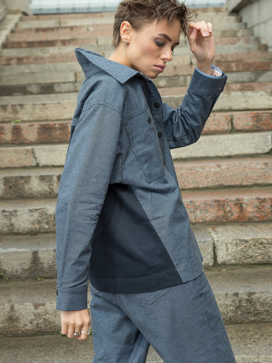 Модель с кокетками. Под кокеткой спинки складка. На карманах декоративные кнопки. По низу рукава защип, шлица и манжета с застёжкой на кнопку. Боковые швы наклонные, чуть смещены на перед.