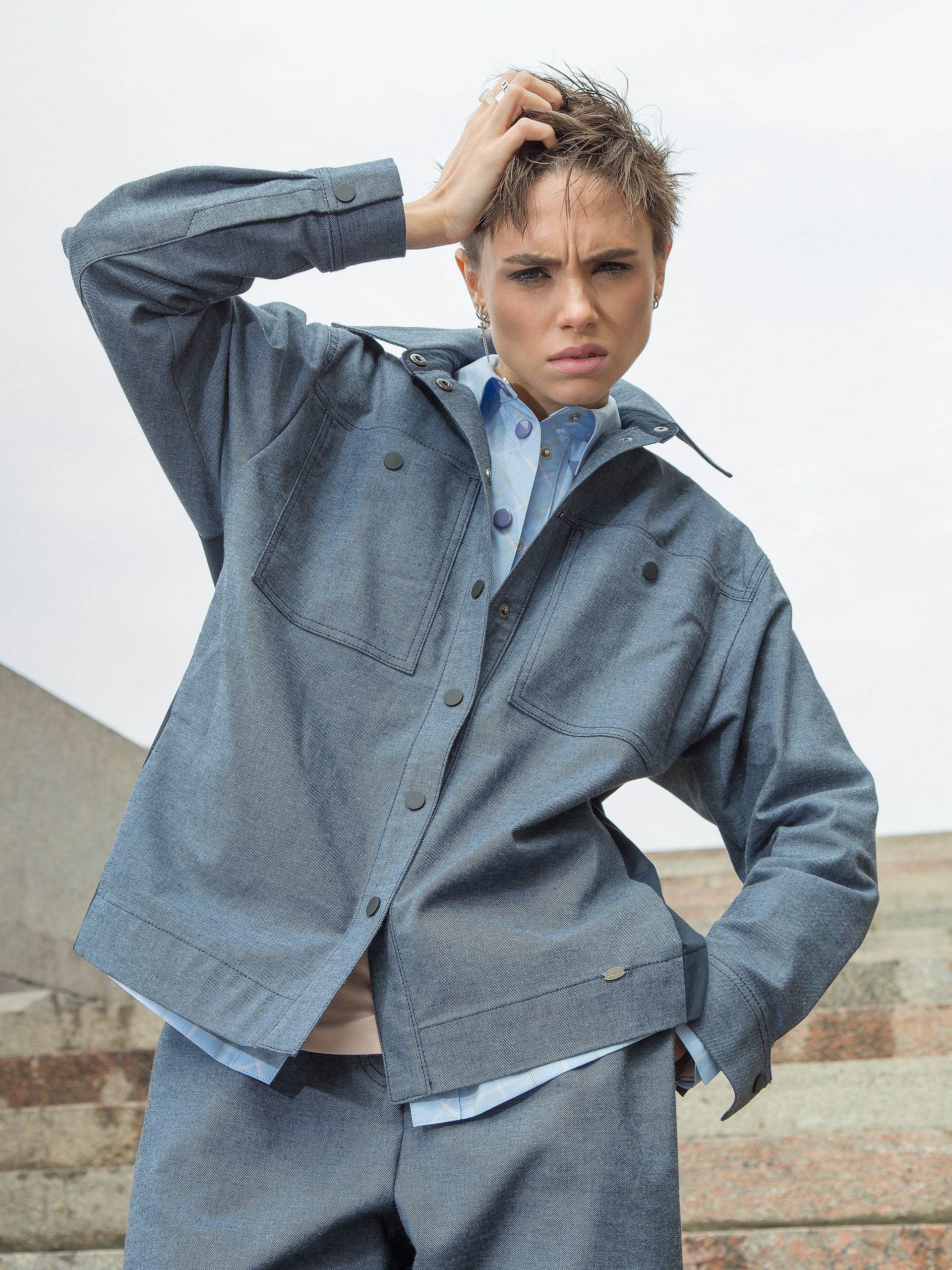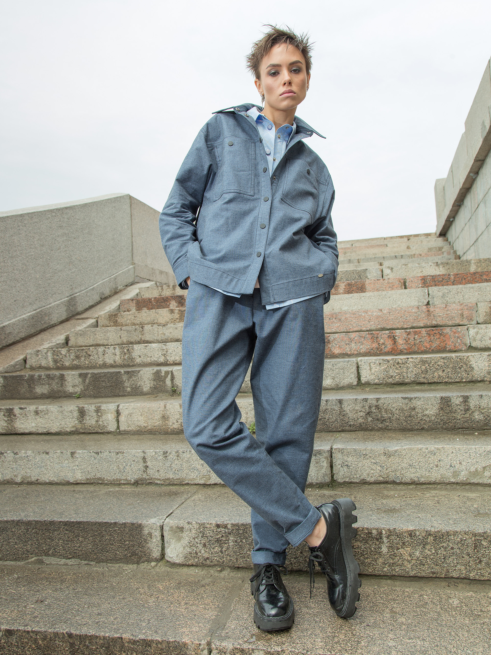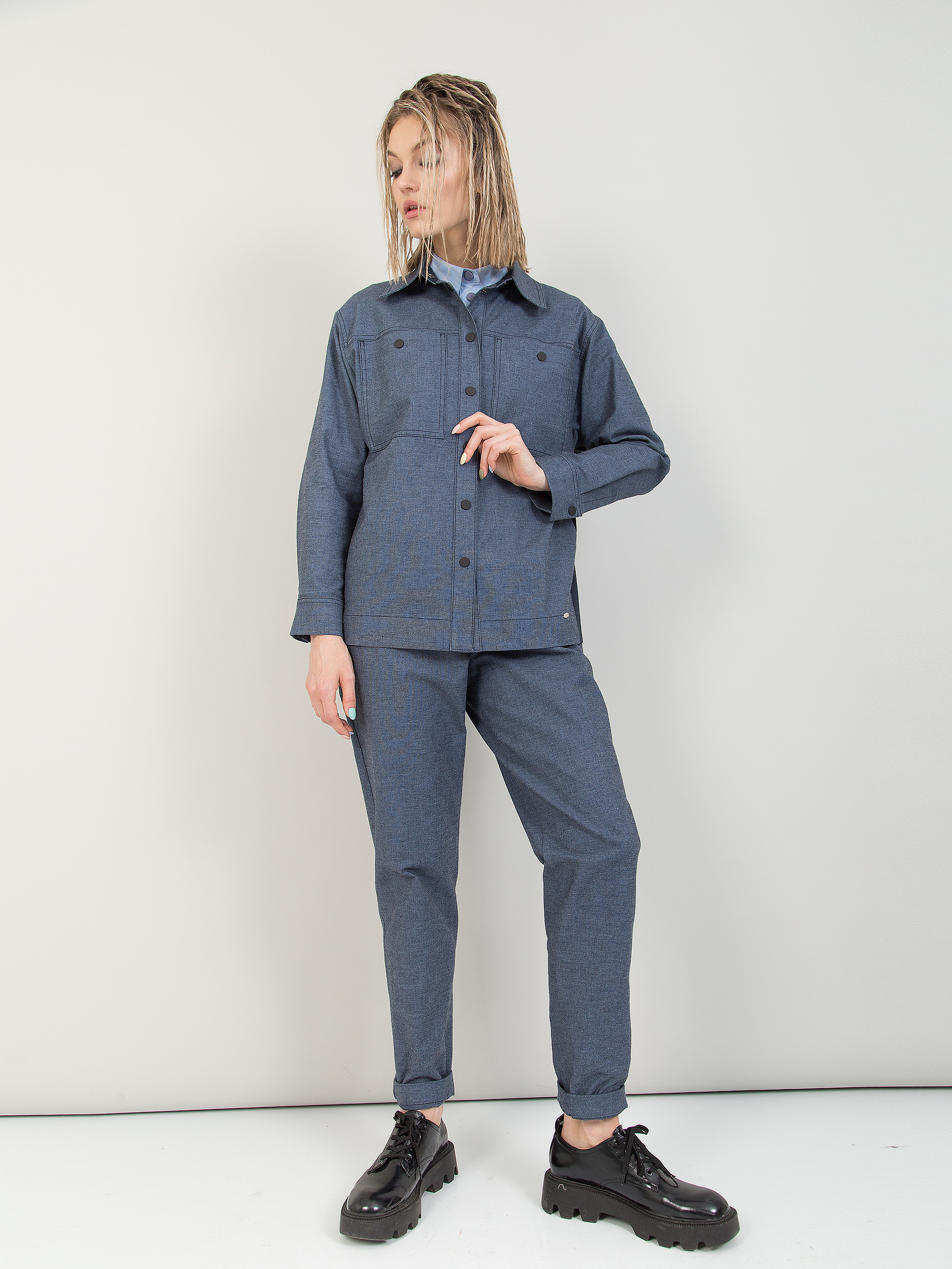 Модель с кокетками. Под кокеткой спинки складка. На карманах декоративные кнопки. По низу рукава защип, шлица и манжета с застёжкой на кнопку. Боковые швы наклонные, чуть смещены на перед.