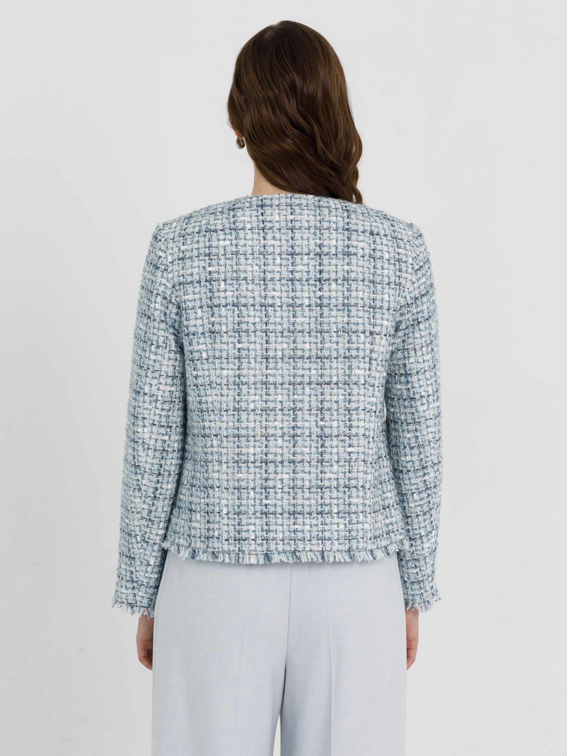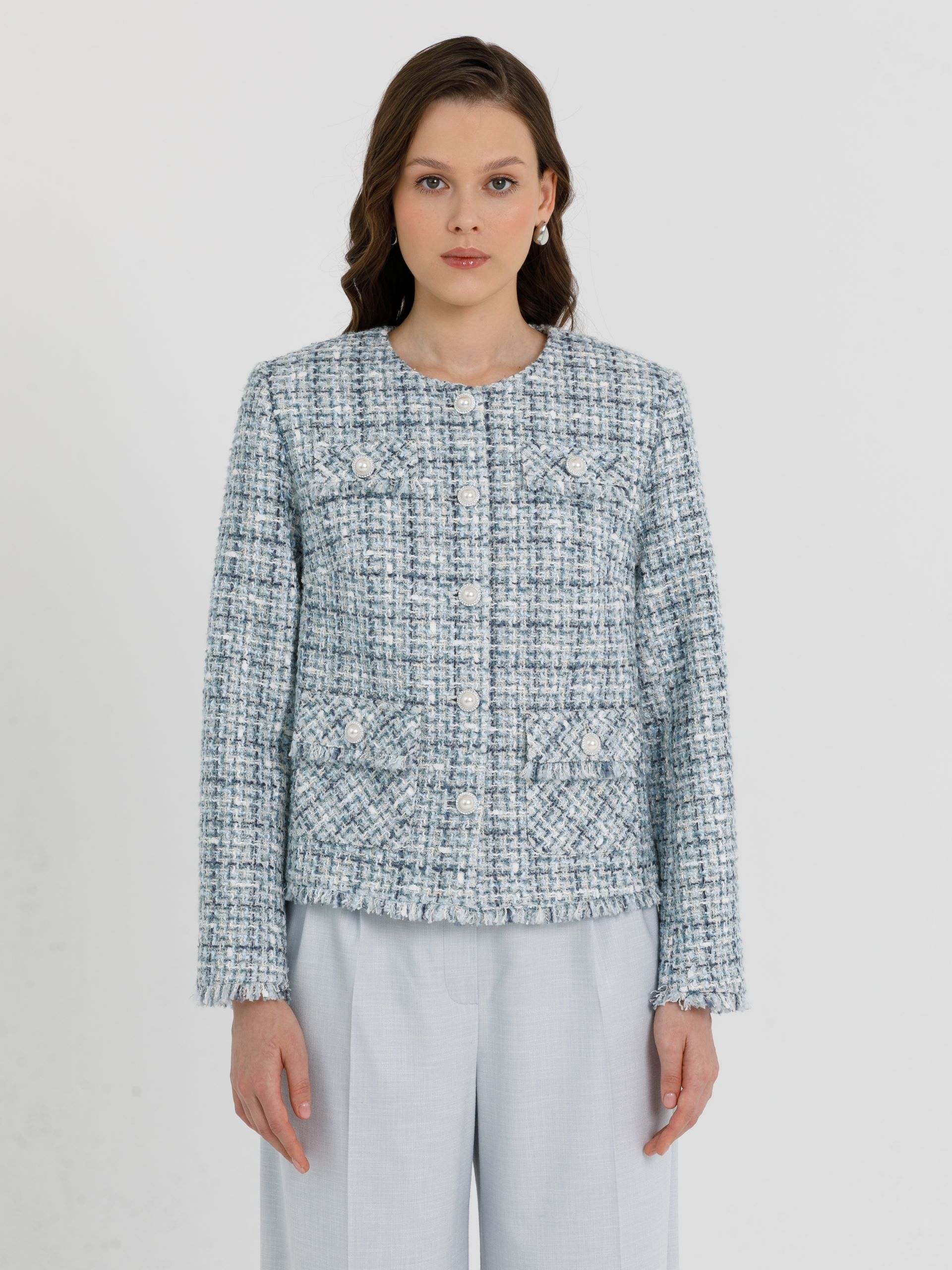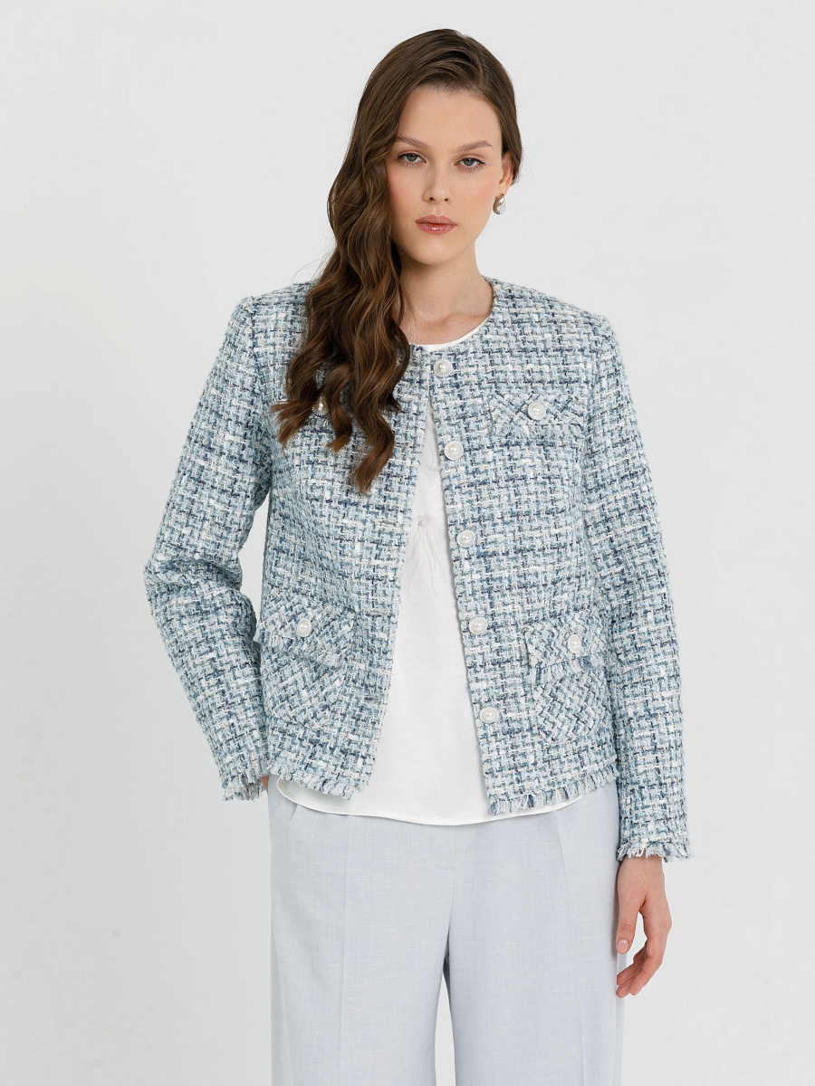 Модель прямого силуэта, на подкладе. Спереди накладные карманы с клапанами и застёжкой на пуговицу. В верхней части декоративные клапаны с пуговицей. Спинка со средним швом. Жакет декорирован бахромой.