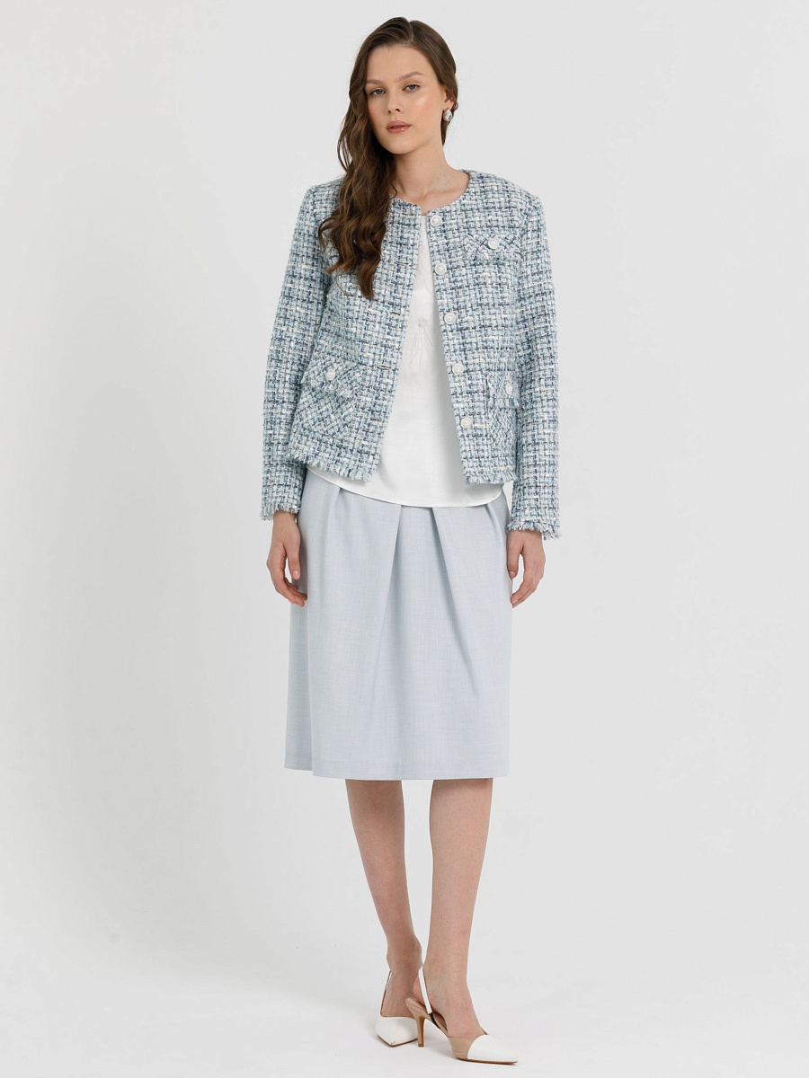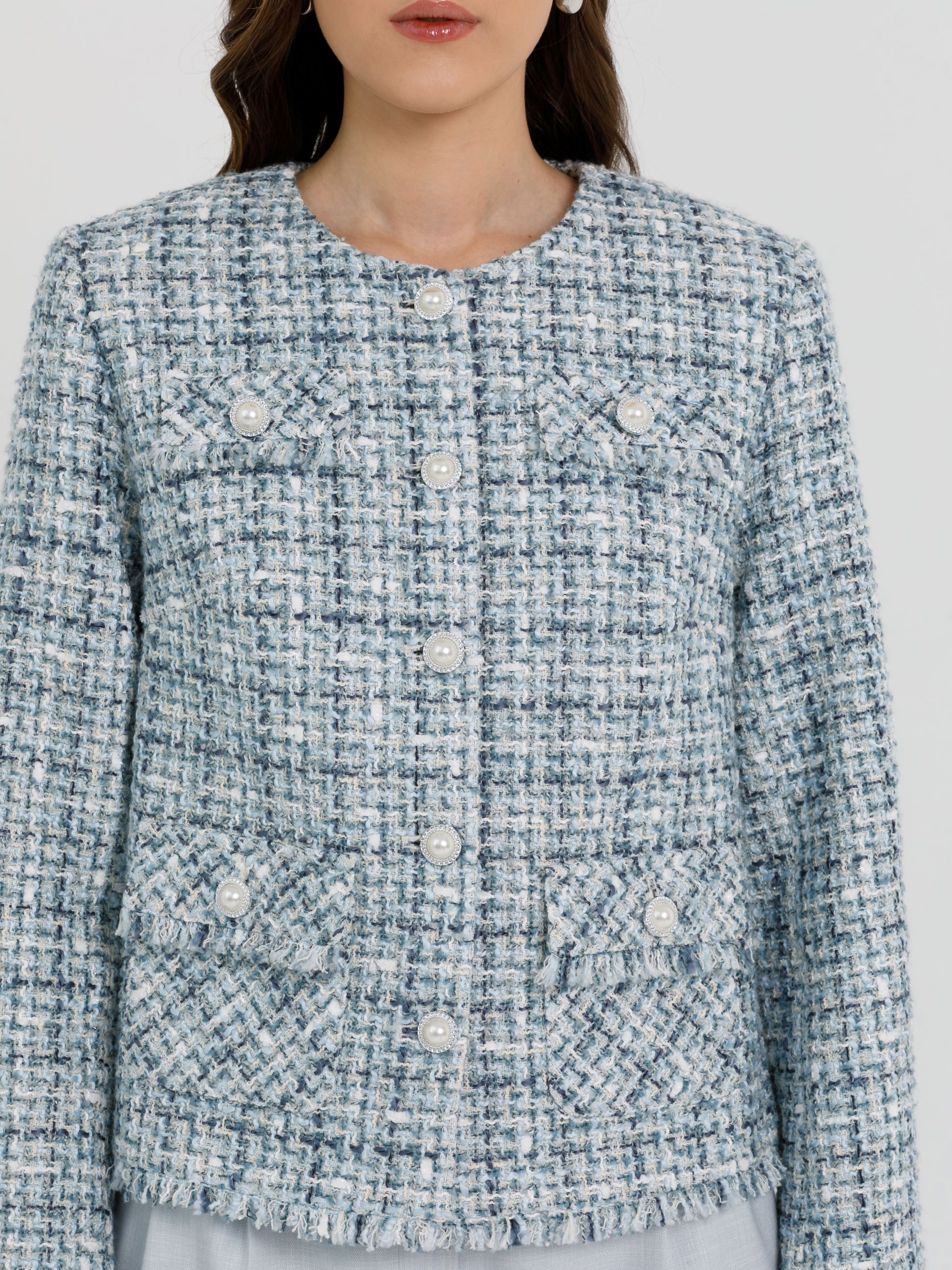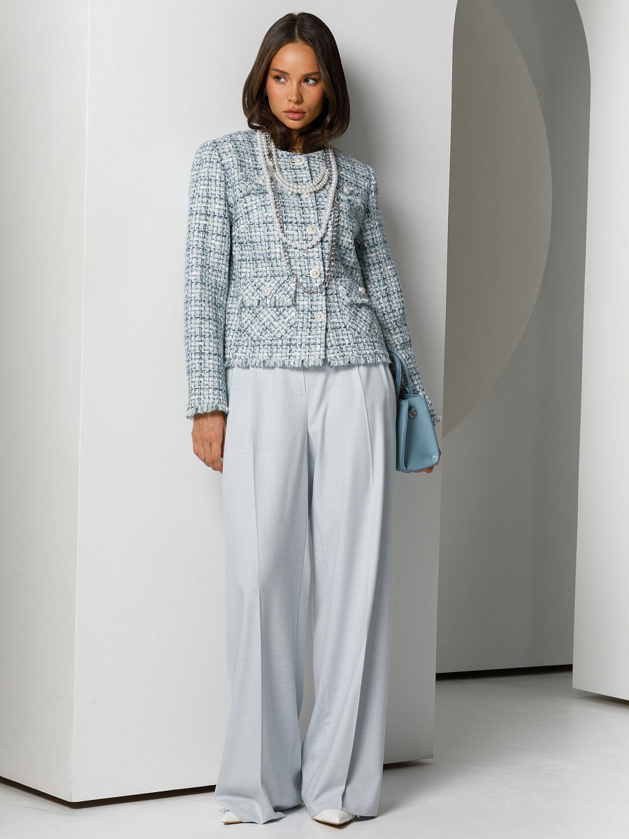 Модель прямого силуэта, на подкладе. Спереди накладные карманы с клапанами и застёжкой на пуговицу. В верхней части декоративные клапаны с пуговицей. Спинка со средним швом. Жакет декорирован бахромой.