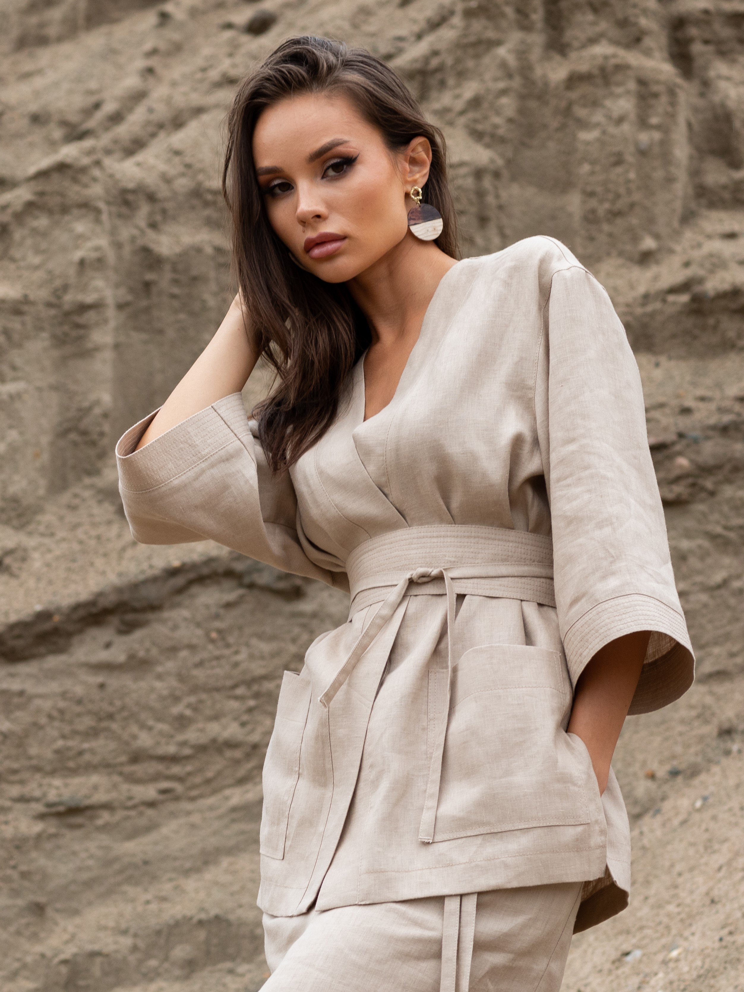 Модель прямого силуэта, со спущеным плечом, без застёжки. Спереди накладные карманы. Край борта обработан планкой. В боковых швах разрезы. По низу рукава манжета. Талия подчёркнута завязывающимся поясом из основной ткани. Жакет декорирован отделочными строчками.