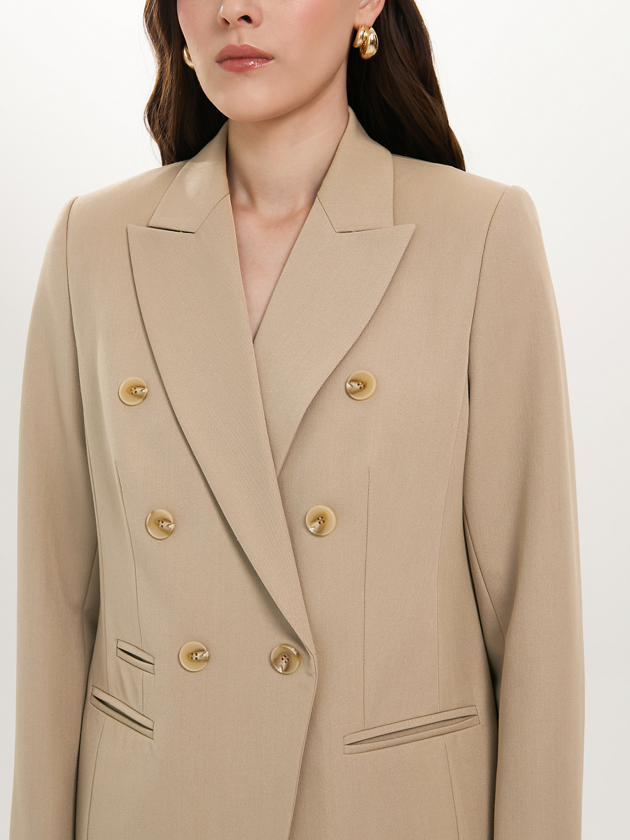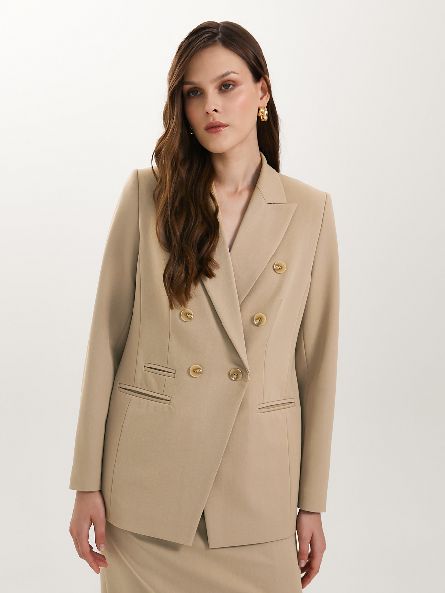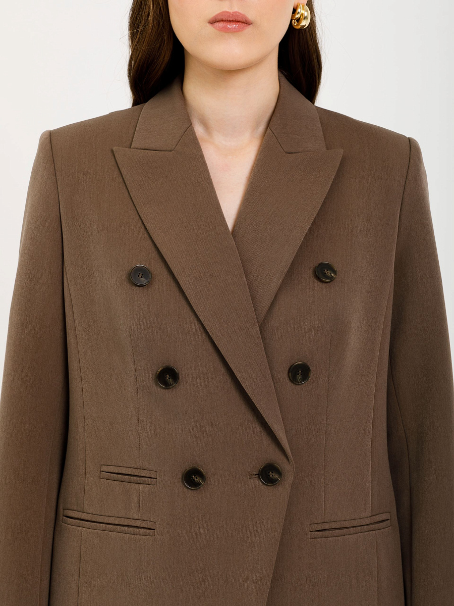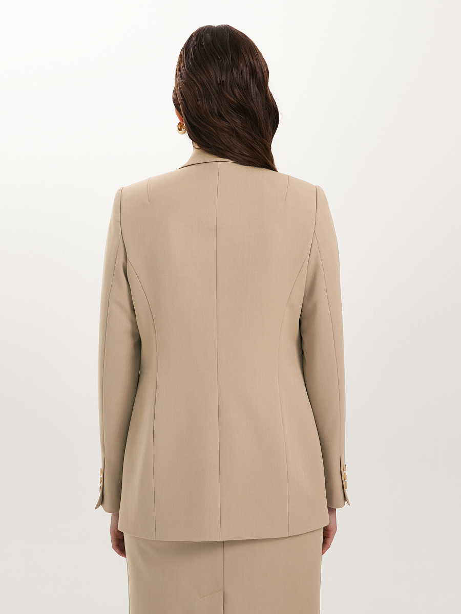 Модель полуприлегающего силуэта, с рельефами, на подкладе. Застёжка двубортная на петли и пуговицы. Спереди прорезные карманы в рамку, а также имитация кармана и декоративные пуговицы. Спинка со средним швом. Воротник пиджачный. По низу рукава обработана шлица с отделочными петлями и пуговицами.