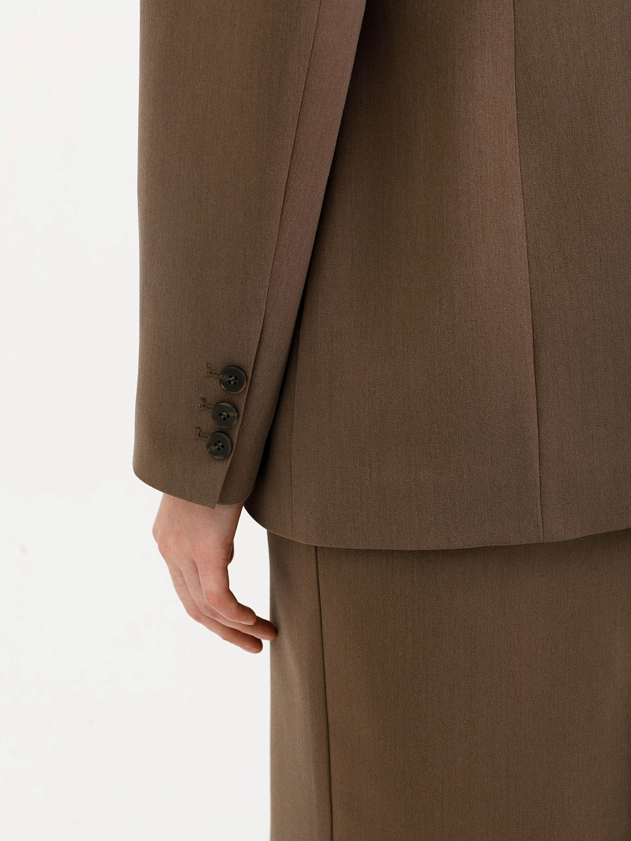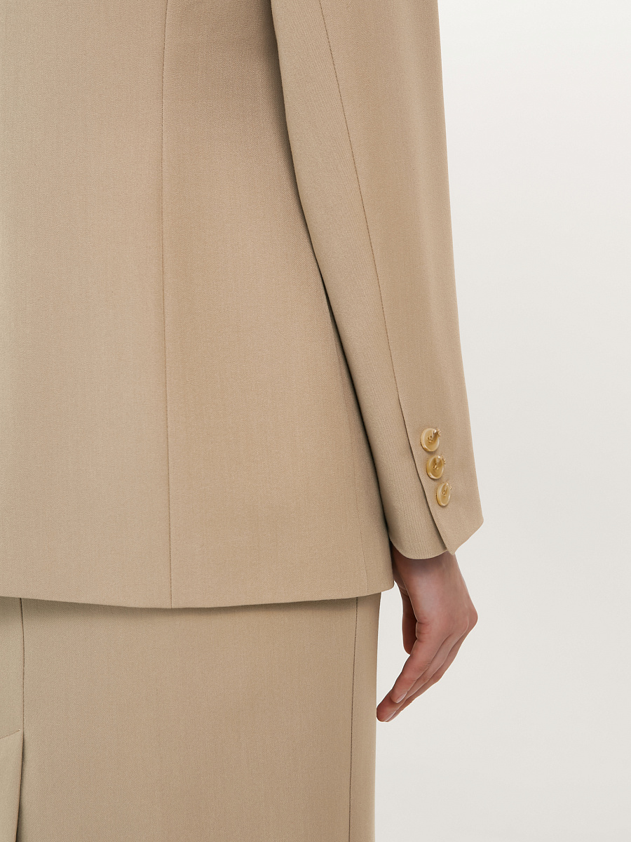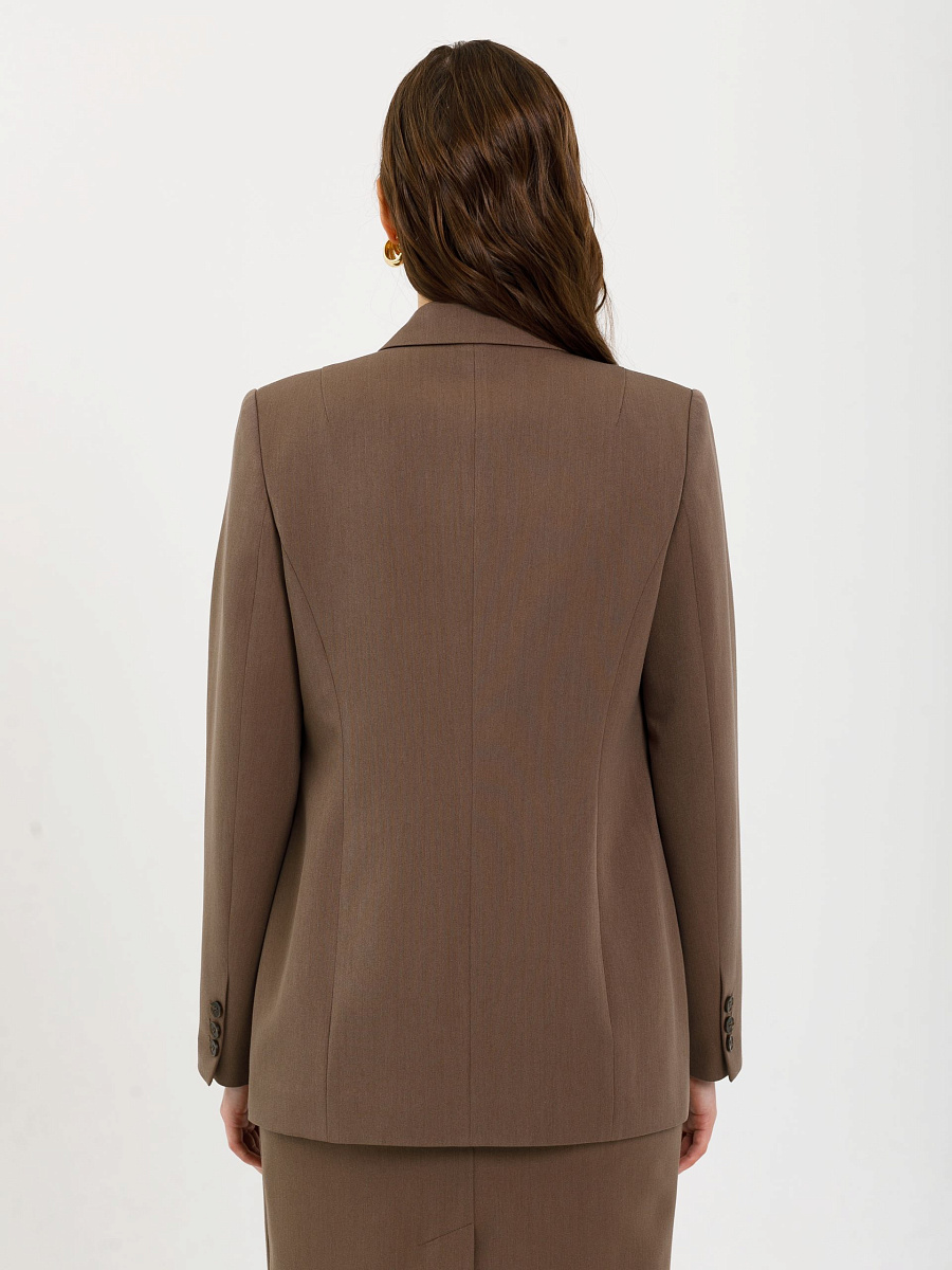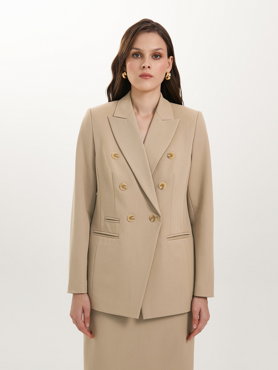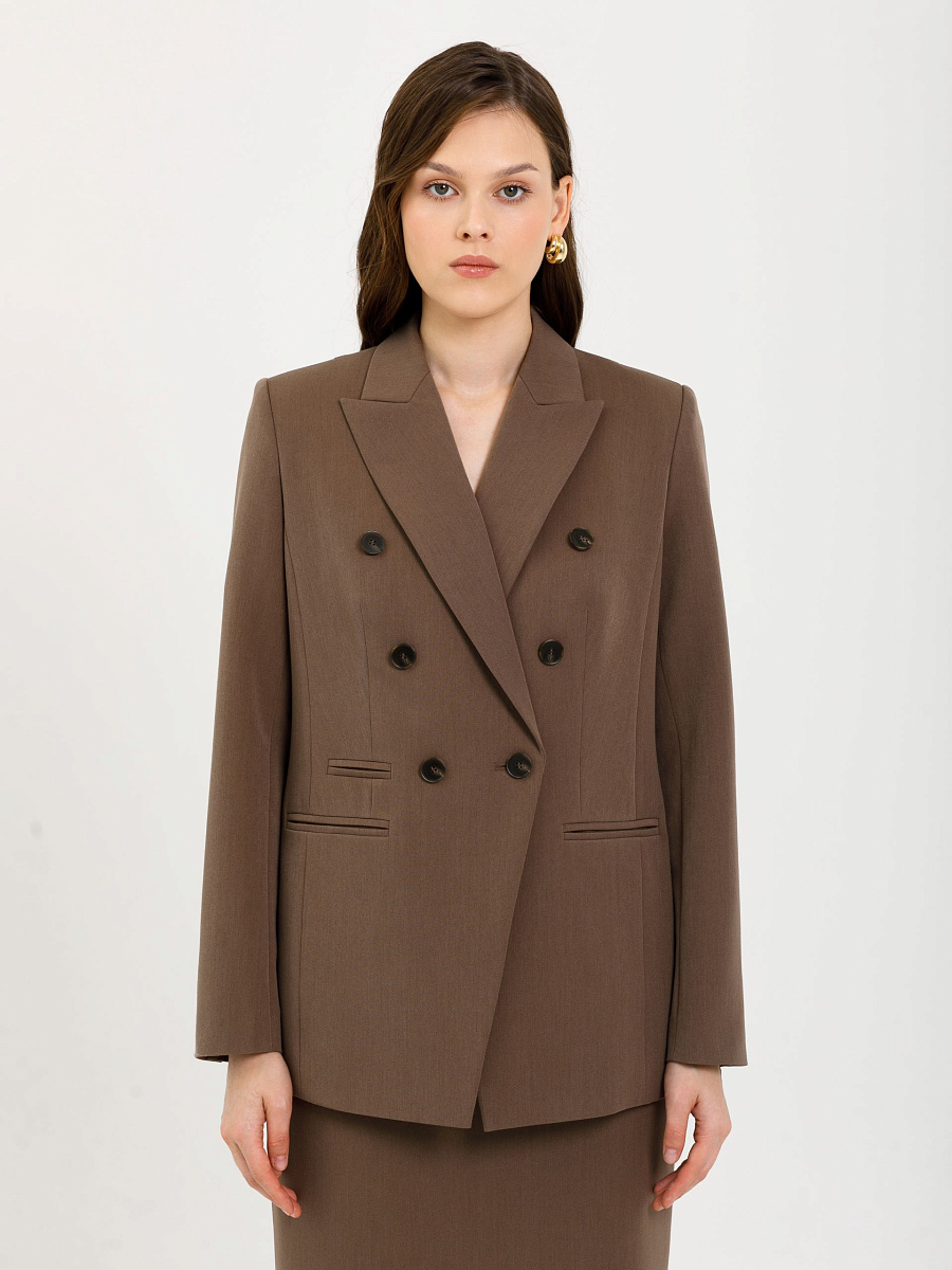 Модель полуприлегающего силуэта, с рельефами, на подкладе. Застёжка двубортная на петли и пуговицы. Спереди прорезные карманы в рамку, а также имитация кармана и декоративные пуговицы. Спинка со средним швом. Воротник пиджачный. По низу рукава обработана шлица с отделочными петлями и пуговицами.