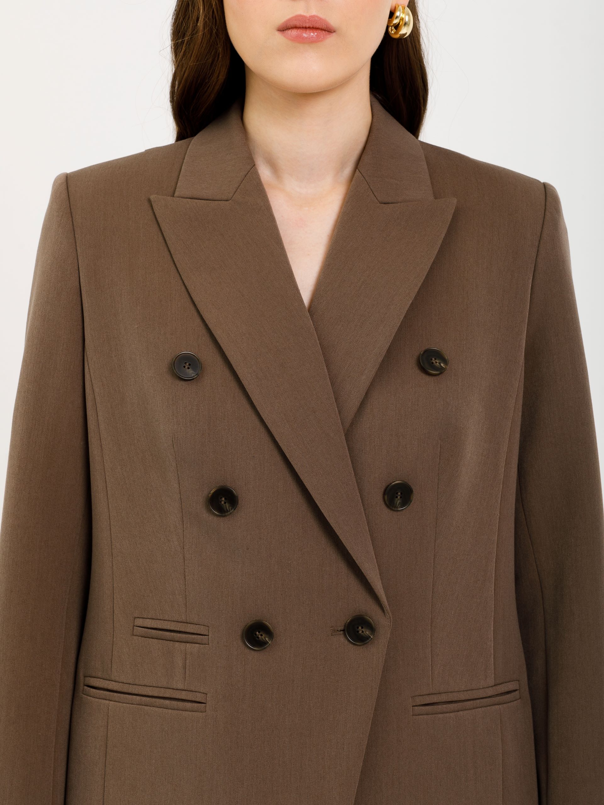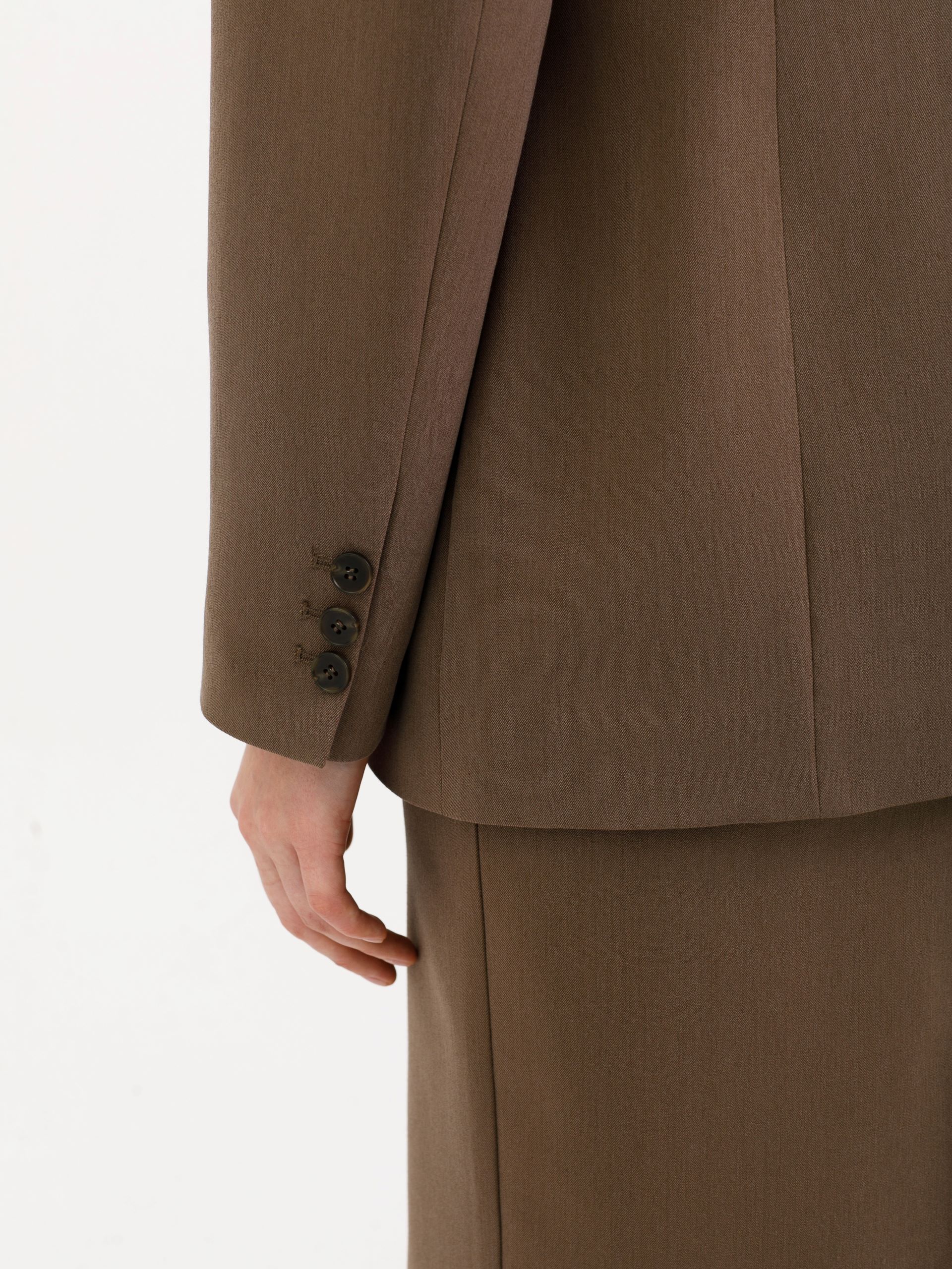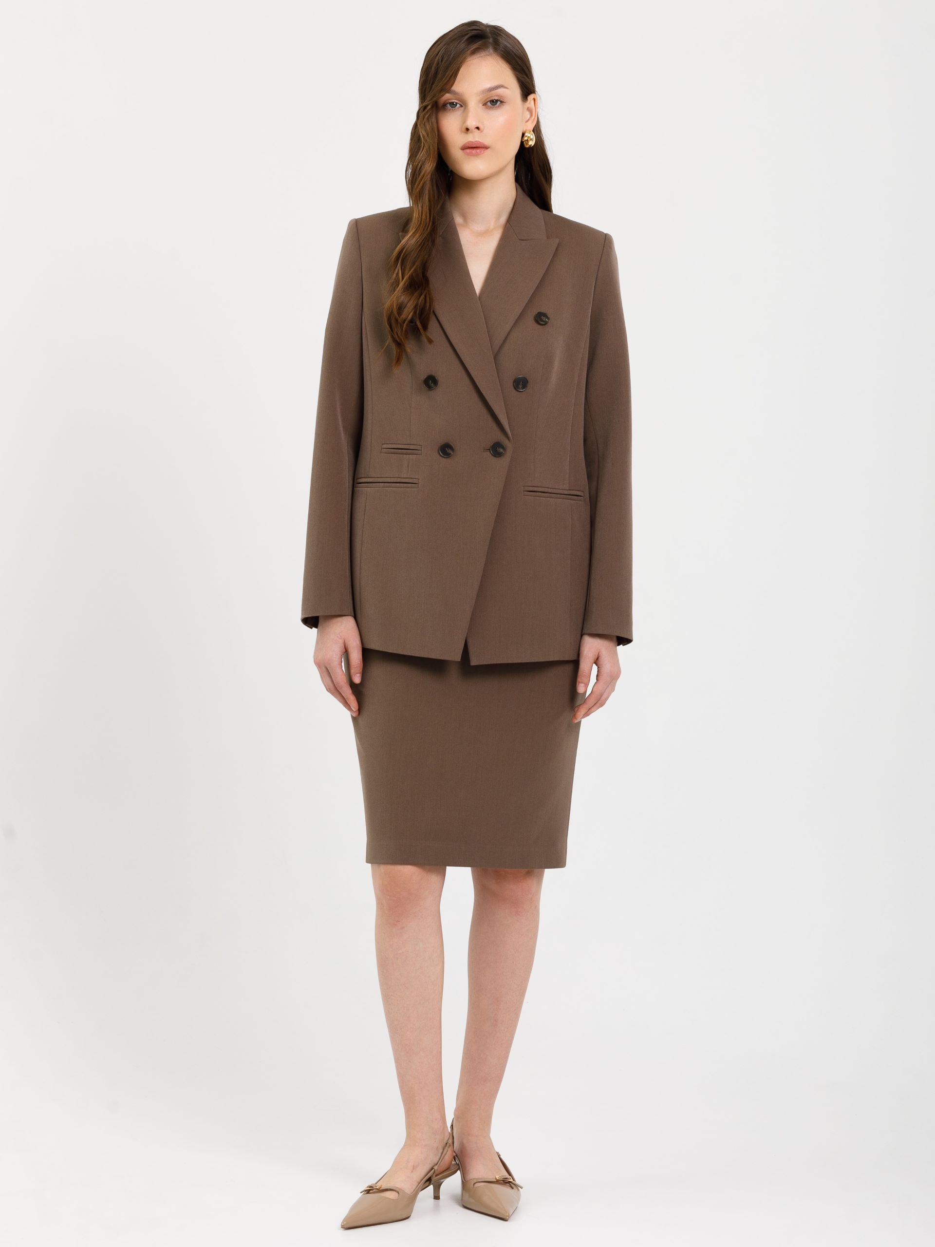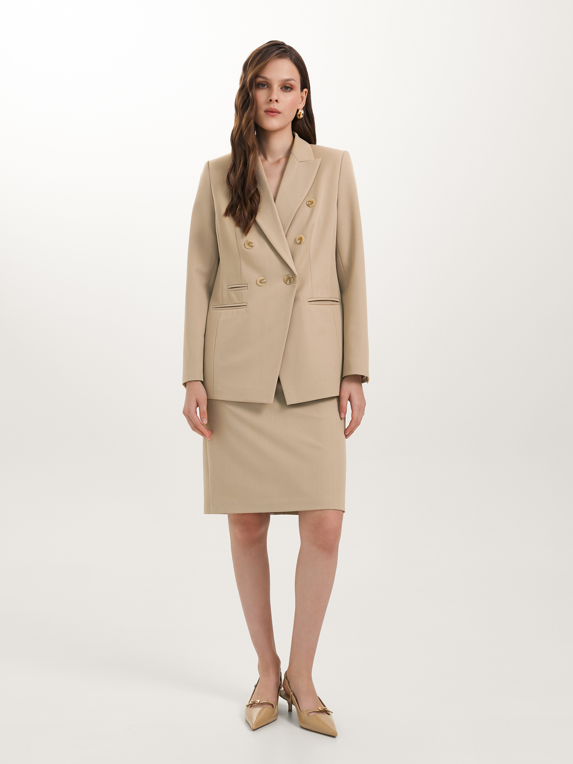 Модель полуприлегающего силуэта, с рельефами, на подкладе. Застёжка двубортная на петли и пуговицы. Спереди прорезные карманы в рамку, а также имитация кармана и декоративные пуговицы. Спинка со средним швом. Воротник пиджачный. По низу рукава обработана шлица с отделочными петлями и пуговицами.