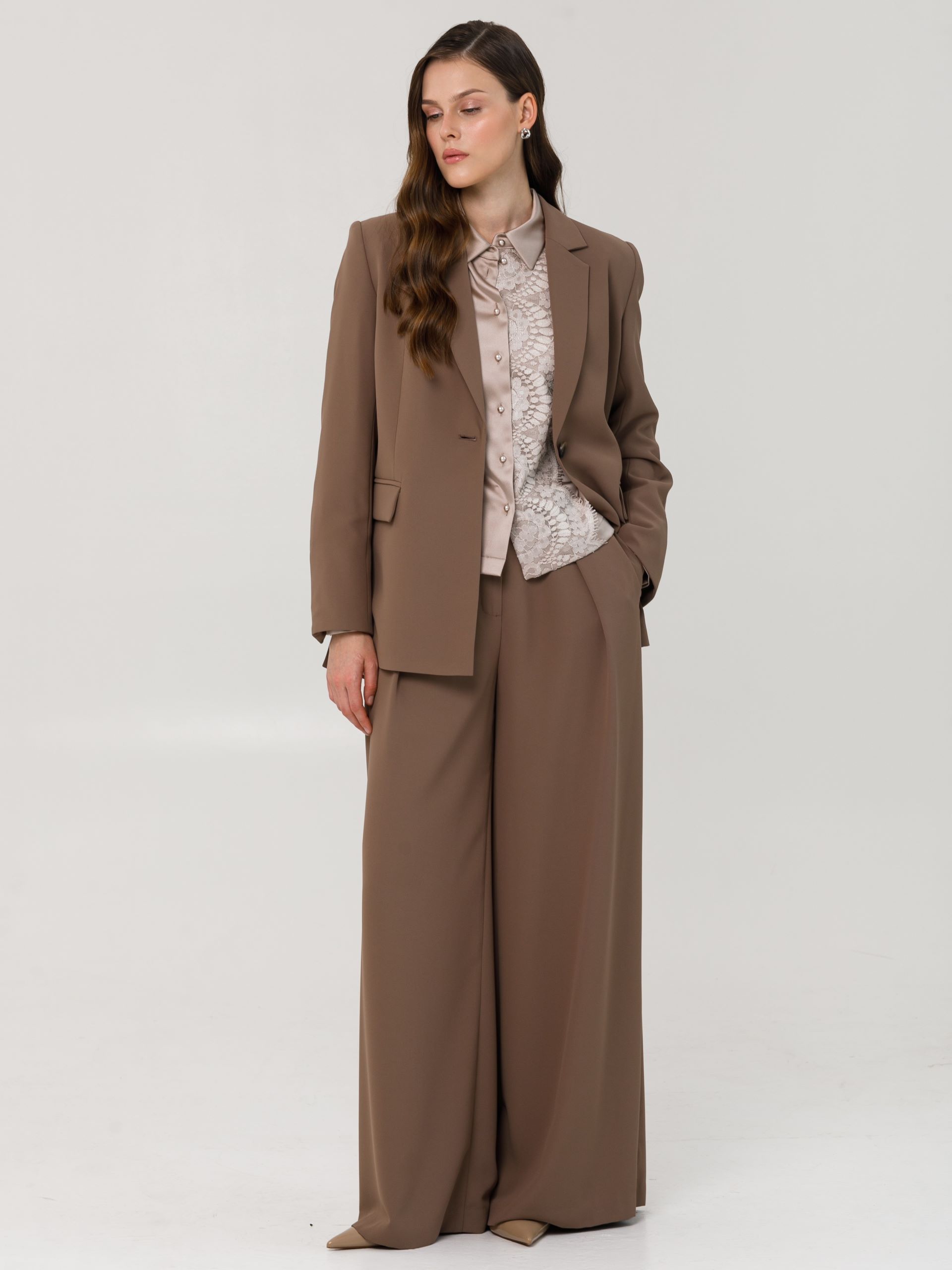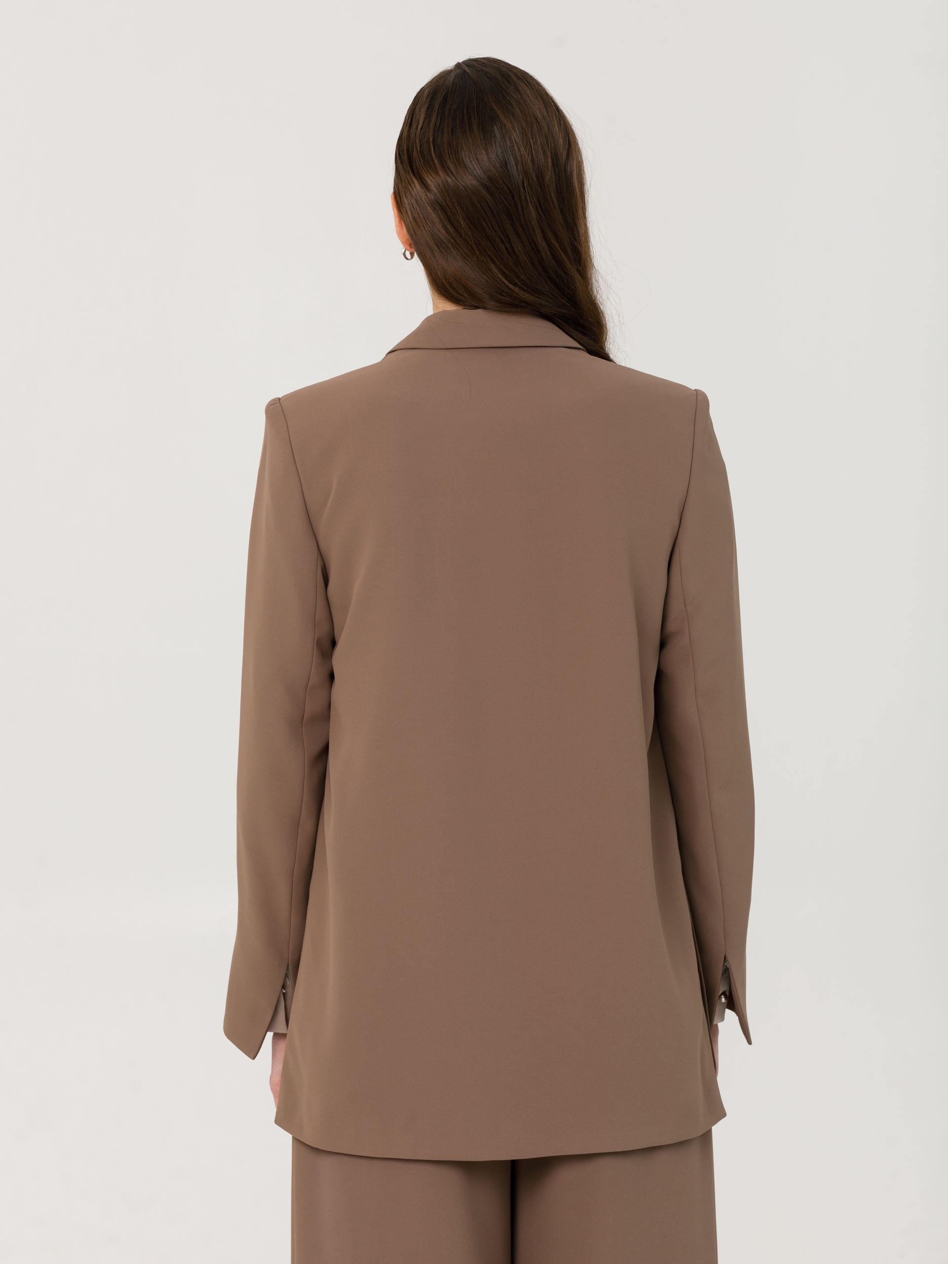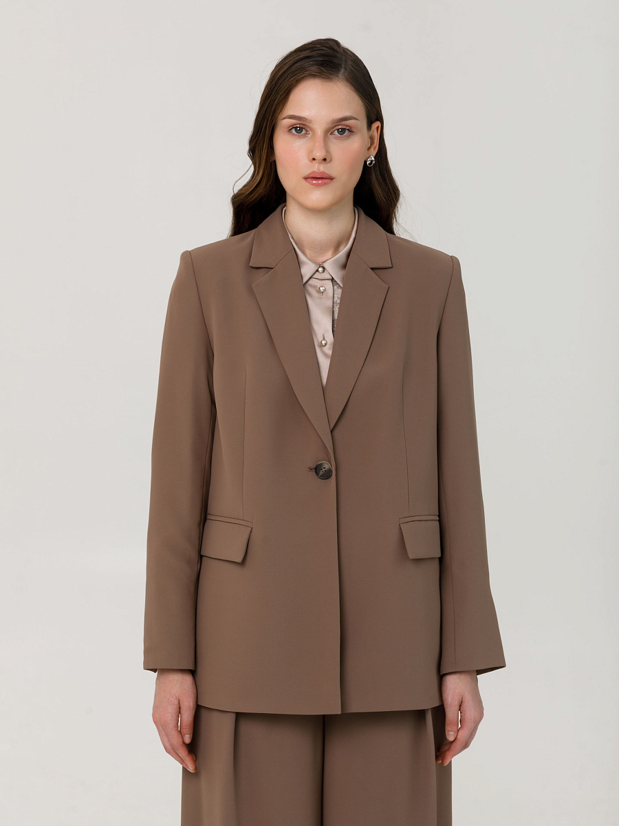 Модель на подкладе, с однобортной застёжкой на пуговицу и петлю. Воротник английский. Спереди прорезные карманы в рамку с клапаном. В боковых швах и по низу рукава разрезы. Низ жакета разноуровневый, длиннее по спинке.