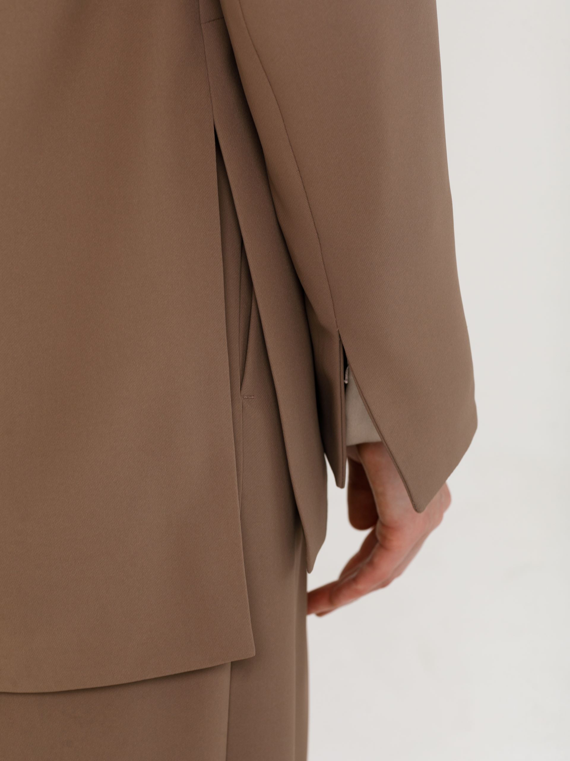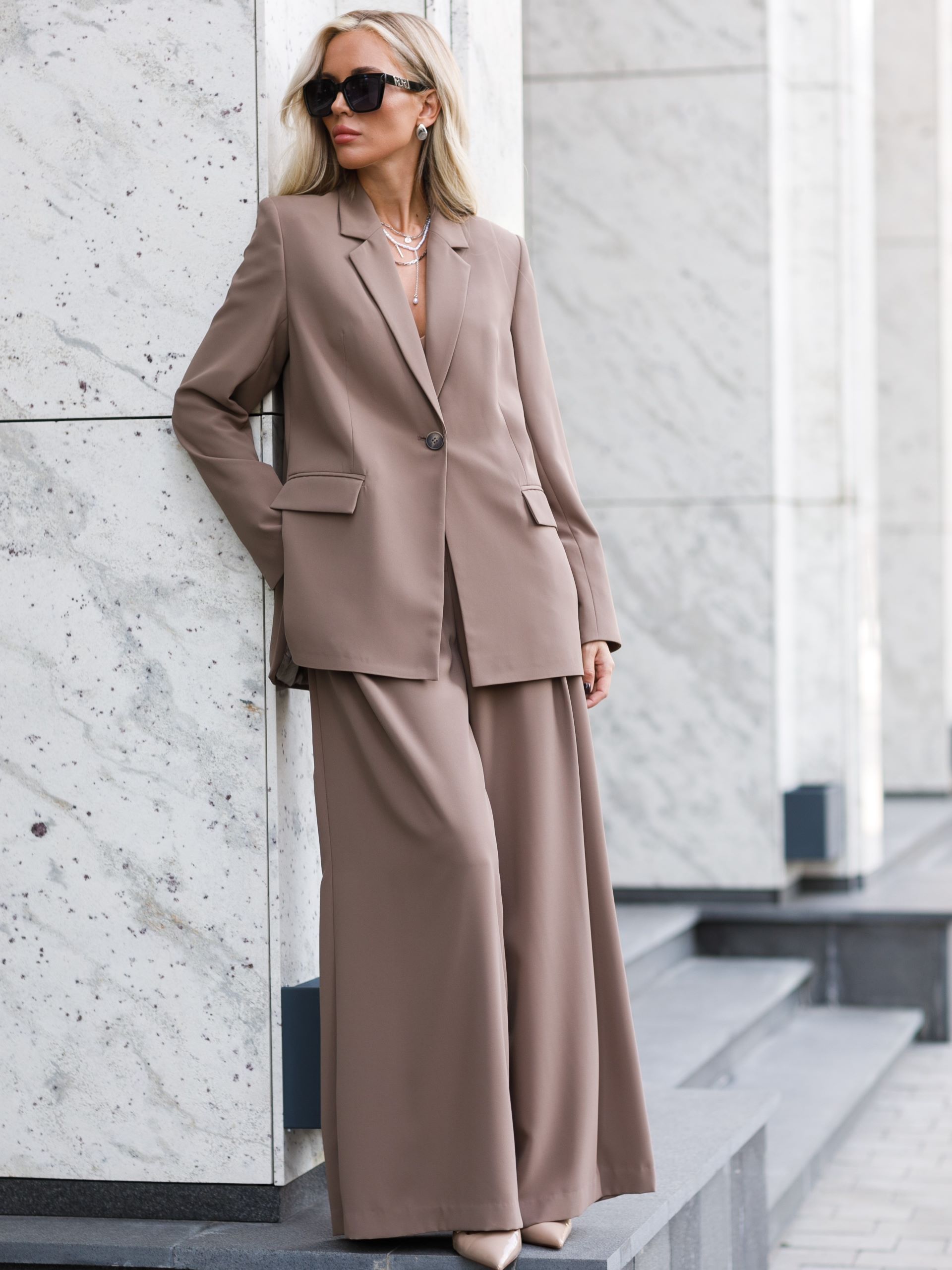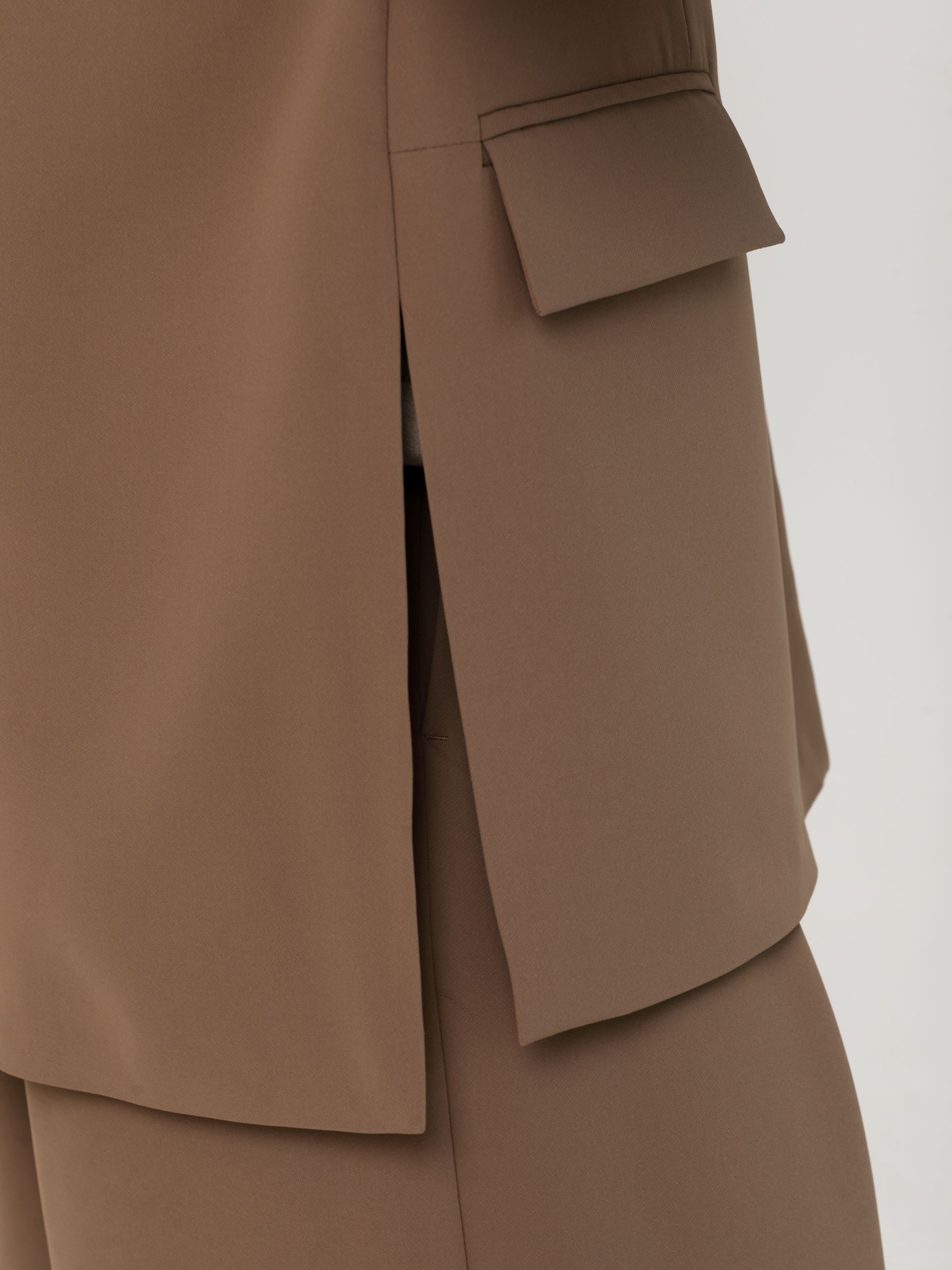 Модель на подкладе, с однобортной застёжкой на пуговицу и петлю. Воротник английский. Спереди прорезные карманы в рамку с клапаном. В боковых швах и по низу рукава разрезы. Низ жакета разноуровневый, длиннее по спинке.