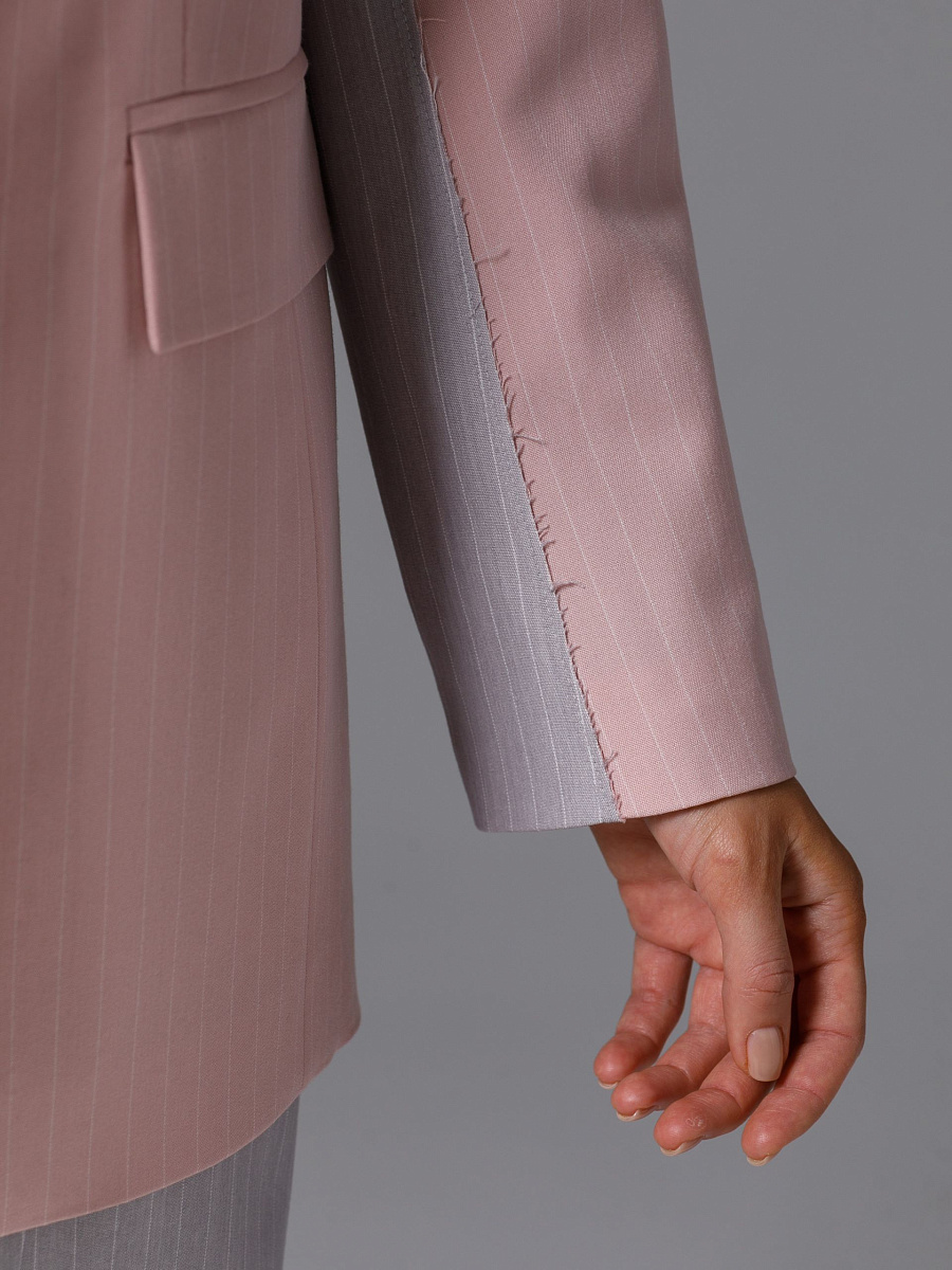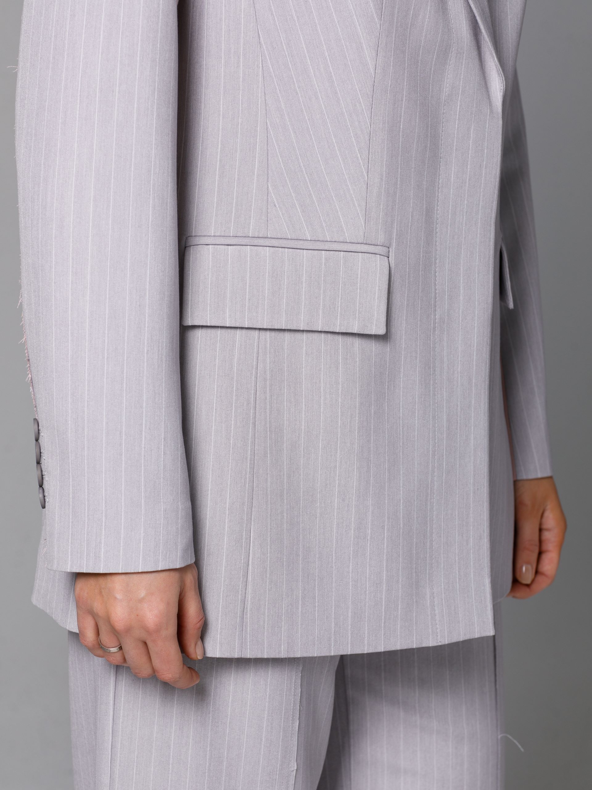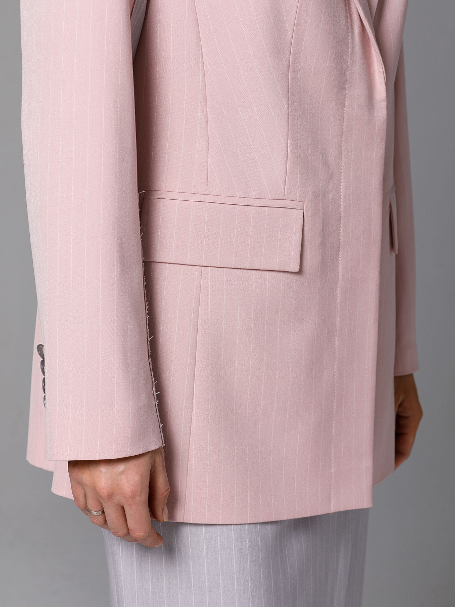 Модель полуприлегающего силуэта, с рельефами, на частичном подкладе.Спереди центральная потайная застёжка на петли и пуговицы, прорезные карманы в рамку с клапаном, а также нагрудный карман с листочкой. Средний шов спинки снизу заканчивается шлицей. Воротник английский. По низу рукава имитация шлицы с отделочными петлями и пуговицами. Жакет декорирован швами с открытыми срезами.