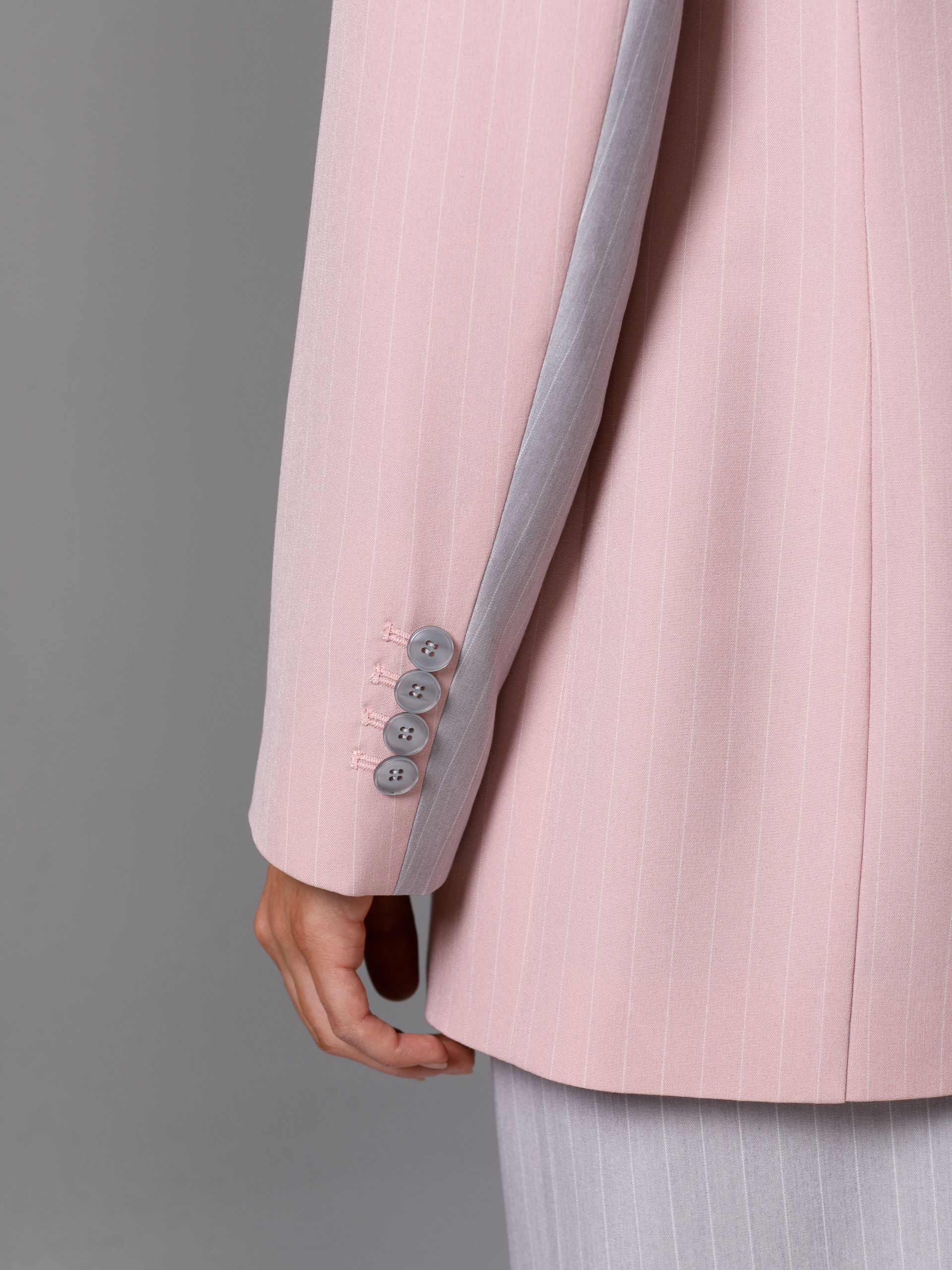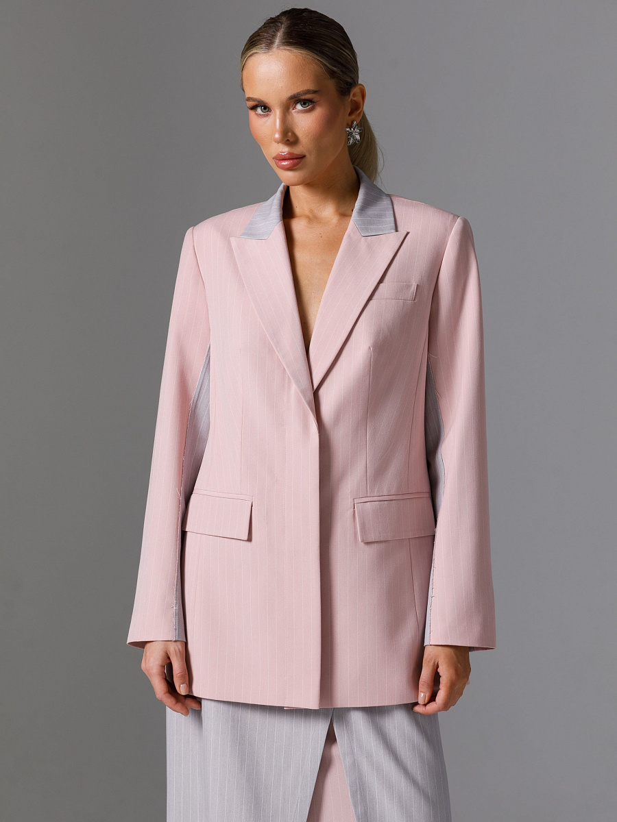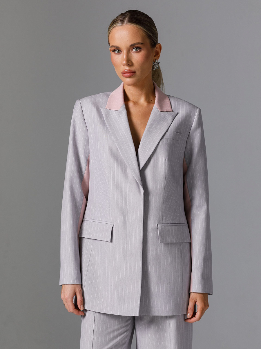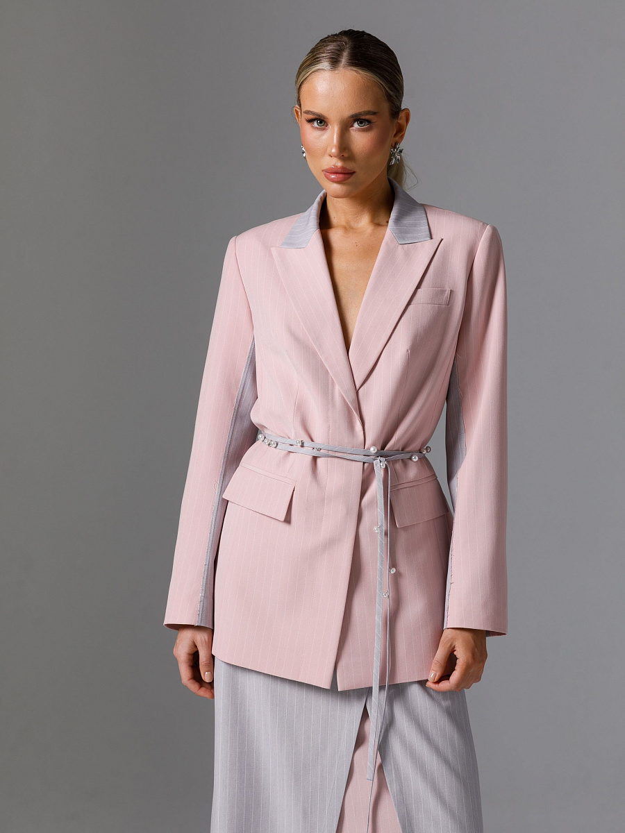 Модель полуприлегающего силуэта, с рельефами, на частичном подкладе.Спереди центральная потайная застёжка на петли и пуговицы, прорезные карманы в рамку с клапаном, а также нагрудный карман с листочкой. Средний шов спинки снизу заканчивается шлицей. Воротник английский. По низу рукава имитация шлицы с отделочными петлями и пуговицами. Жакет декорирован швами с открытыми срезами.