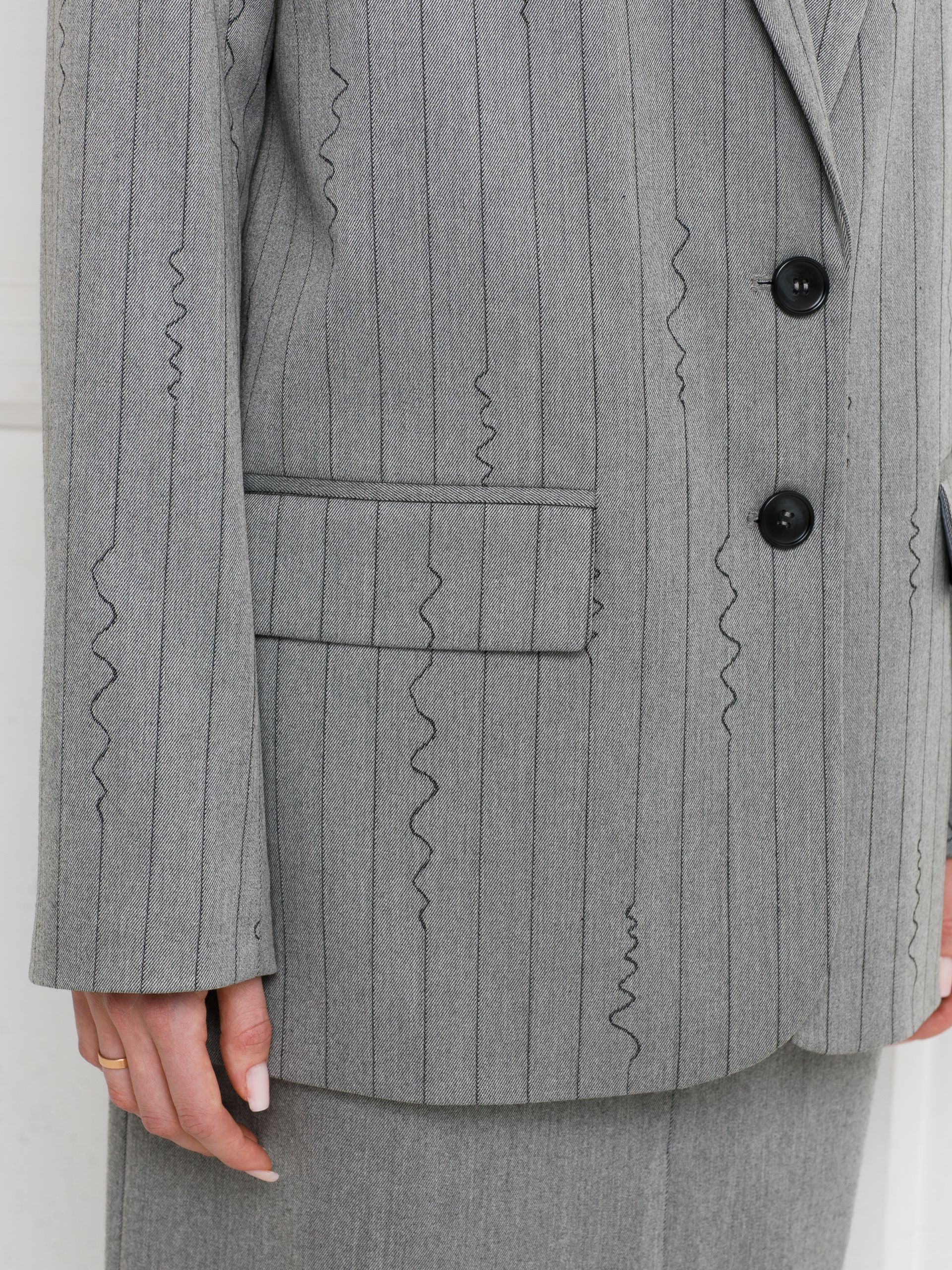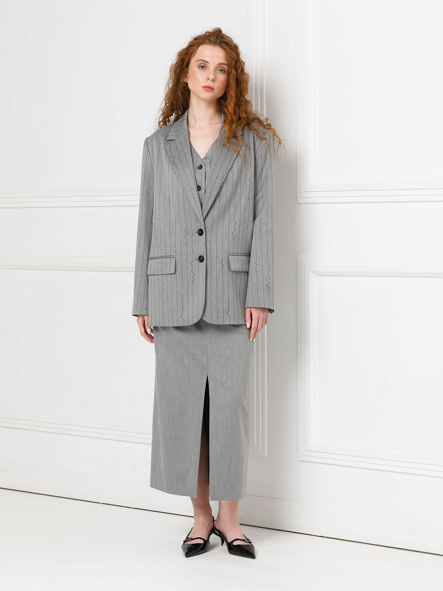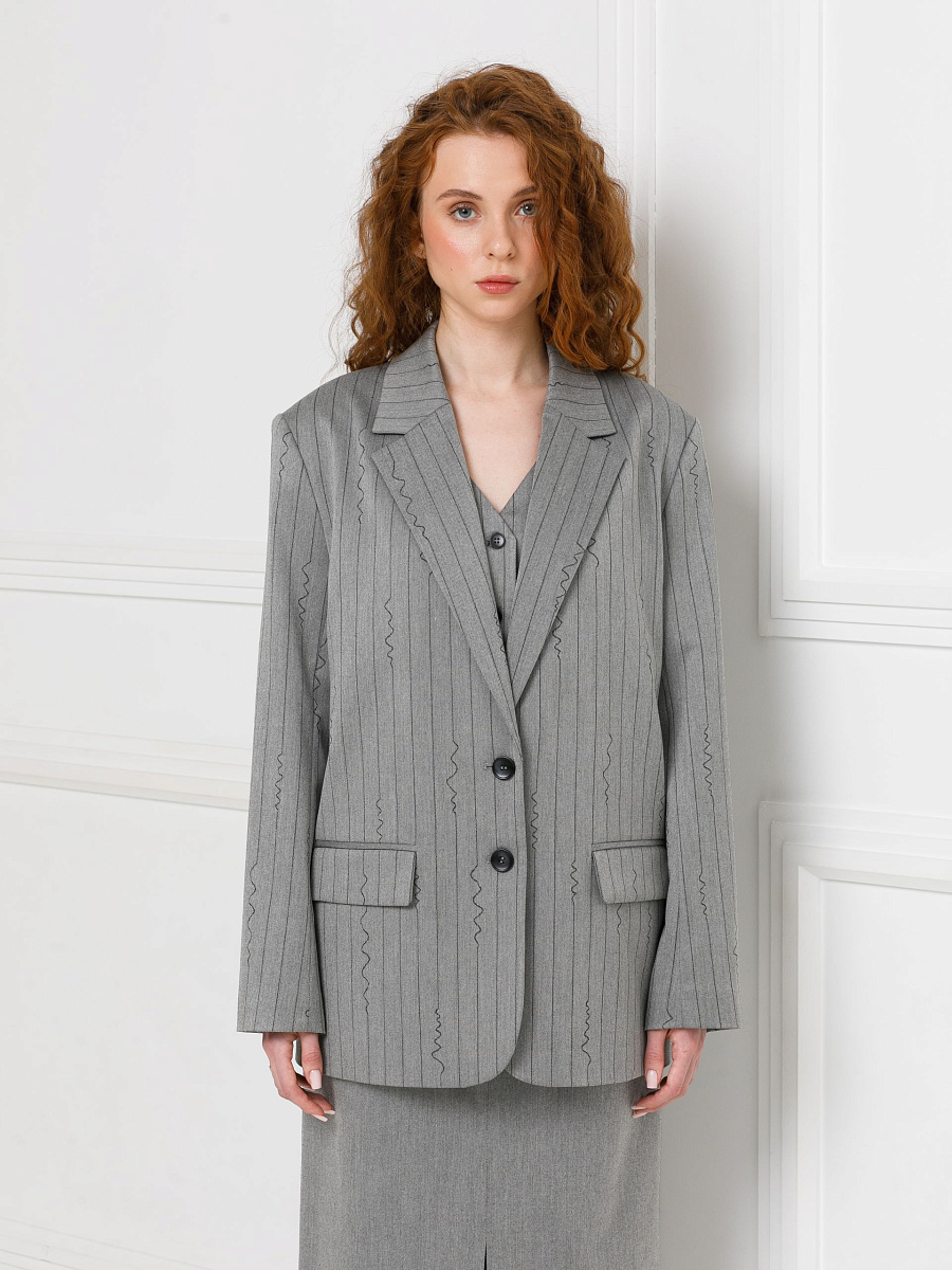 Модель прямого силуэта, на подкладе. Спереди прорезные карманы в рамку с клапаном и однобортная застёжка на петли и пуговицы. Средний шов спинки снизу заканчивается шлицей. Воротник английский. По низу рукава шлица с декоративными пуговицами.