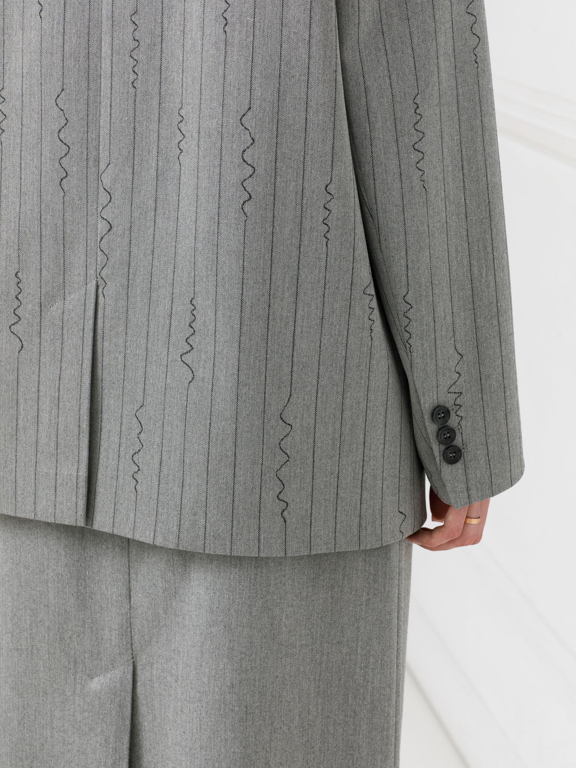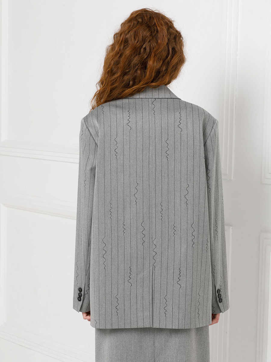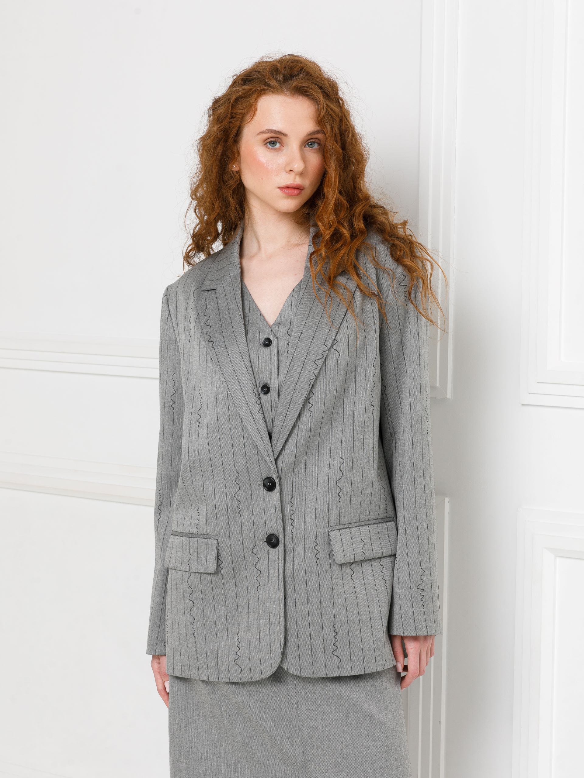 Модель прямого силуэта, на подкладе. Спереди прорезные карманы в рамку с клапаном и однобортная застёжка на петли и пуговицы. Средний шов спинки снизу заканчивается шлицей. Воротник английский. По низу рукава шлица с декоративными пуговицами.