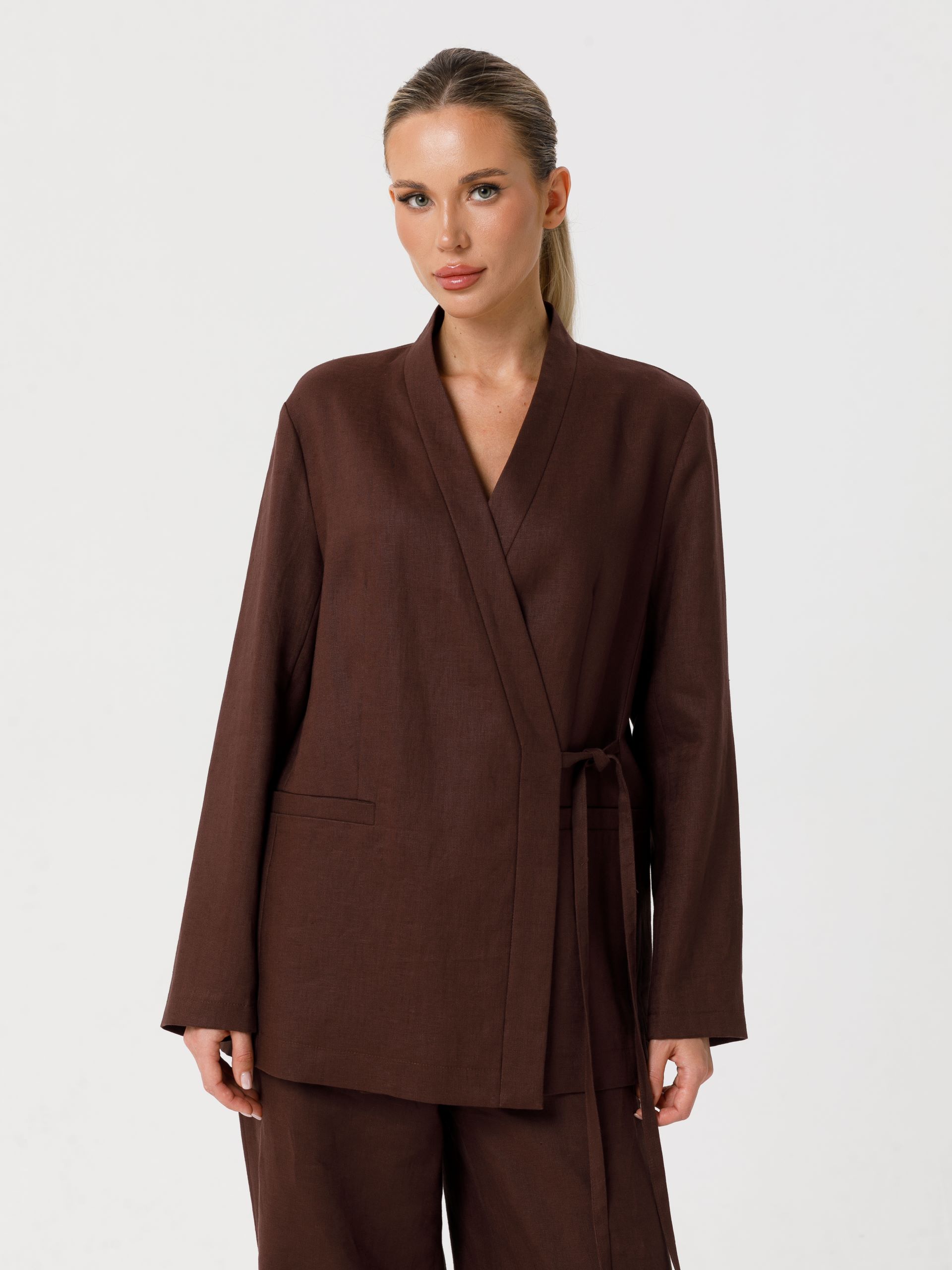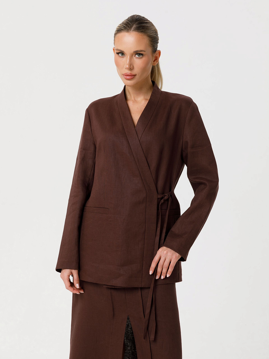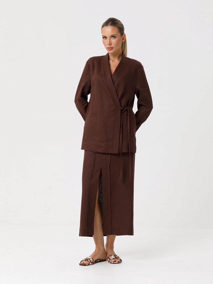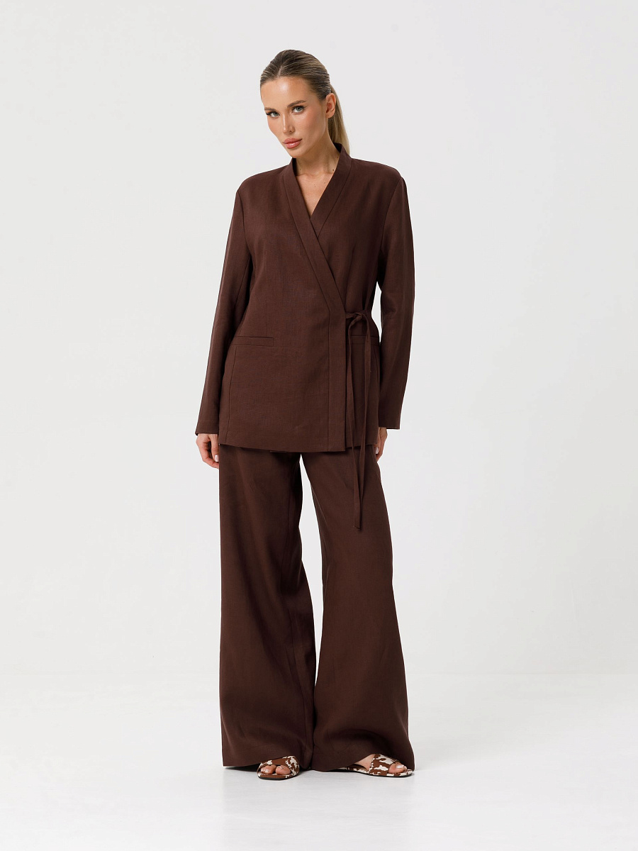Модель прямого силуэта, со спущенным плечом, с рельефами, без боковых швов, с запахом и завязками, без подклада. Спинка со средним швом. Спереди прорезные карманы с листочкой. Вороткик стойка переходит в планку переда.